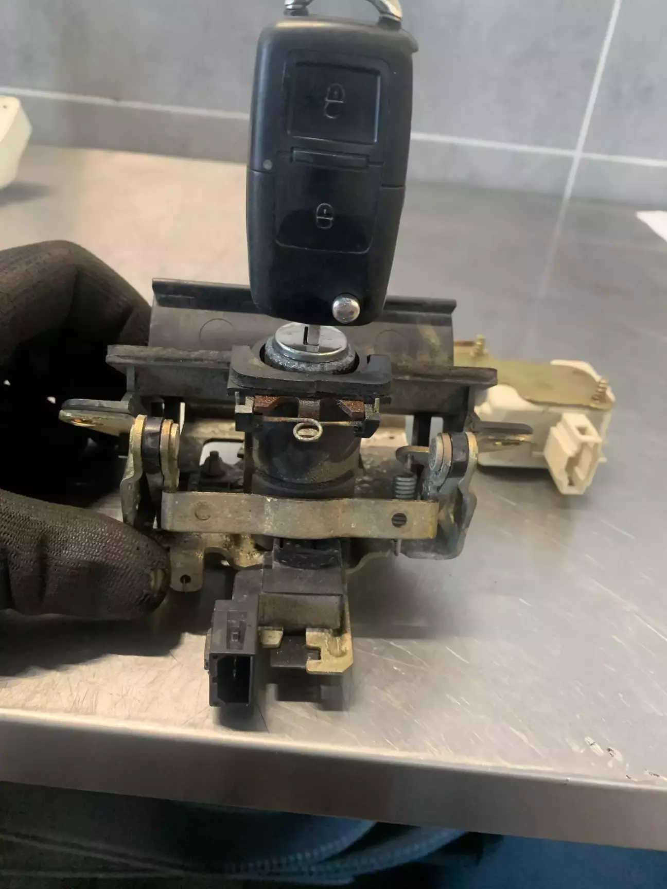 Пару раз зависв замок багажника, не відкривався з пульта. Запхнувши ключ в лечинку він заліз тільки до половини, і з цим треба було щось робити. Спочатку я заливав тути різного роду всім відомі спреї, але результату не дало. Прийшлось знімати замок. Ледь туди його запхнув а він не крутиться, і замочував і підігрівав, ніяк оксл алюмінія так розпер серцевину. Замок делікатний, ні стукнути сильно. І тут до мене прийшла ідея.. З протилежного боку від вставляння ключа я просверлив отвір в пластику Ø 2,5 мм, вставив туди металевий стержень, і на гідравлічному пресі витиснув серединку без ушкоджень.
