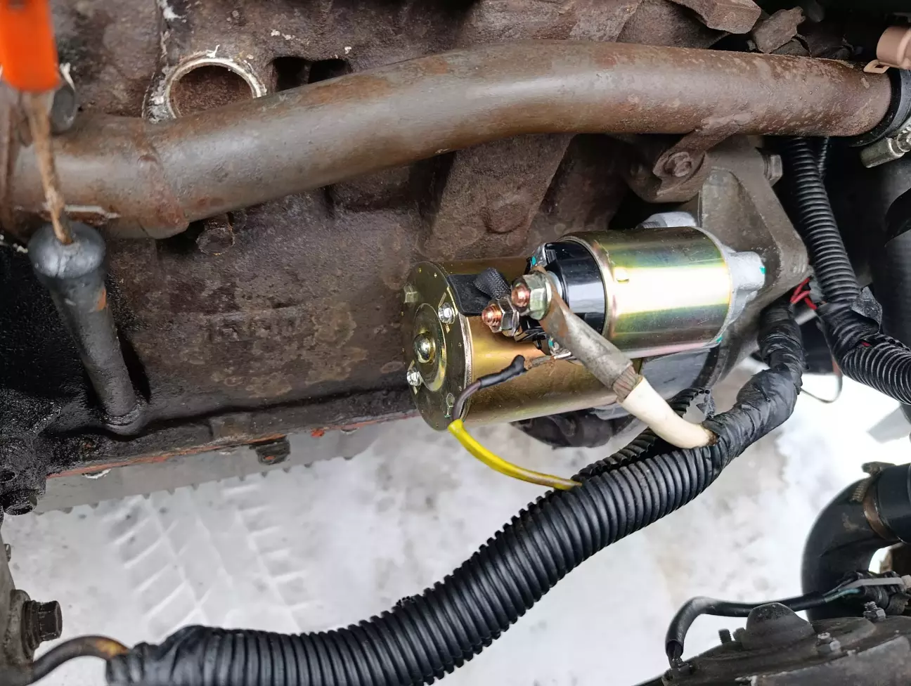 Спочатку збирався стартер ремонтувати. Помив, розібрав, подивився в середину, зібрав назад. Щітки майже стерті. В середині як у вугільній шахті. Прикинув, що навіть при найкращих розкладах ремонт це половина вартості нового стартера. А тут ще й не факт, що запрацює. Силовий плюсовий провід дзвониться на корпус. І не факт, шо проблема в щітковому вузлі. Коротше вирішив купувати новий, а цей відкладемо на пізніше.