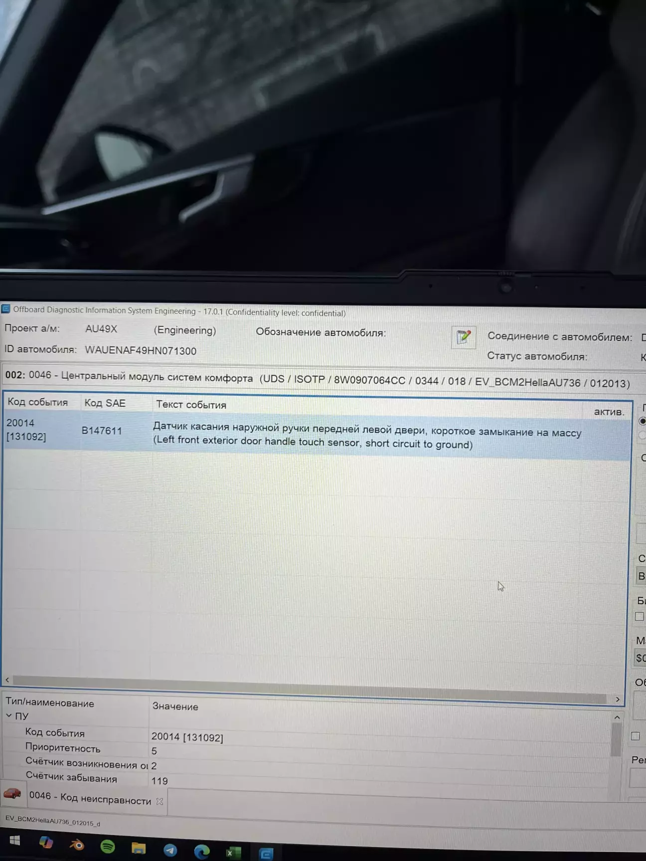 Побачив помилку як на фото, коротке замикання на масу. Розібрав повністю ручку дверей, та карту. Візульно якихось пошкоджень не знайшов, окислення або щось інше. Змінював сам датчик місцями, виявився справним. Якщо переставити задній замість переднього також не працює. Є думка що винуватець волога. Поки температура була менше 0 проблеми не було, як тільки пішов + та постійна волога, вирішив не працювати. Також згадав що раніше, на мийкі самообслуговування авто могло постійно саме замикатись і відмикатись. Зрозуміло звісно в чому причина, але цікава думка можливо в когось було щось подібне щоб полегшити собі роботу. Дякую за відповідь