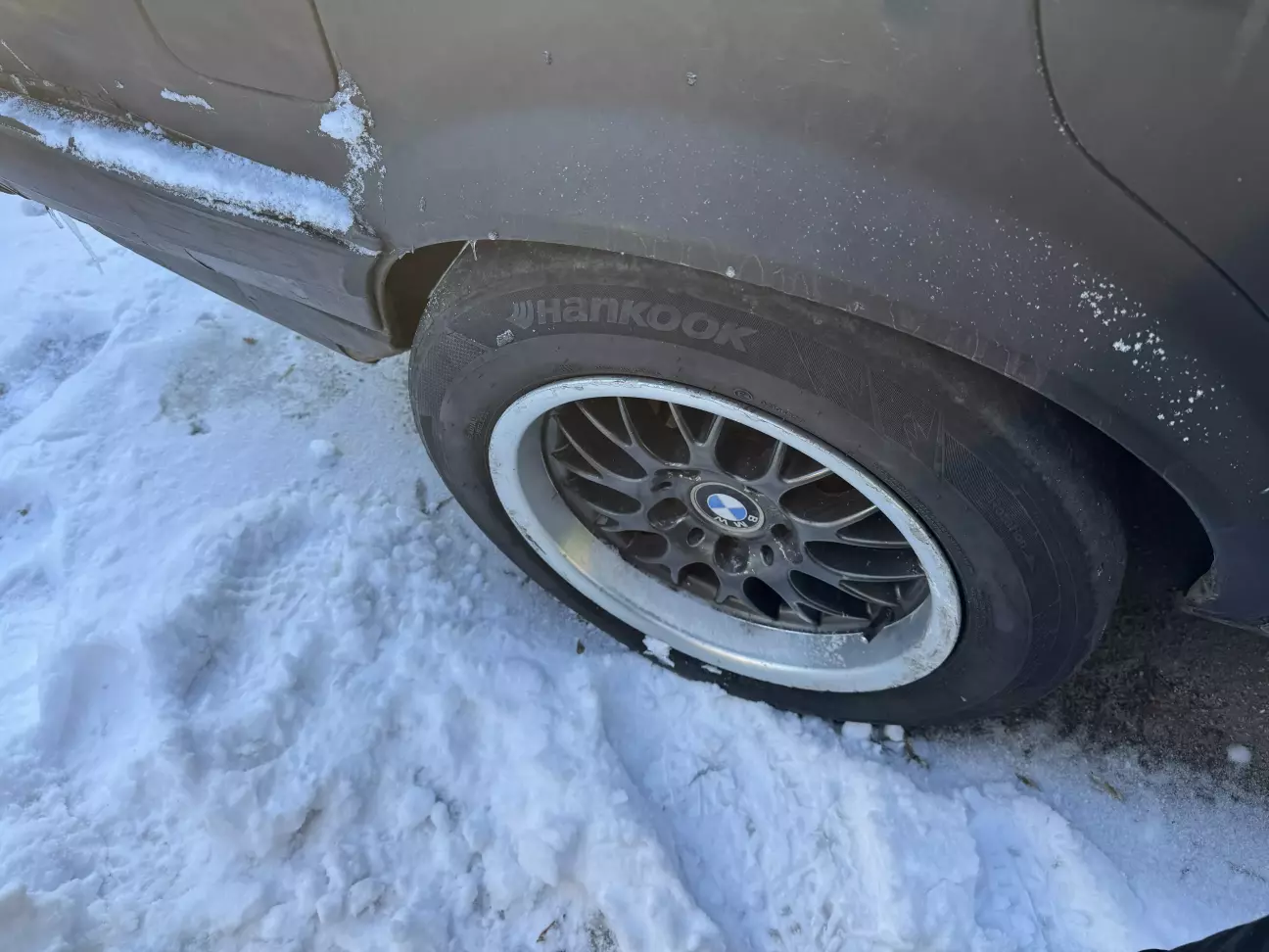 На морді було вирішено використати колеса з е46, хоч і завідома 17-ті колеса досить великі для неї, проте вони б не роззувались як ті що в мене були наявні Борбети 15-ті. Тому що Борбети досить широкі самі по собі а резина на них налазить стрейчем (натягнута доміком). І через це (як мінімум по сухому) - я вже роззув один диск восени. І щоб такого не повторилось і на морозі не морочити собі голови - я вирішив таки поставити 17-ті на морду.