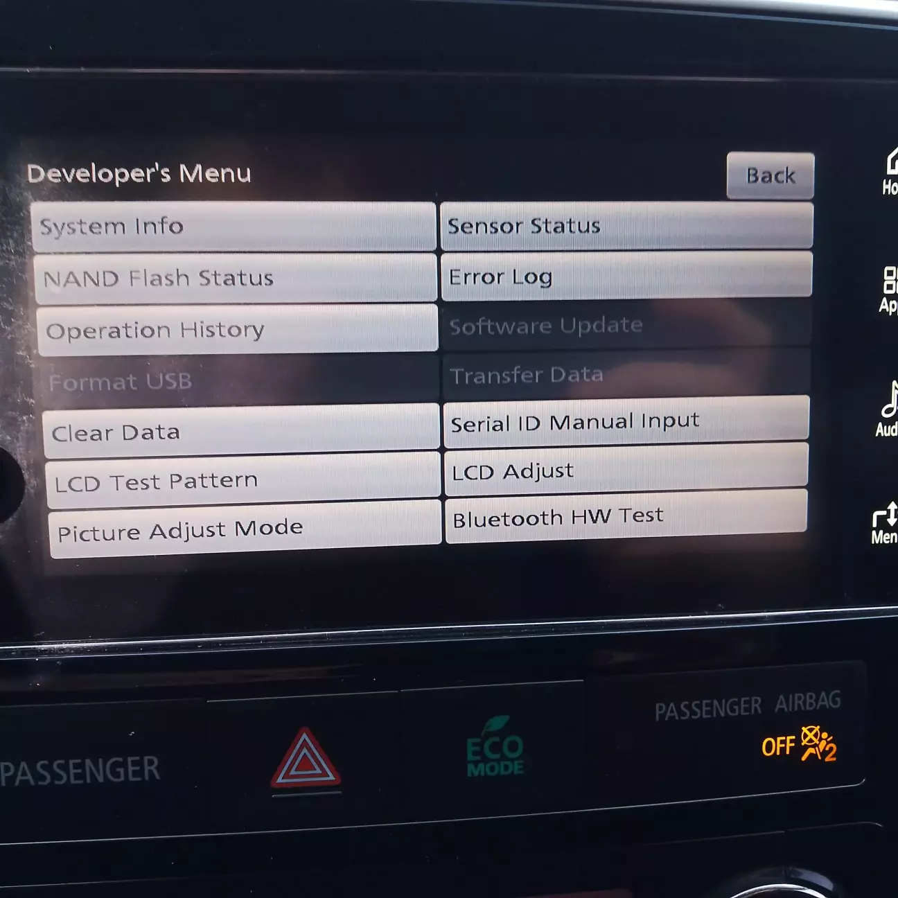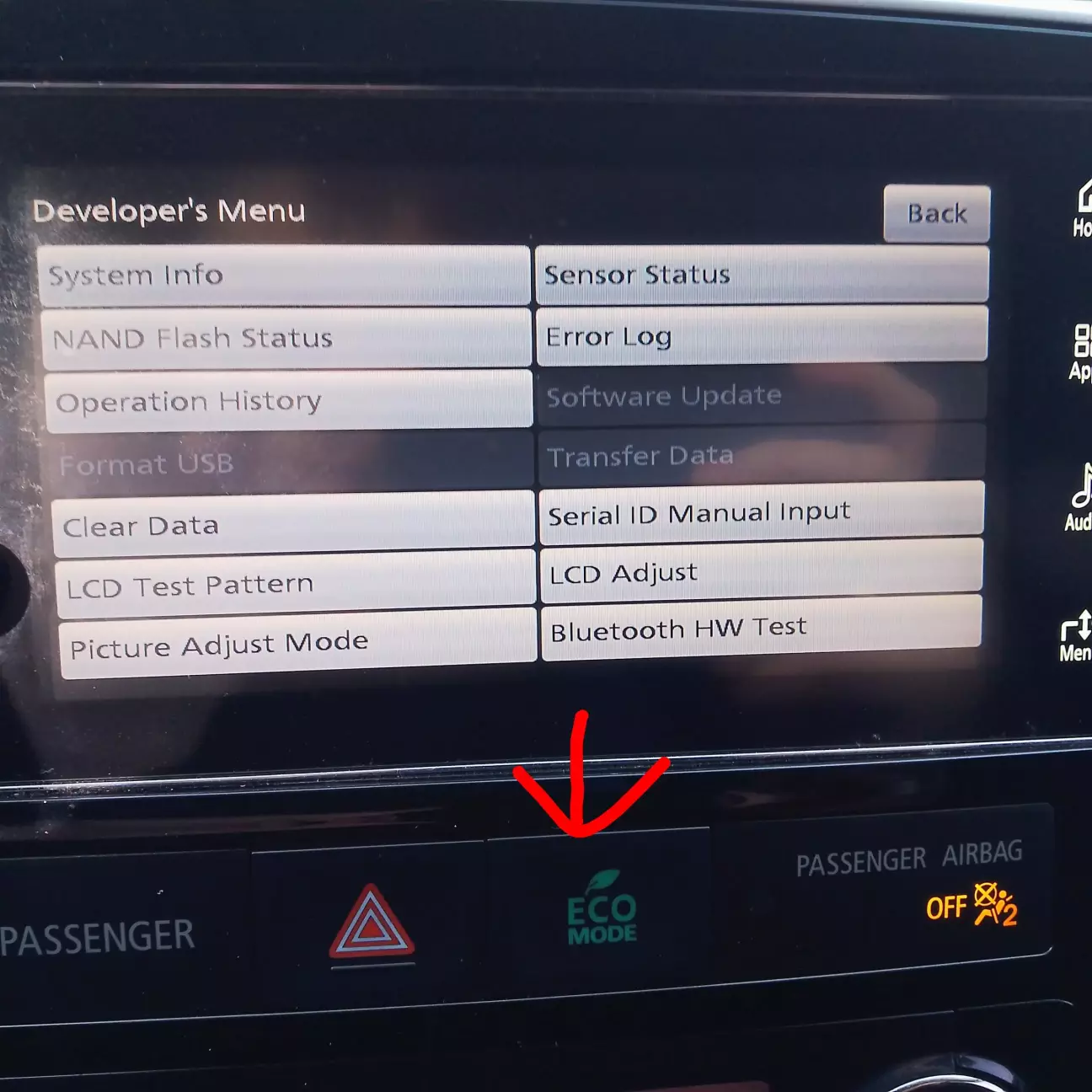 І так попробую максимально описати і показати як попасти в приховане меню. Спочатку потрібно виключити екран, але аудіосистема залишається увімкненою.