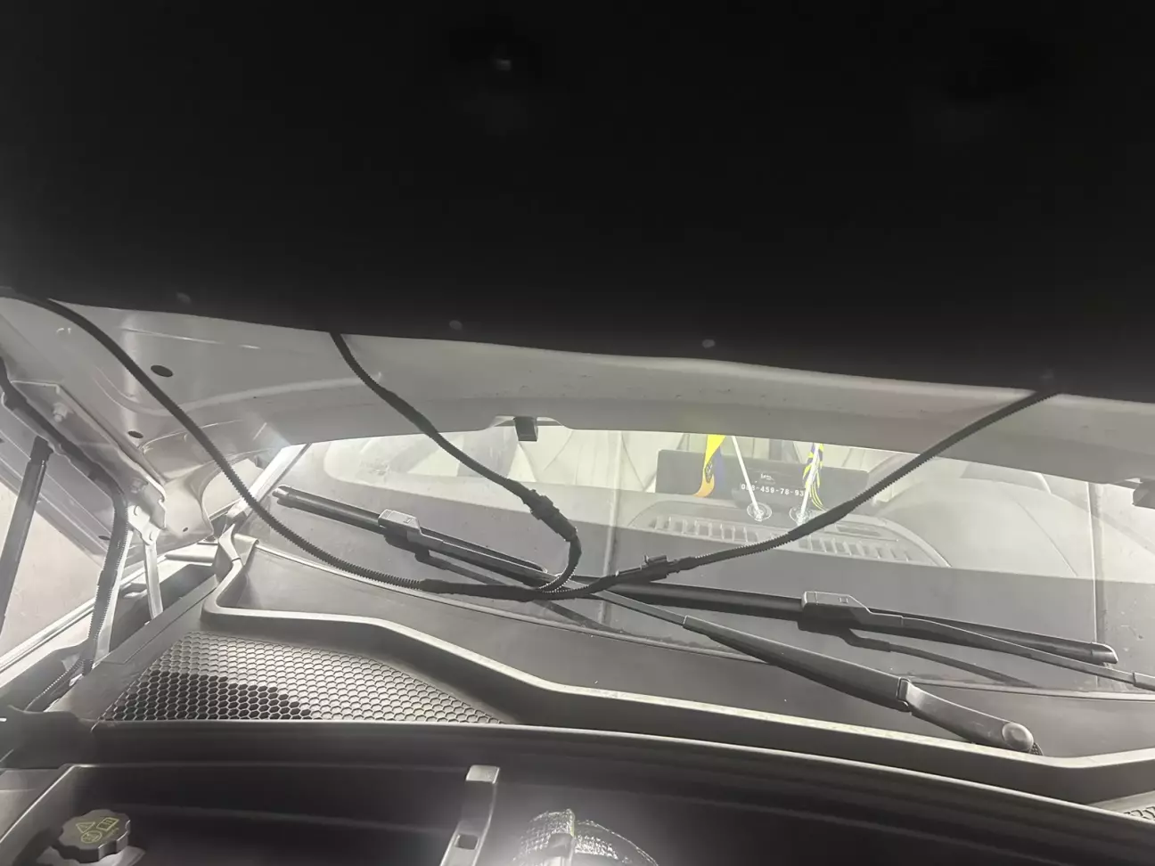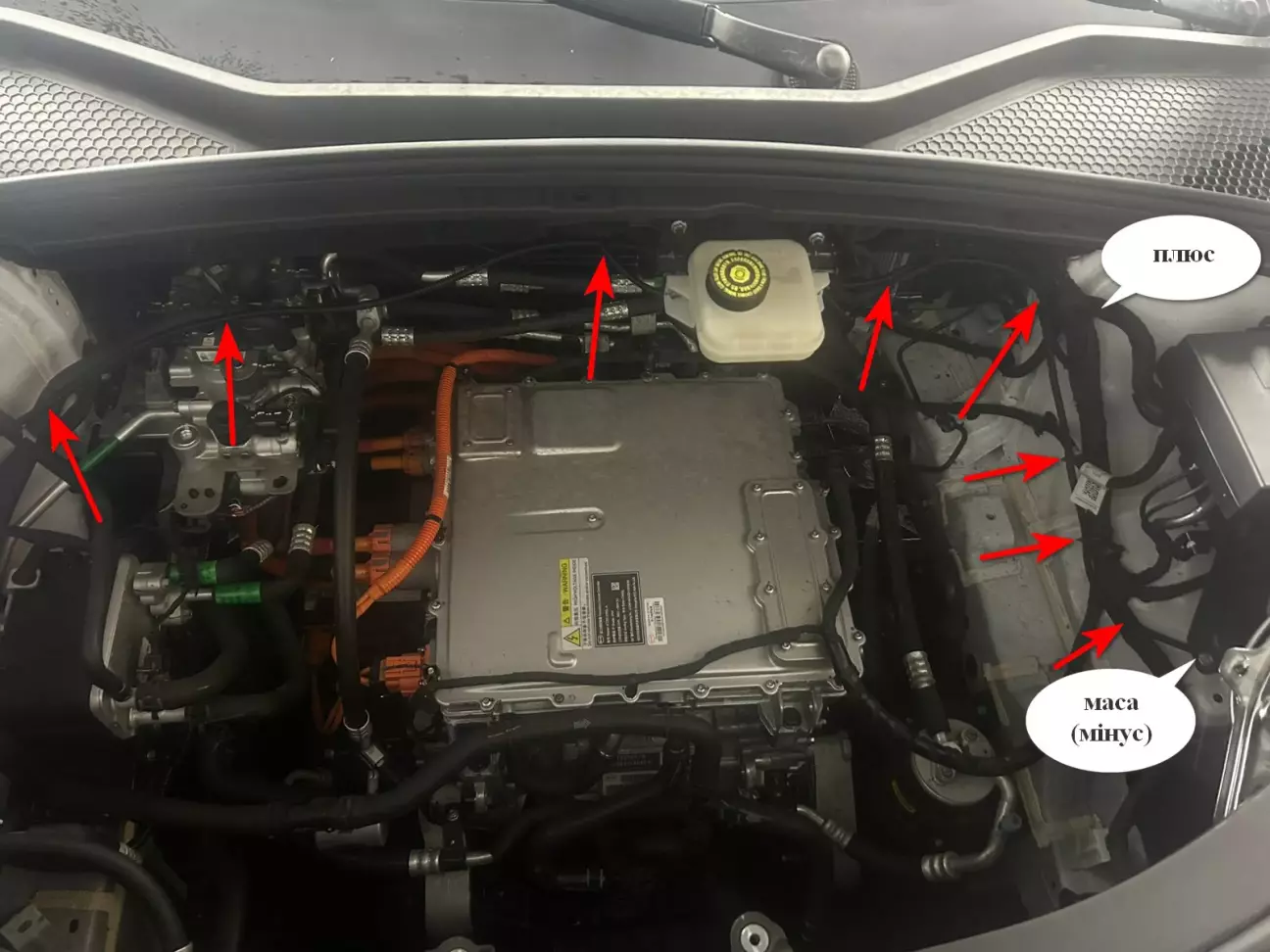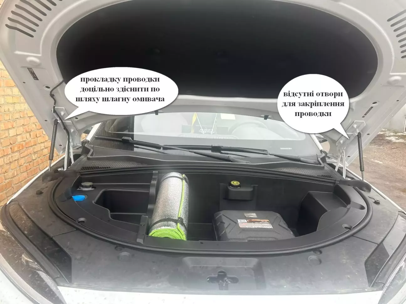 - провід живлення форсунок для надійності потрібно вкласти в гофру і прокласти по передньому відсіку (закріпивши пластиковими стяжками до наявної проводки) до штатного переходу шлангу омивача лобового скла на капот автомобіля з лівої сторони (з правої сторони було б доцільніше для економії довжини проводу, але на кріпленні капоту немає технологічних отворів куди можна було б закріпити дану проводку, а свердлити нові отвори не хотілось);