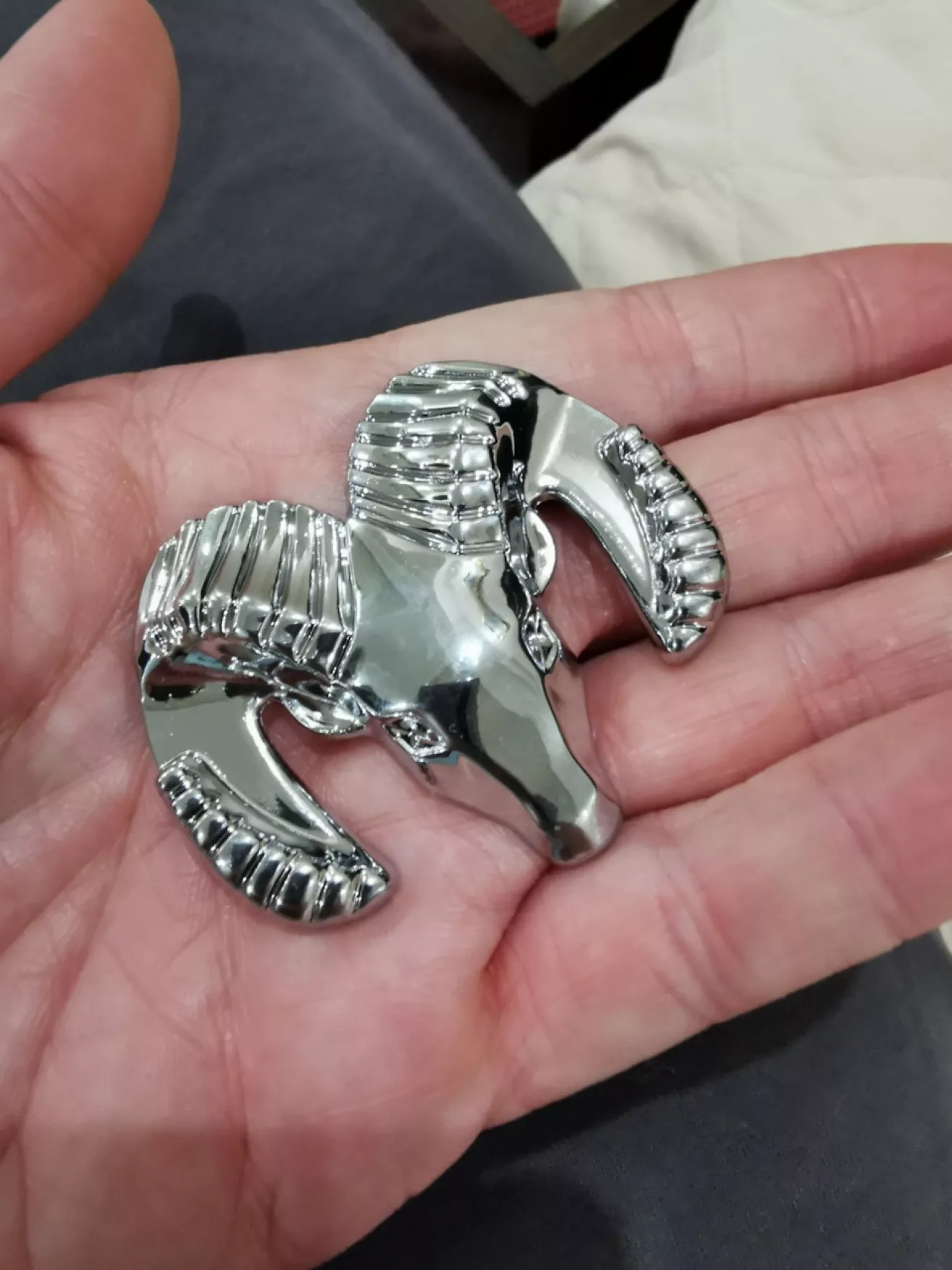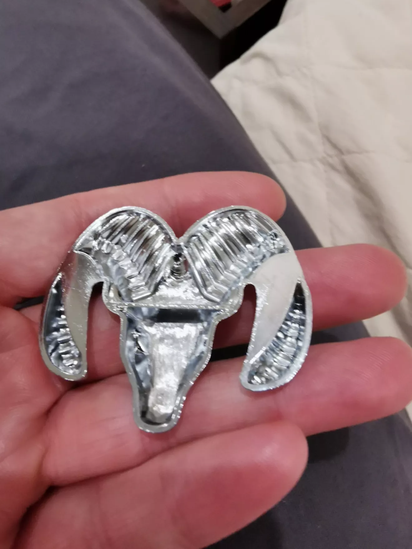 Специально для этого было приобретен объемный значек бараньей головы размером 50*50мм.