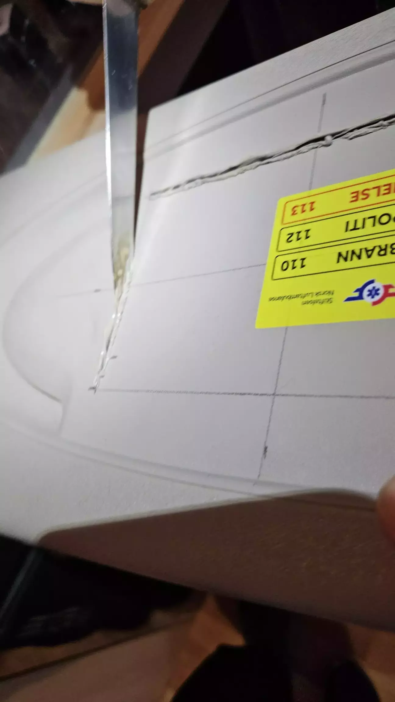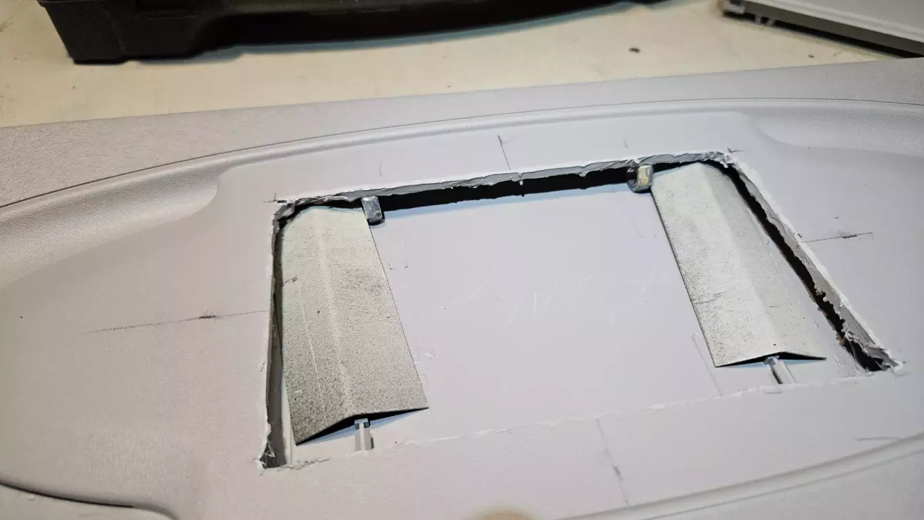 5. Після підгонки вирізу (у місці, де відкривається дзеркальце є увігнутість - її опрацьовано будівельним феном після "підпірки" гайками та прикриття "валочків" металевими пластинами, аби не розплавилися)