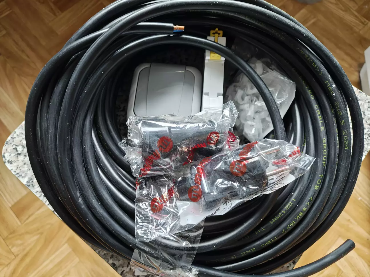 Також було придбано в Епіцентрі 25м кабелю ПВС 2х2.5мм² (+ вилки-розетки) як подовжувач для зарядки з квартири.