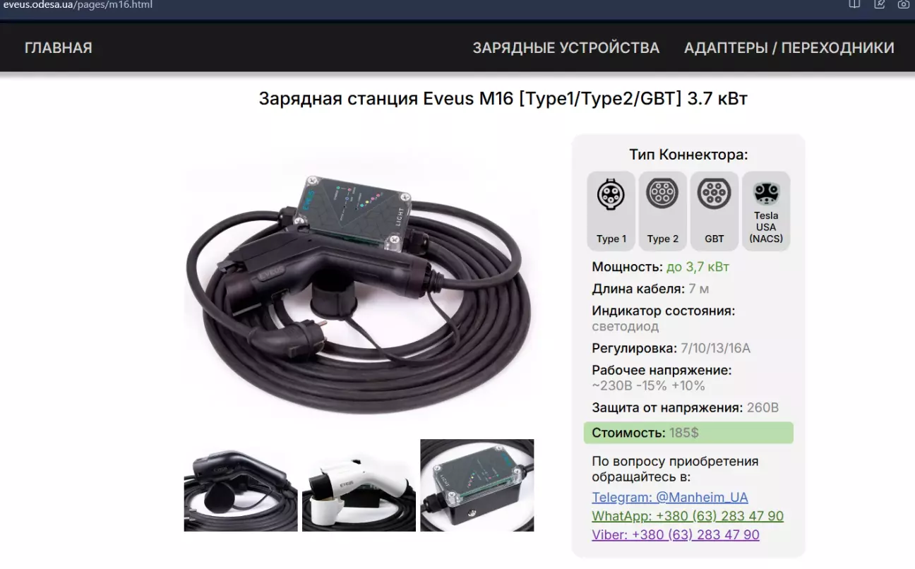 А на заміну вирішено було придбати надійну і перевірену часом зарядну станцію відчизняного виробництва Eveus M16 Type2 3.7 кВт для електромобілів з регулюванням сили струму [7/10/13/16А] + вбудоване дистанційне керування нею через Wi-Fi що дуже зручно. Довжина кабелю 7м. На ринку одна з найякісніших і перевірених часом, тому рекомендую. Сайт виробника.