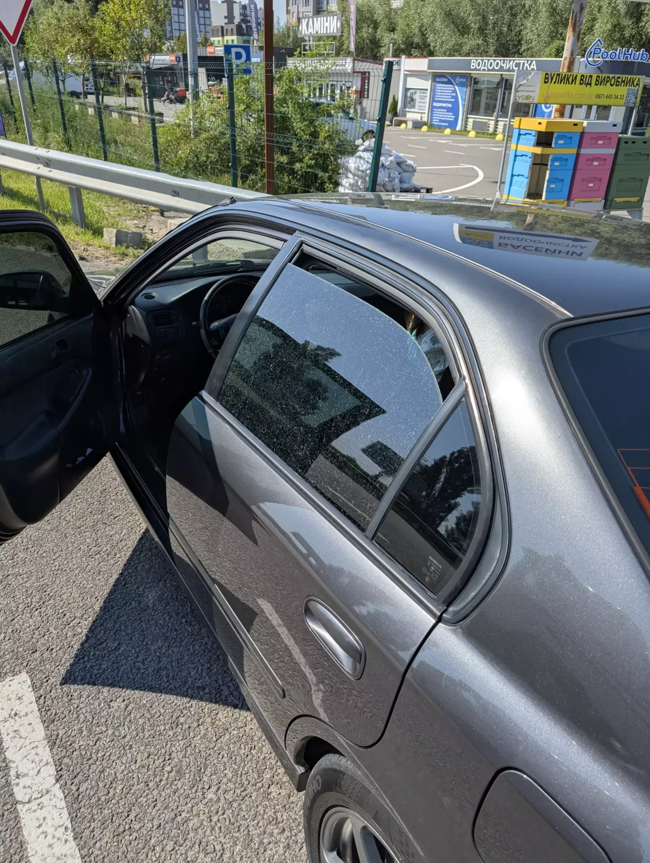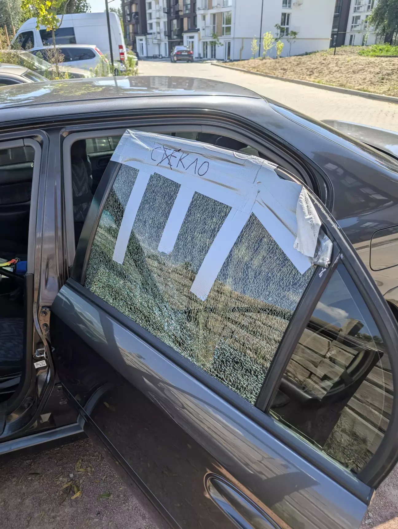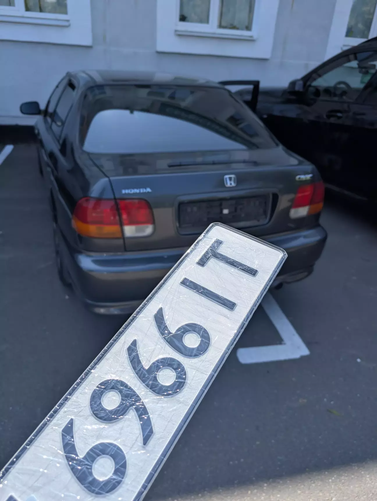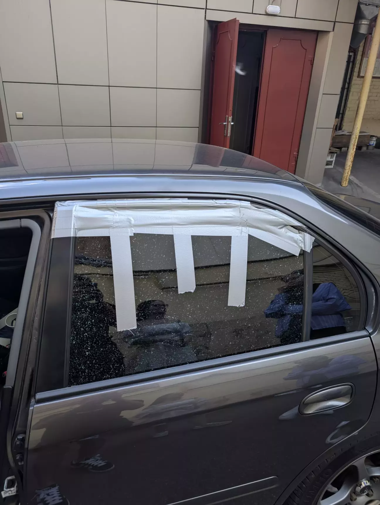 Получил номера, довольный. Осталось только придумать что с стеклом делать, кинул клич в барахолку но тишина, поехал на блокбастер там была движуха, пока стоял там решил хоть как то залепить окно, из подручных средств был только армированный скотч