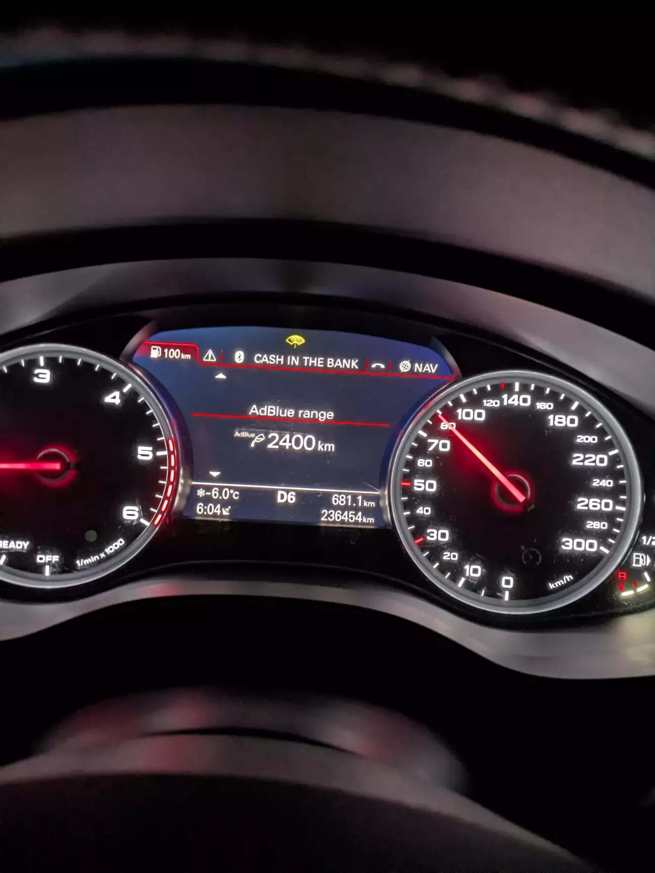 В Audi в БК немає відомостей про стан Adblue, але авто сповістить вас при залишку на 2400км, і тоді в меню БК появиться сторінка і відомості про залишок км Adblue. Якщо не долити, і виїїздити 2400, є ризик не завести авто. Сповіщення про це появляється щоразу при заводці авто і на екрані БК вмикається саме інформація по AdBlue. Сьогодні долив до повного, при залишку на 2300км влізло практично 15л., не знаю на скільки там бак, я так розумію орієнтовно 20л.