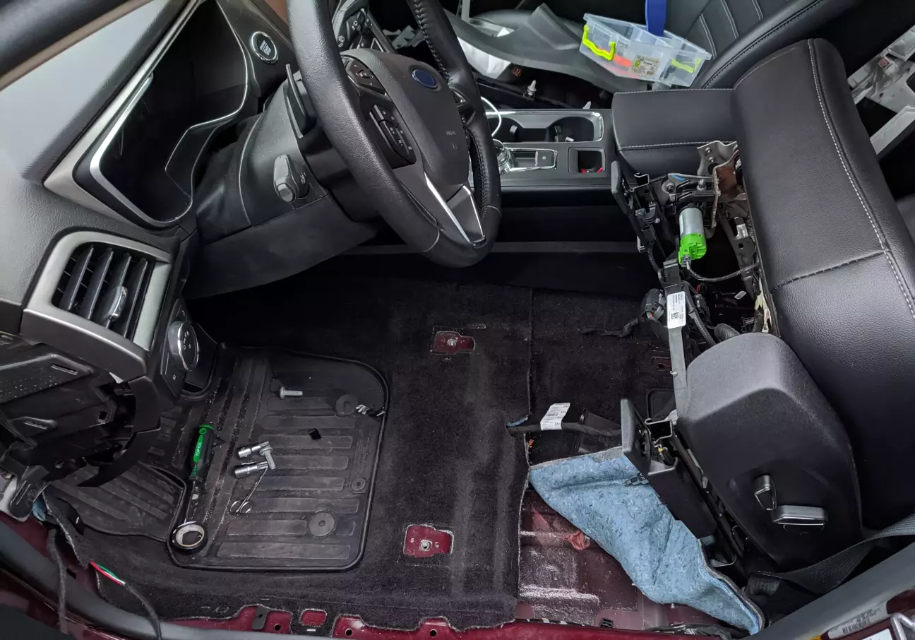 Прокласти проводку вирішив біля заводської коси, тому довелося трохи розібрати салон по водійській стороні, ну і відкрутити сидіння, щоб відігнути ковролін.