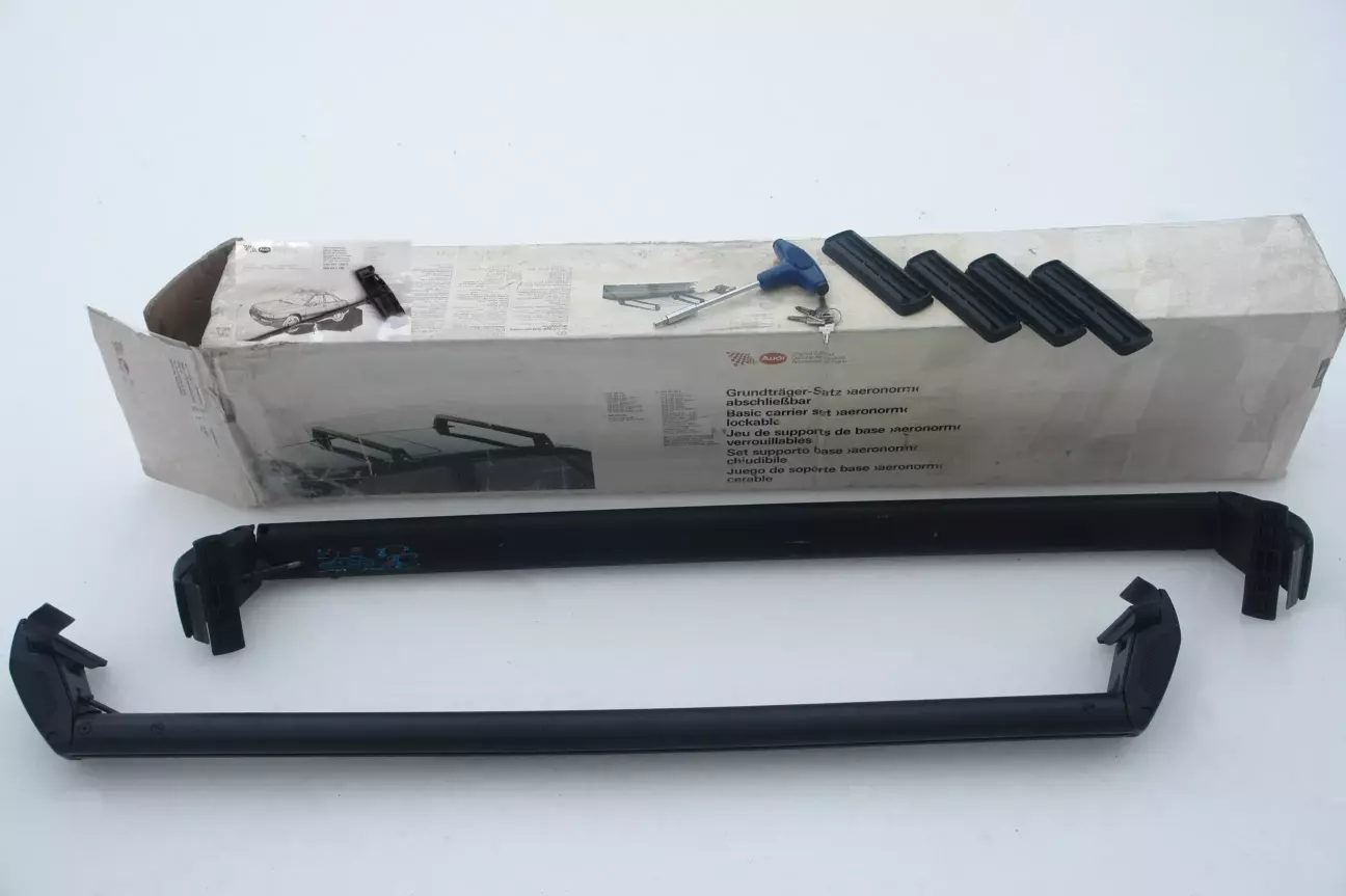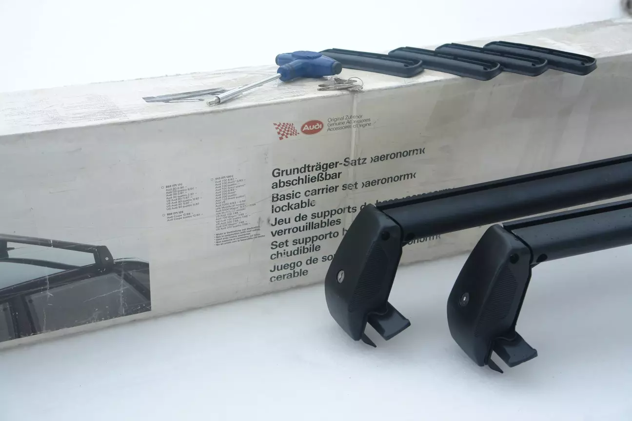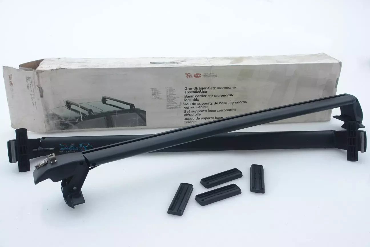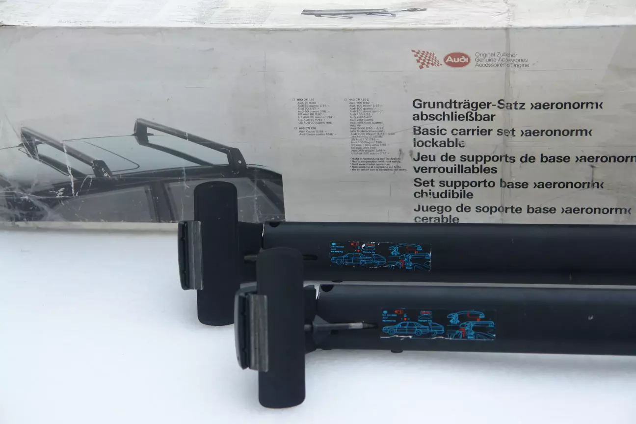 Но коробка-то без тройной ZZZ оцинковки, а состояние ее и ее содержимого просто потрясающее. К примеру, на обратной стороне поперечин сохранились наклейки со схемой установки, а также: момент затяжки (9Нм), собственный вес рельс (4кг), максимально допустимый вес нагрузки (75 кг), перечень моделей для которых предусмотрены – 100, 200 и 5000. Что примечательно, в списке отсутствует соплатформенная Audi V8 – видимо по статусу не положено ездить ей с рогами на крыше
