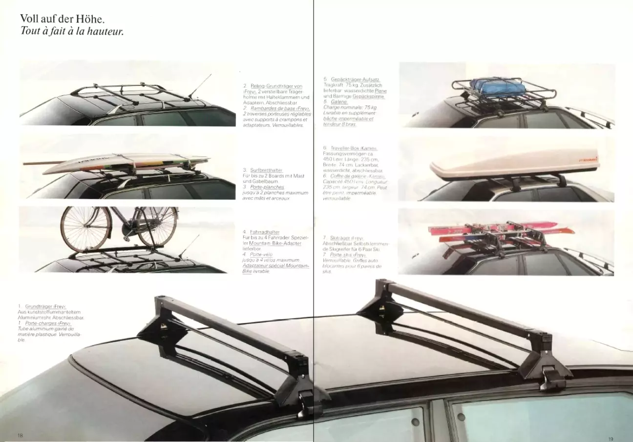 Из каталогов и буклетов удалось выяснить, что выпускались еще и дополнительные девайсы к этим поперечинам для перевозки велосипедов, сёрфа, лыж и прочего, а также для монтажа грузовых аэробоксов на крышу автомобиля: