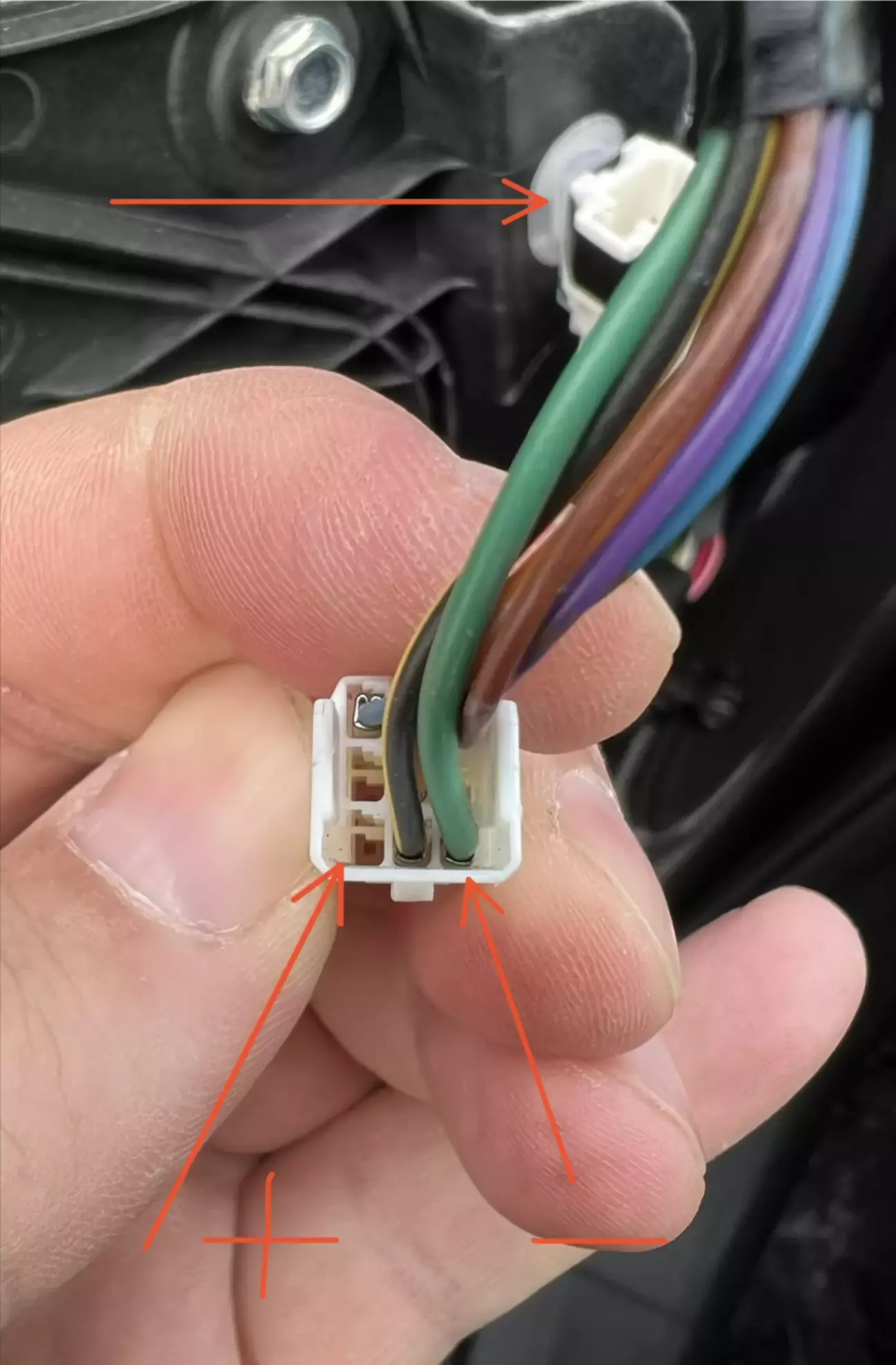 1. Перевірити наявність проводу живлення (піна) в розʼємі на двері, до якого підключається фішка дзеркала. Для цілого потрібно зняти карту двері ліва/права, відʼєднати фішку дзеркала, на розʼємі який на двері треба знайти мультіметром плюсовий пін (+провід) на якому зʼявляється живлення при вмиканні кнопки підігріву вікна/дзеркал.