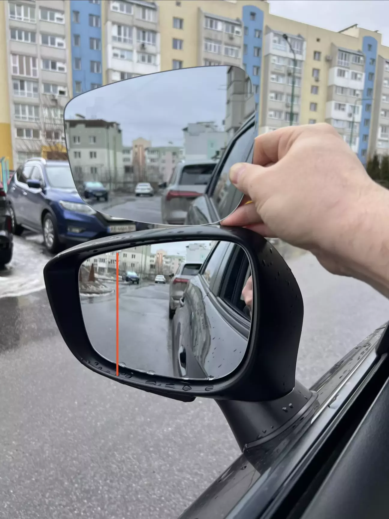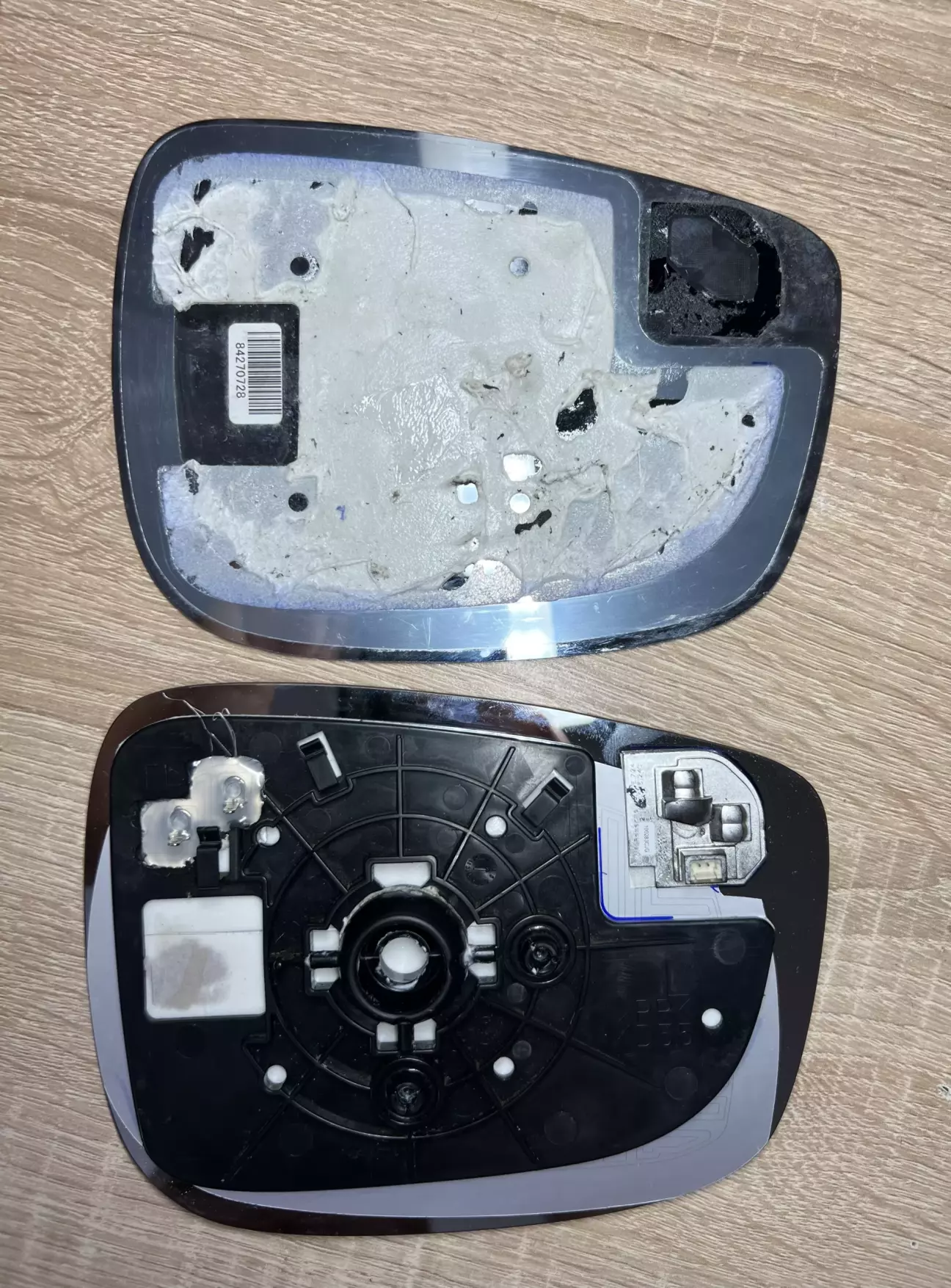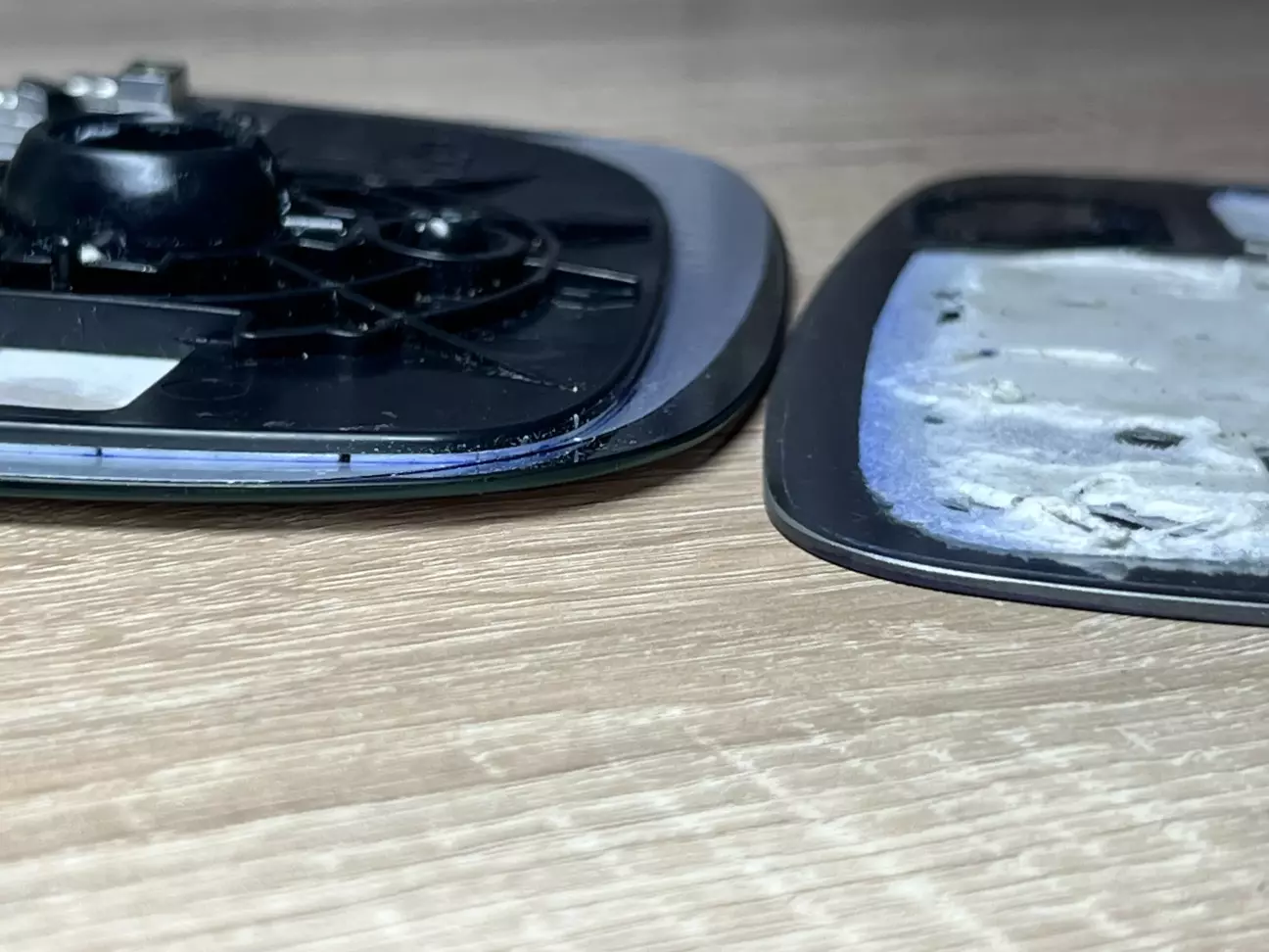 Тож було прийняте саме оптимальне рішення по якості та ціні, це зробити на замовлення дзеркальний елемент з гравіруванням під індикатор сліпих зон, приклеїти на нього підігрів, зверху переклеїти своє OEM кріплення та свій OEM індикатор сліпих зон. Знайшов в Києві хлопців які займається виготовленням автодзеркал, відправив їм свій водійський дзеркальний елемент для виготовлення дублікату з сферичним дзеркалом, як в європейських машинах).
