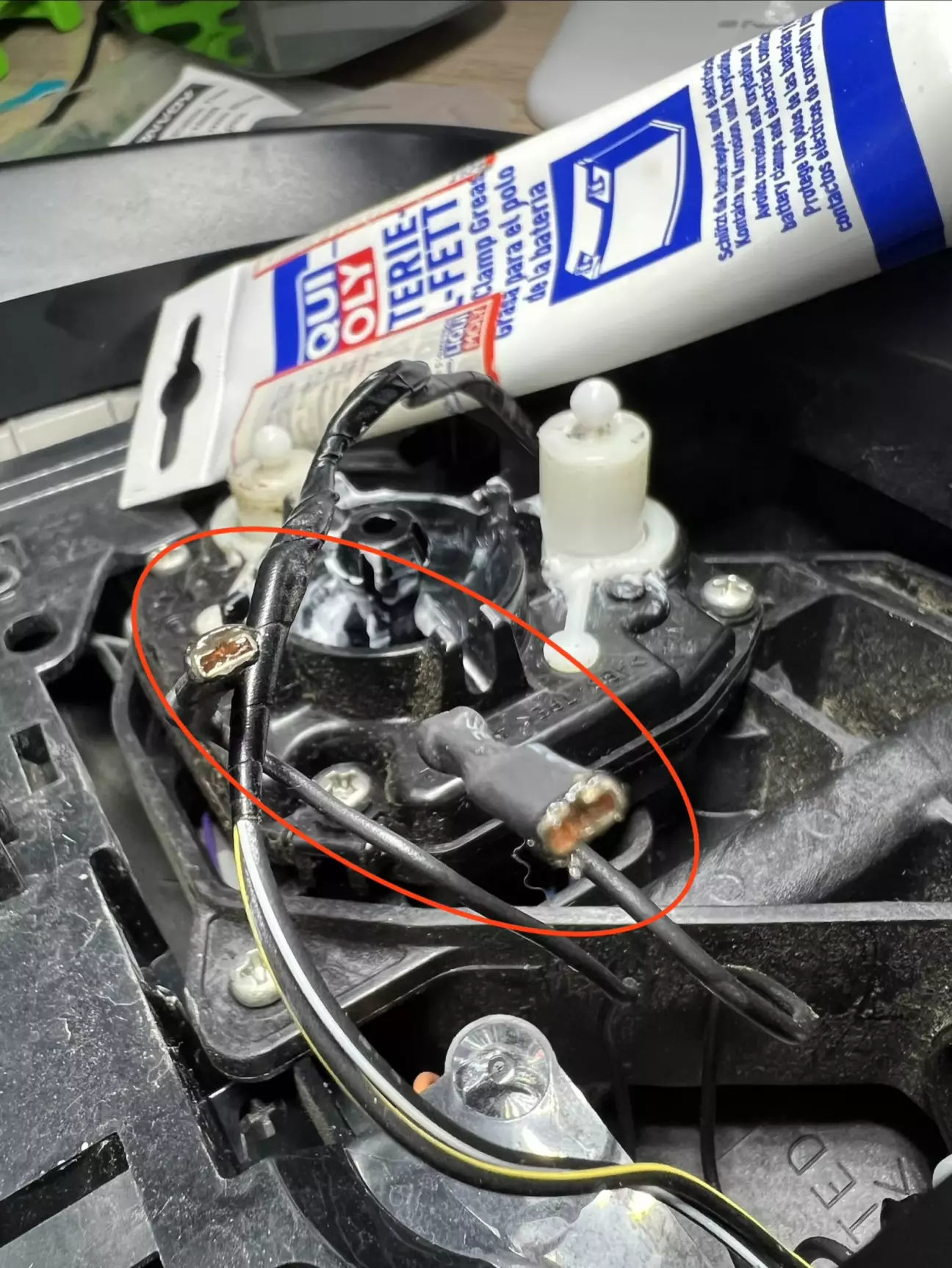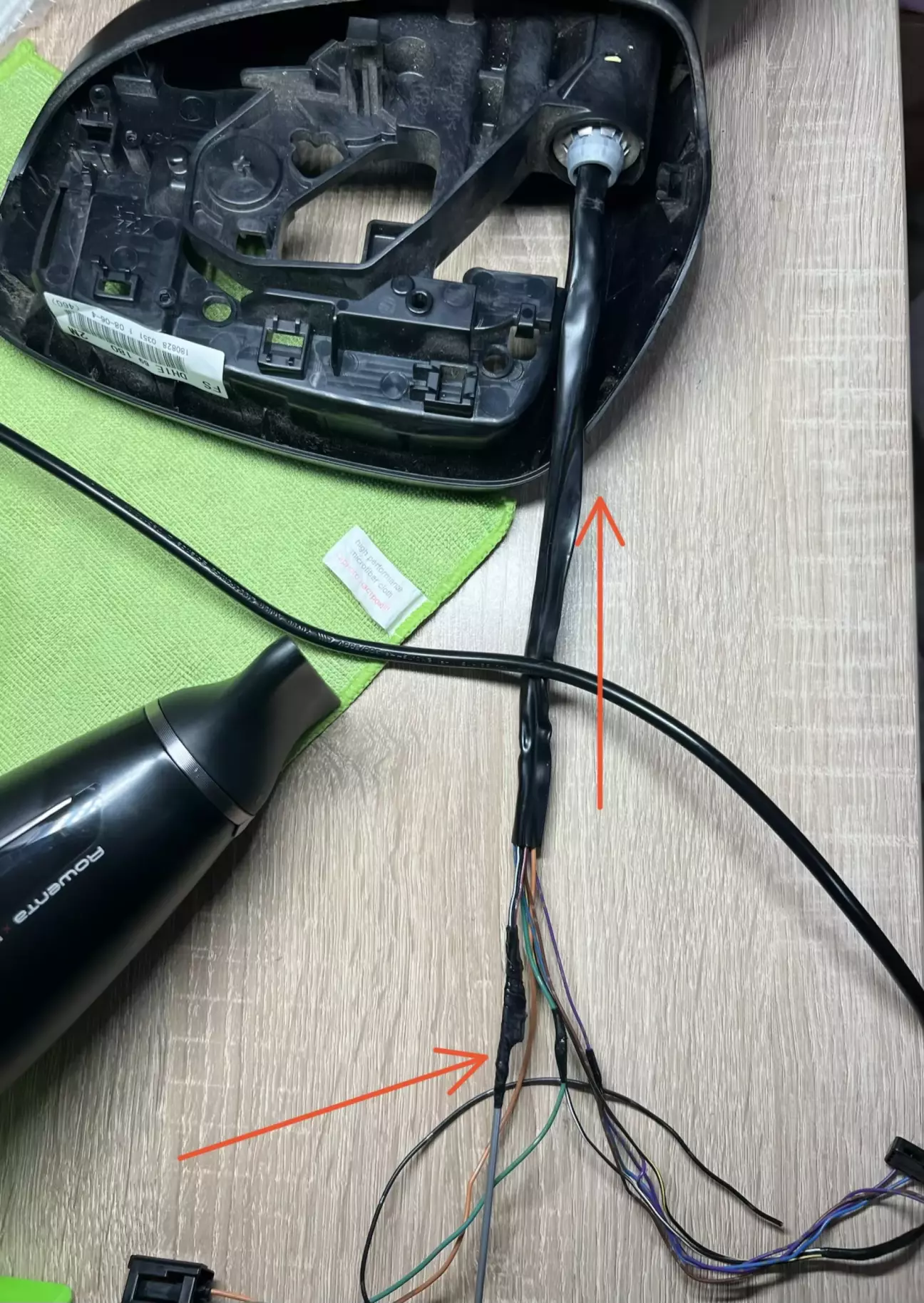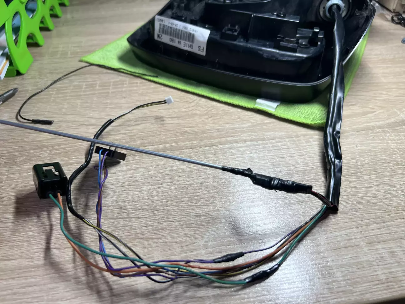 Одразу почав з лівого дзеркала, яке треба зняти та розібрати, протягнути плюсовий провід від дзеркального елемента до фішки дзеркала та запінувати. Потім в середині дзеркала приєднатись до мінусового (зеленого) проводу який йде на фішку поворотника, та протягнути мінусовий провід до дзеркального елемента.