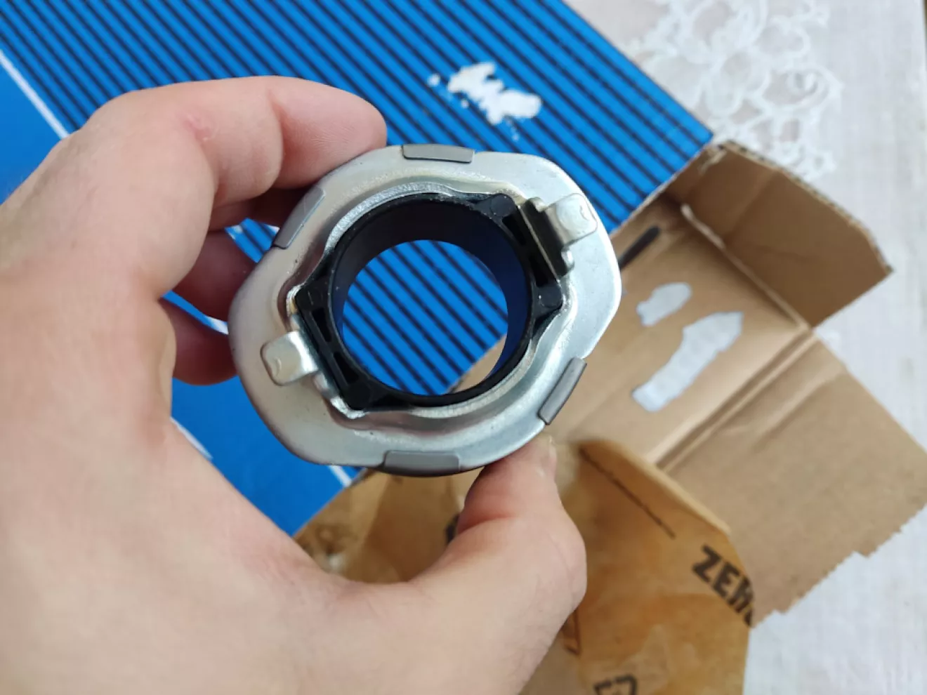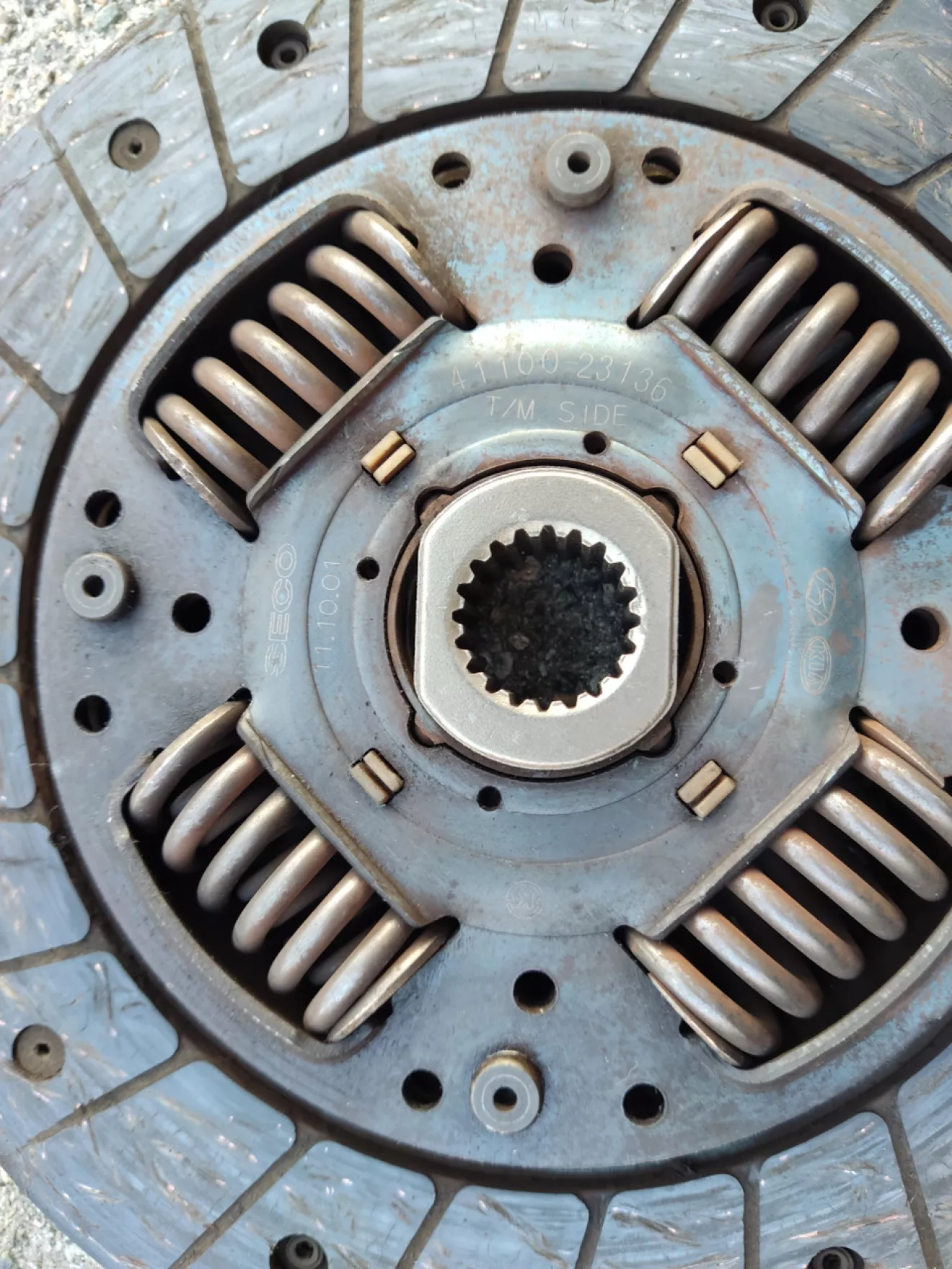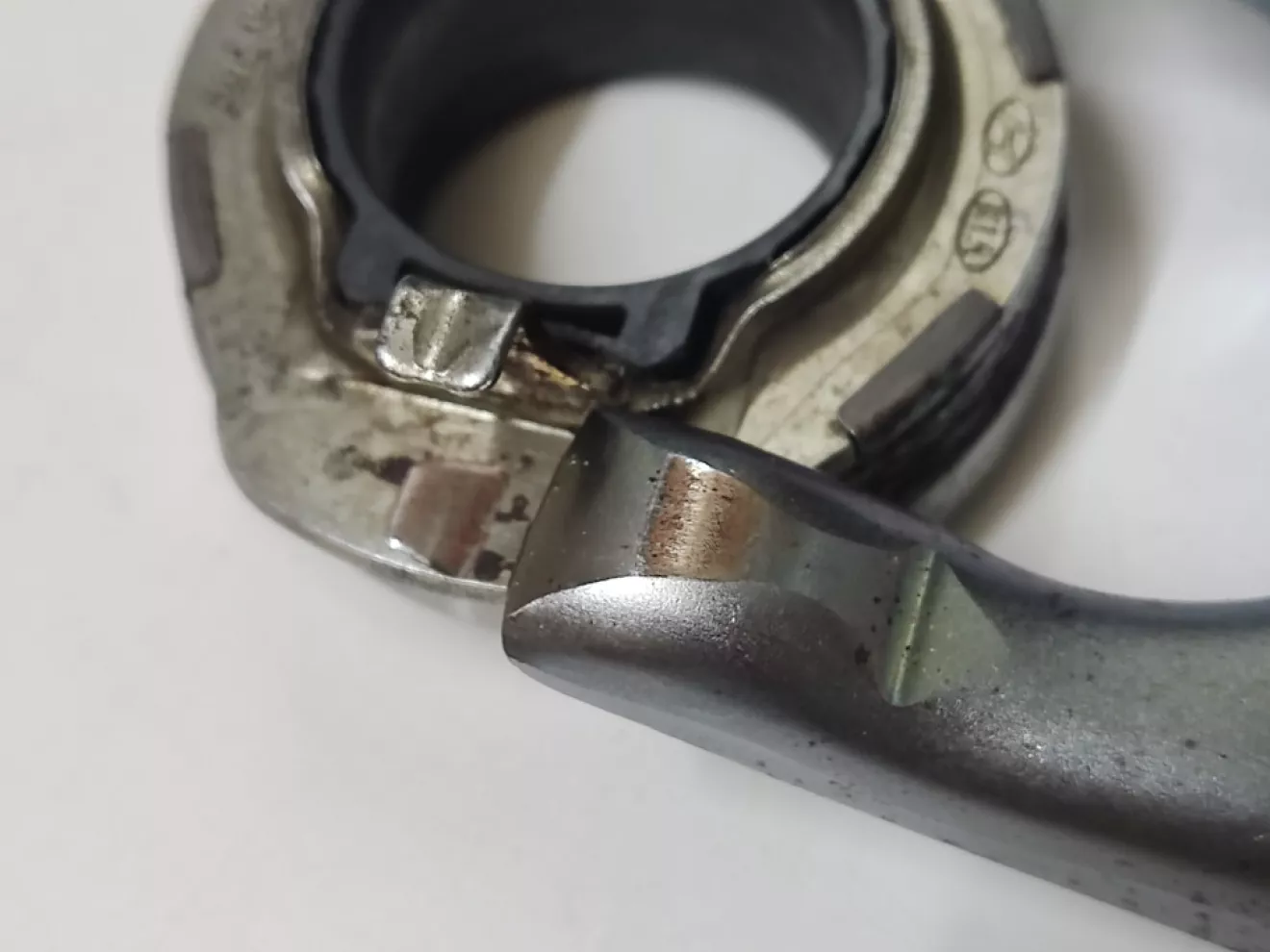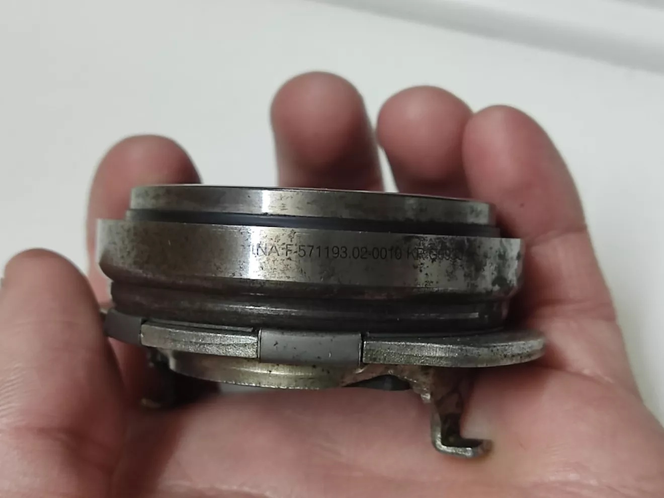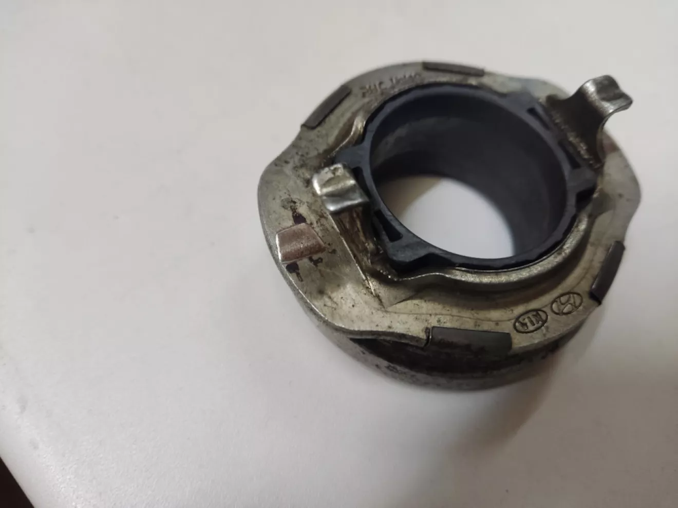 Выжимной подшипник 41421-32000, клеймо на нем Hyundai Kia PHC Valeo, сбоку лазерная насечка INA 571193020010, в общем сборная солянка))) Полностью металлический, крутится от руки легко, но на сухую, смазки внутри не осталось за 13 лет. + Есть небольшая выработка на плоскости подшипника от ушек вилки и на самой вилке немного.