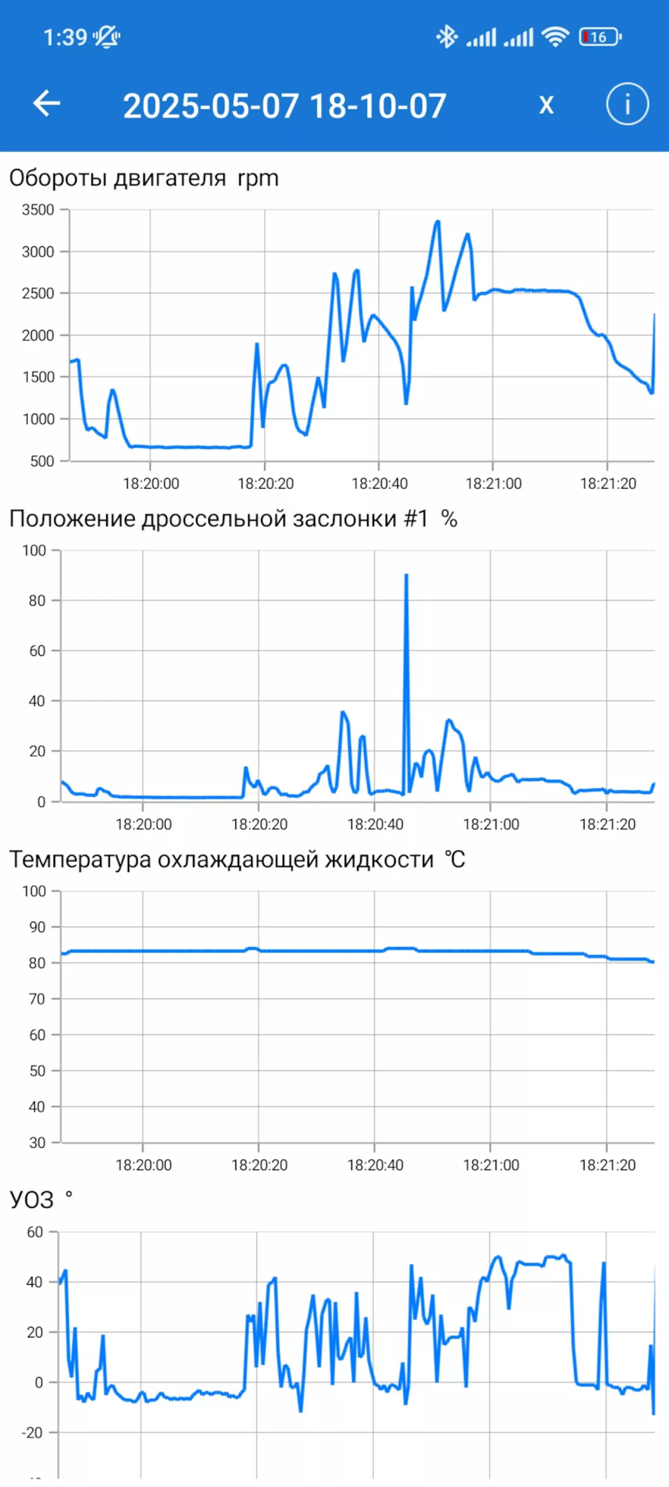 Что имеем. Машина едет бодро, холостой ровный, все параметры хорошие (впуск 30-31 кПа, синусоида первой лямбды 0.2-0.75В, второй около 0.6-0.7В, фактическое положение распреда пляшет от заданного на 0.1-0.3 градуса, то есть метки по идее на месте, ДК +3…+5%, время впрыска 2.46 мс), но УОЗ на ХХ=660 об/мин на прогретой около 0…-3, но иногда в -5…-7 заваливается, то есть поздний.