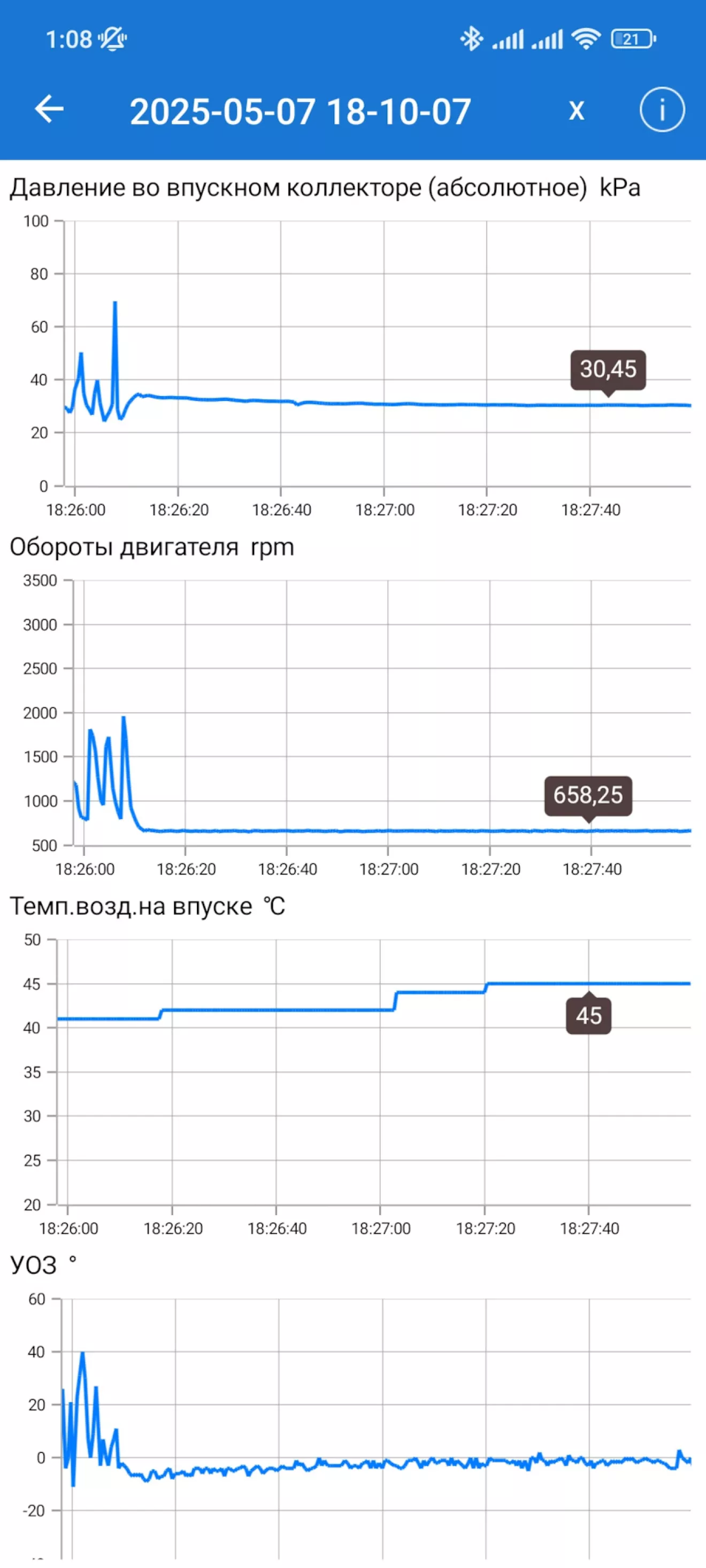 Сбрасываю адаптацию — УОЗ становится каким и должен быть +8-12 градусов для наших моторов и давление на впуске при тех же оборотах падает на 2-3 кПа до 27-28, при этом время впрыска 1.64 мс, но проходит 2-3 минуты, блок набирает инфу, сваливает угол опять в около нулевой/отрицательный и повышается давление впуска до прежних значений.