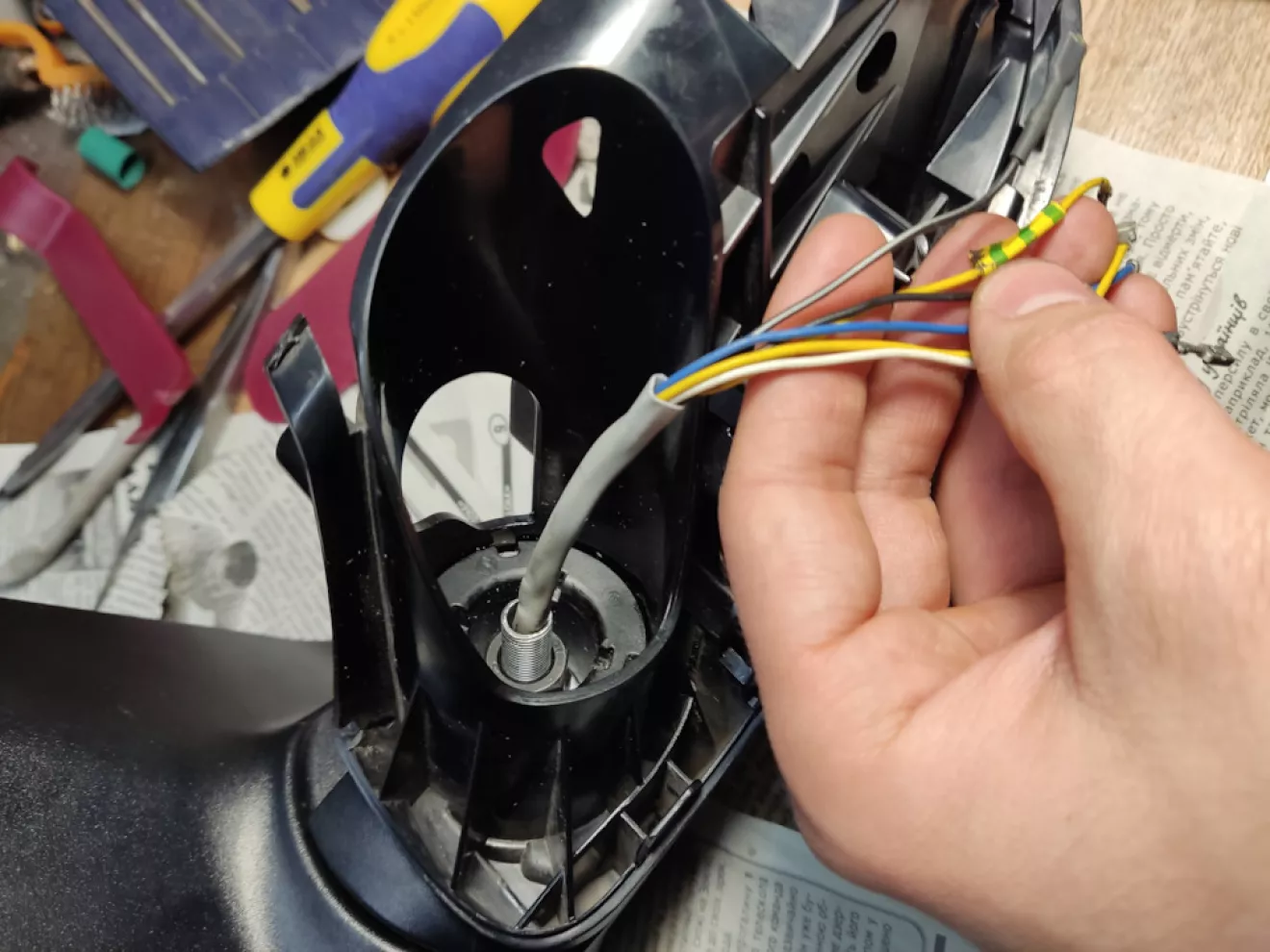 Ранее писал, что при попытке сложить зеркало в первый раз сам того не понял как оно оказалось в руках — сломались 3 фиксатора, которые держат шлицы поворотной втулки и оно повисло на проводе. Всё потому что был приложен неправильный вектор усилия да ещё и одной рукой.