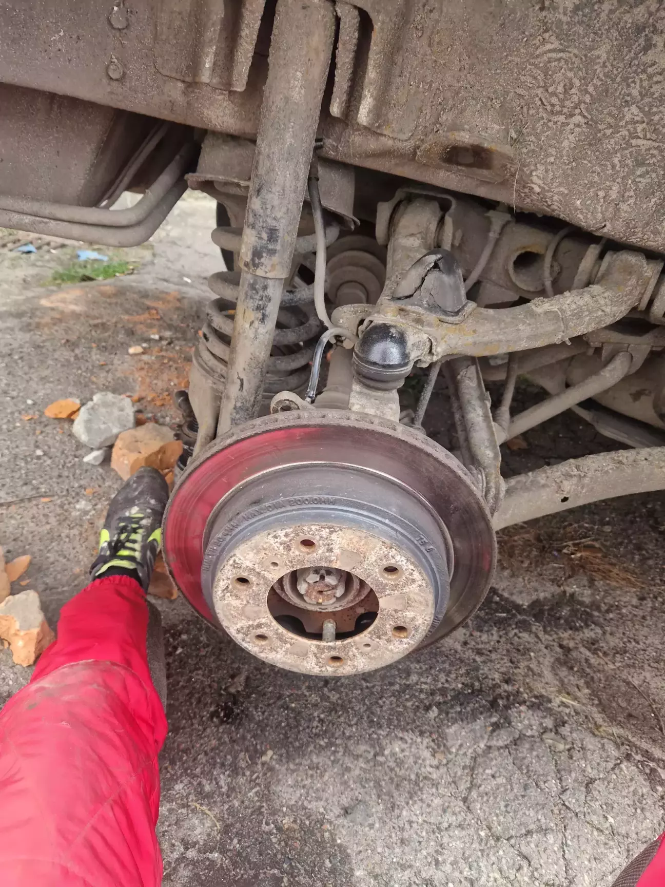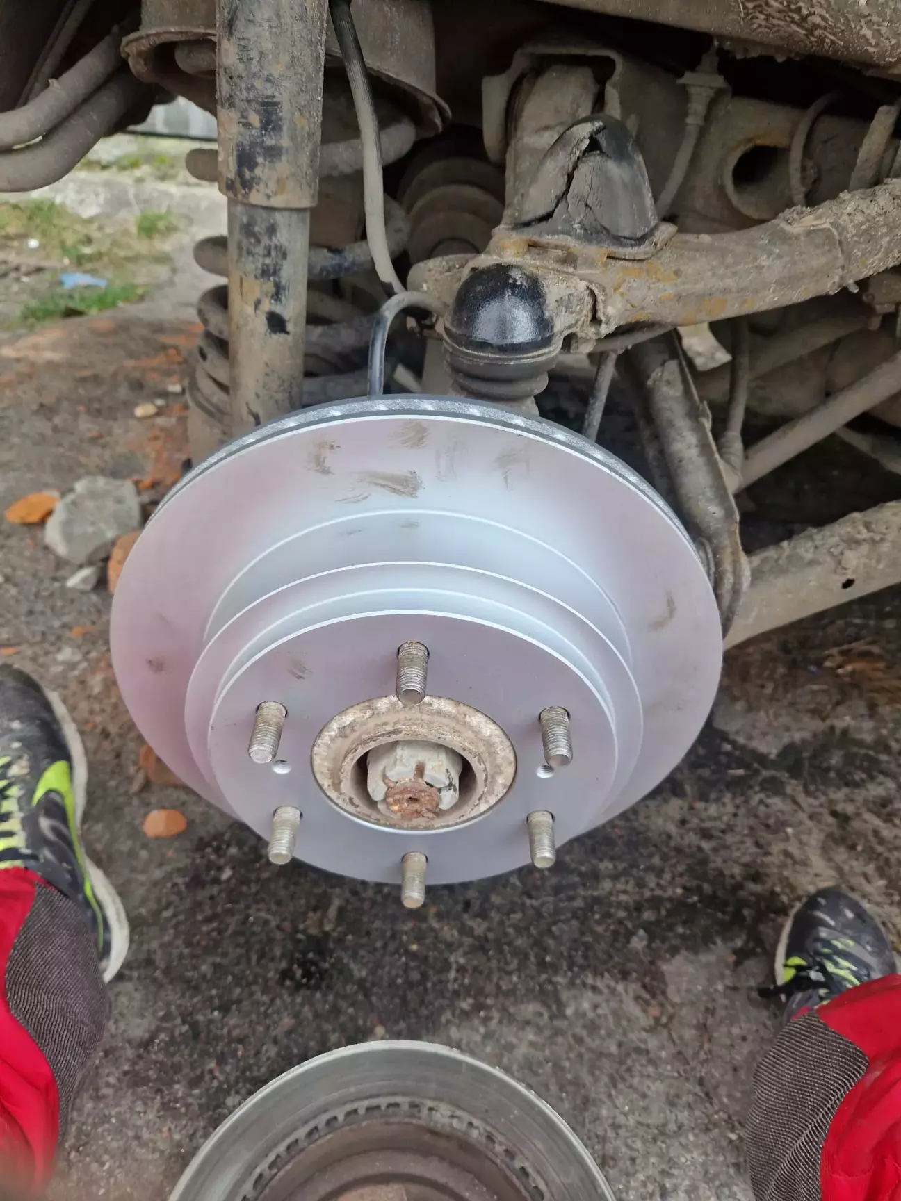 Оглянувши колодки і диски, зрозумів. Міняю всі диски і колодки. Колодки ручного гальма ще послужать.