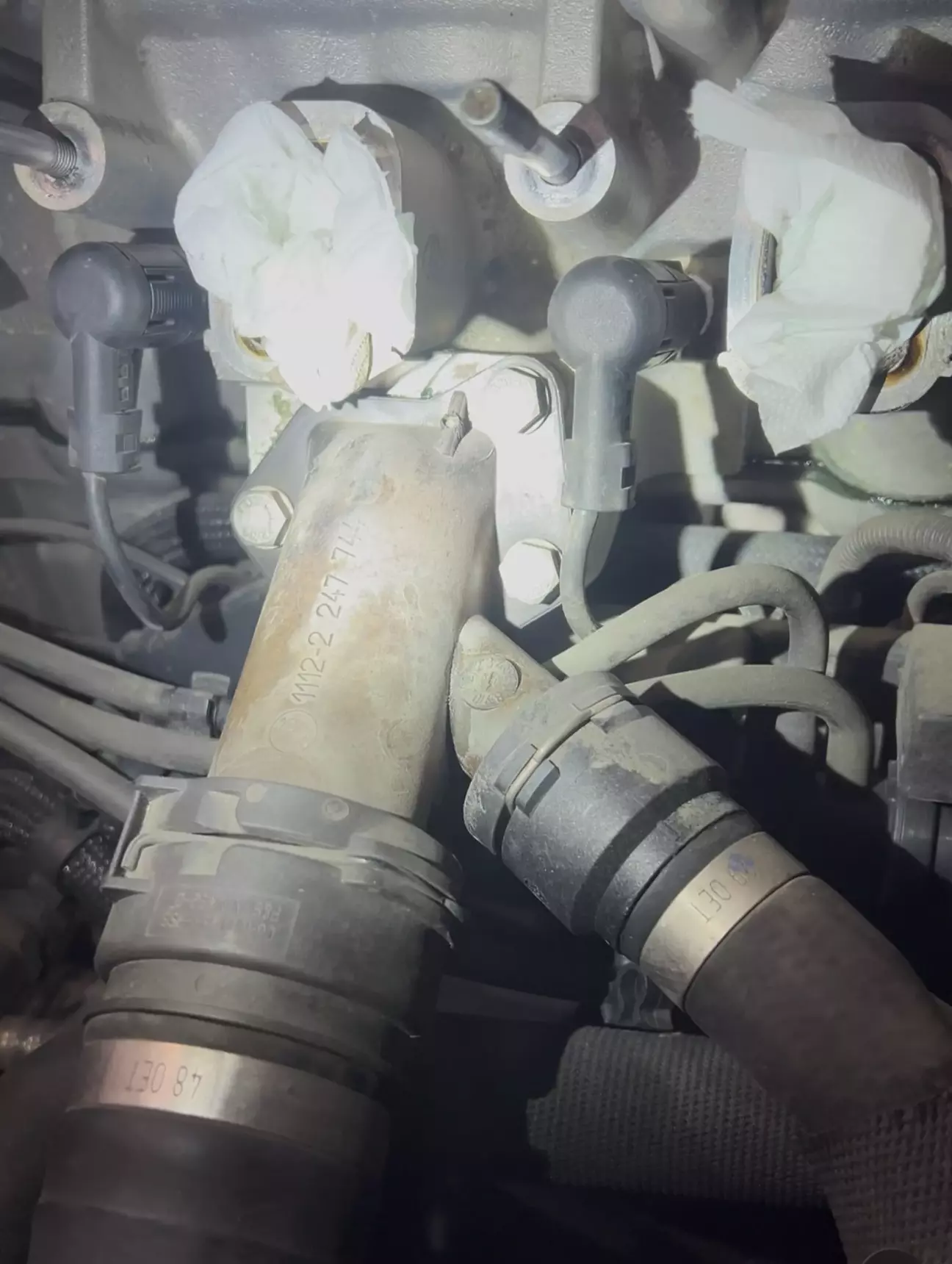 Міняю, запускаю авто, а пропуски все одно є. Майже непомінітні, перші 3-4 секунди, але є. Як же я тоді засмутився, це капець. І тут я помічаю, що йди дим з під капоту. Глушу авто, починаю шукати-а все норм. Подумав, що десь щось замастив і воно обгорає, тому запустив знову. А дим з підкапоту пішов повторно. Глушу, знімаю захист мотора, запускаю, лізу в яму і бачу, як масовий провід тупо червоніє в місці де на нього потрапив антіфріз при заміні трійника. Чіпаю його рукою, а він гарячезний весь і хрустить та розсипається. Глушу авто і демонтую його. А йому торба(