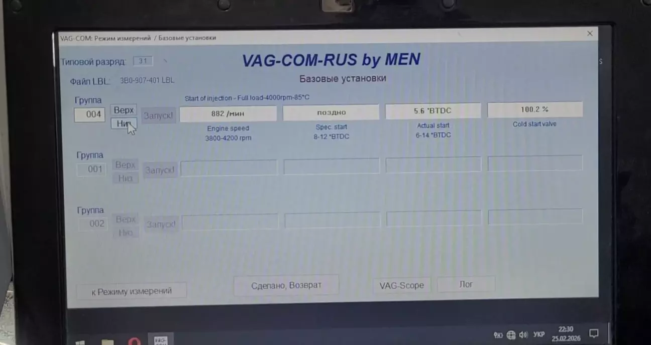 В пеізно ТНВД показує 5,6 BTDC, тобто на зуб треба переставляти ремінь ТНВД так як не хватає 7 - 8 градусів щоб витсавити 2,0 ATDC. Тобто в ТНВД зміщений шків, він не стоїть по мітках, сука. Хто його крутив непонятно, чи так виставили, чи майстер який знімав/ставив ТНВД