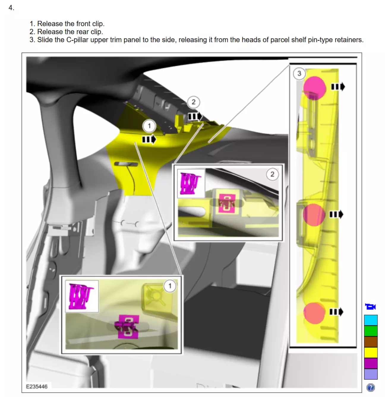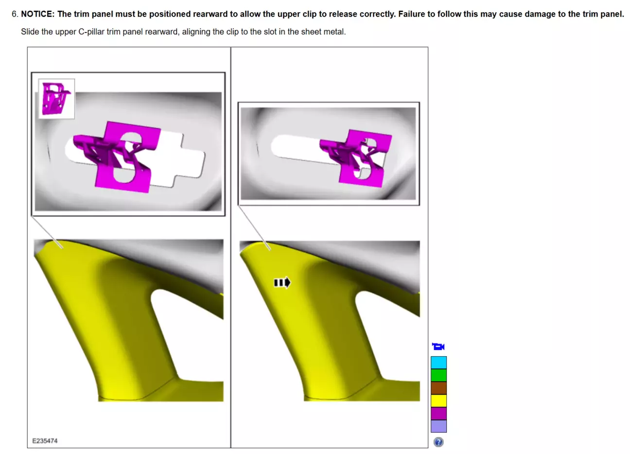Світла накладка задньої стійки знімається так само починаючи знизу, і тільки в останню чергу ви знімаєте її з останньої кліпси біля стелі, зсуваючи всю накладку в бік заднього скла. Як і з центральною накладкою, остання кліпса біля стелі - кліпса-гарпун. Не намагайтесь її просто вирвати, накладку треба зсувати в бік заднього скла.