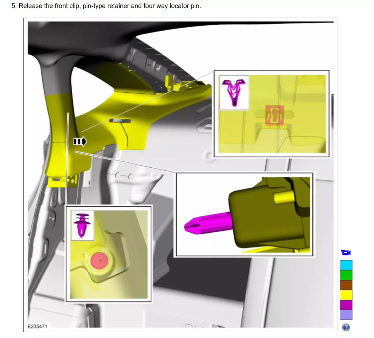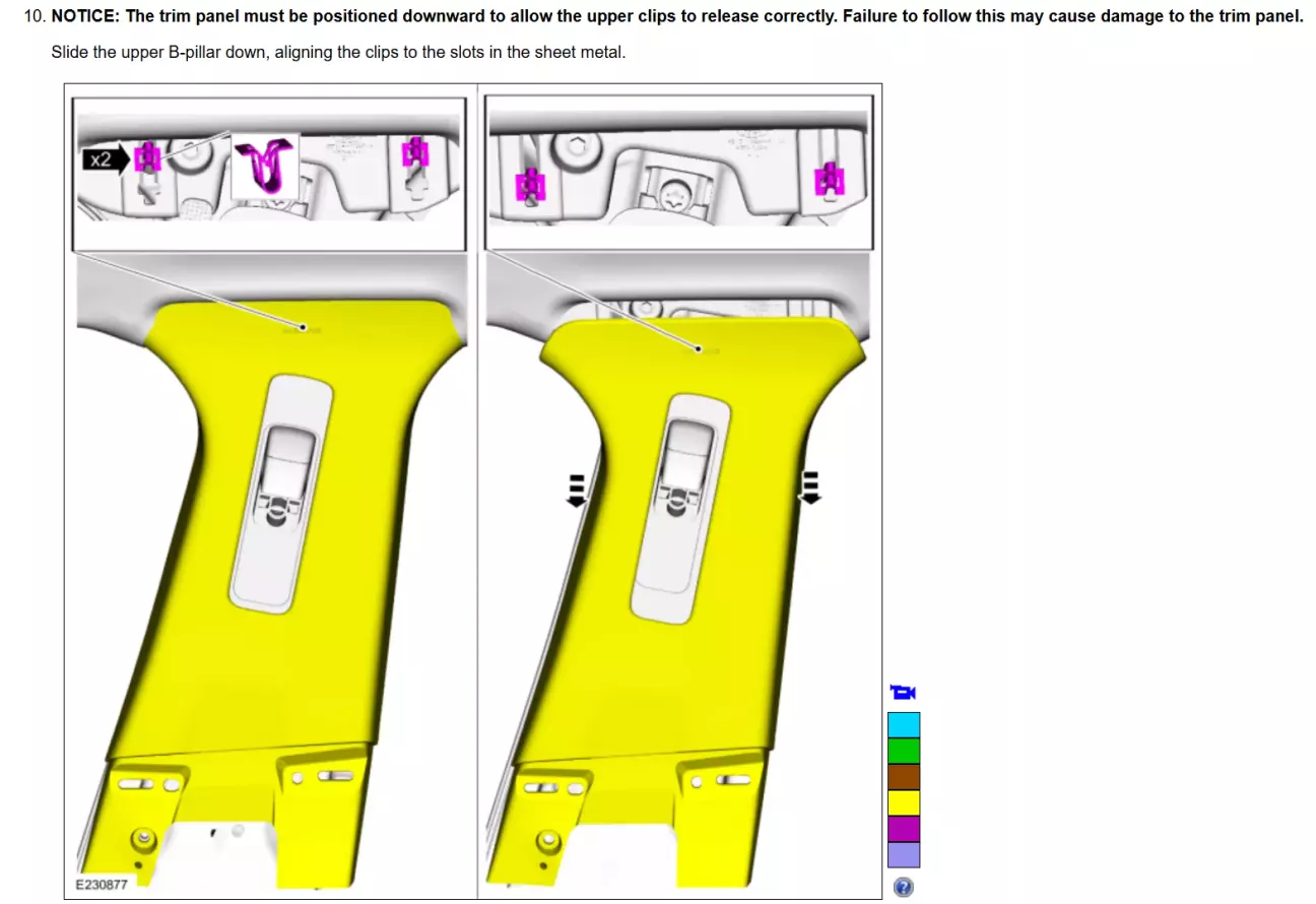 Світла накладка центральної стійки знімається з кліпс починаючи знизу, потім коли знімете її з усіх кліпс (окрім верхніх двох кліпс), просто здвигаєте її вниз, і верхні кліпси вийдуть з отворів. Верхні 2 кліпси це кліпси-гарпуни, тому якщо просто намагатися їх вирвати можна або пошкодити кліпси, або зламати пластик.