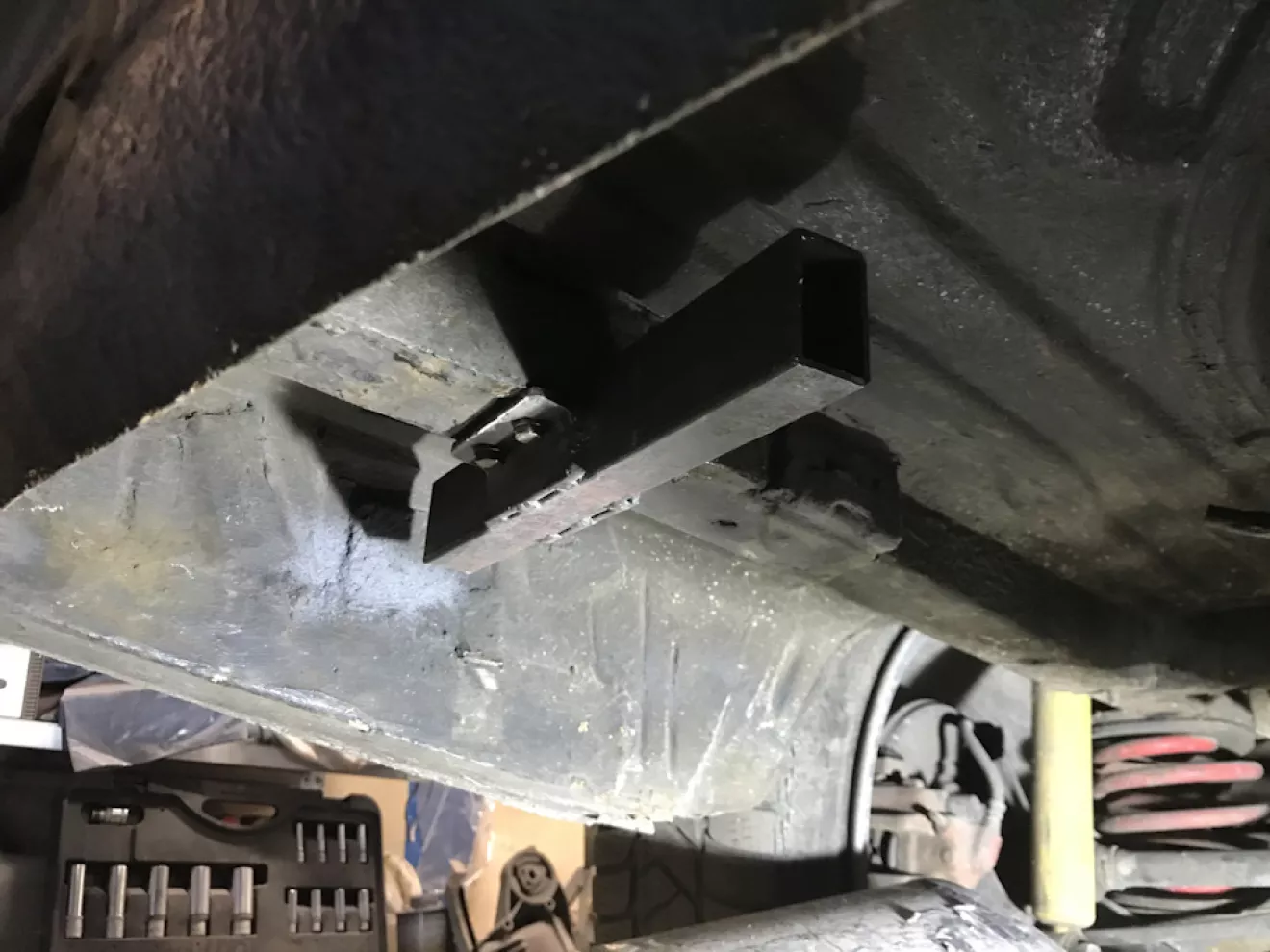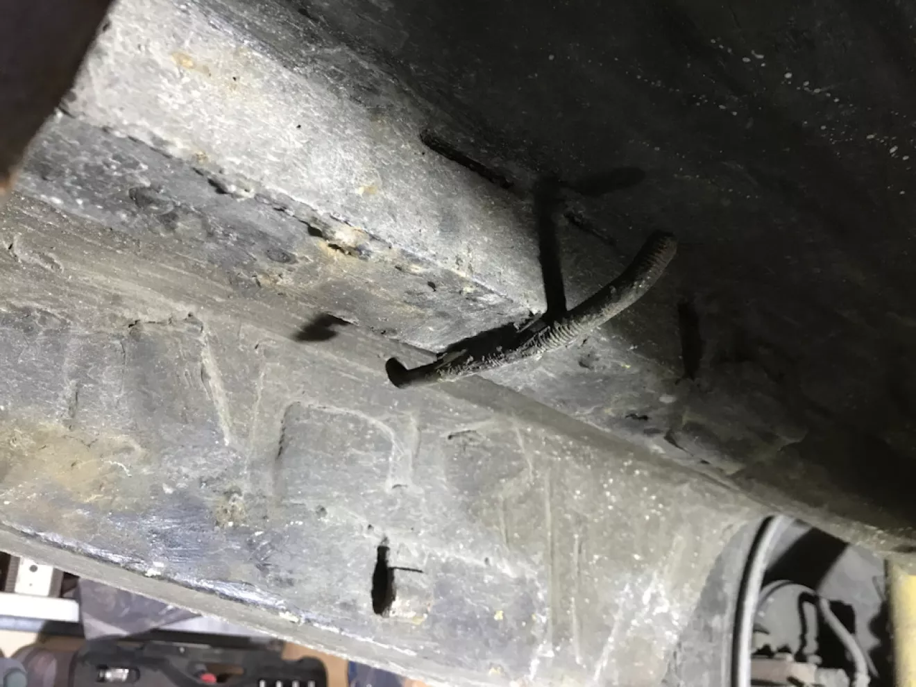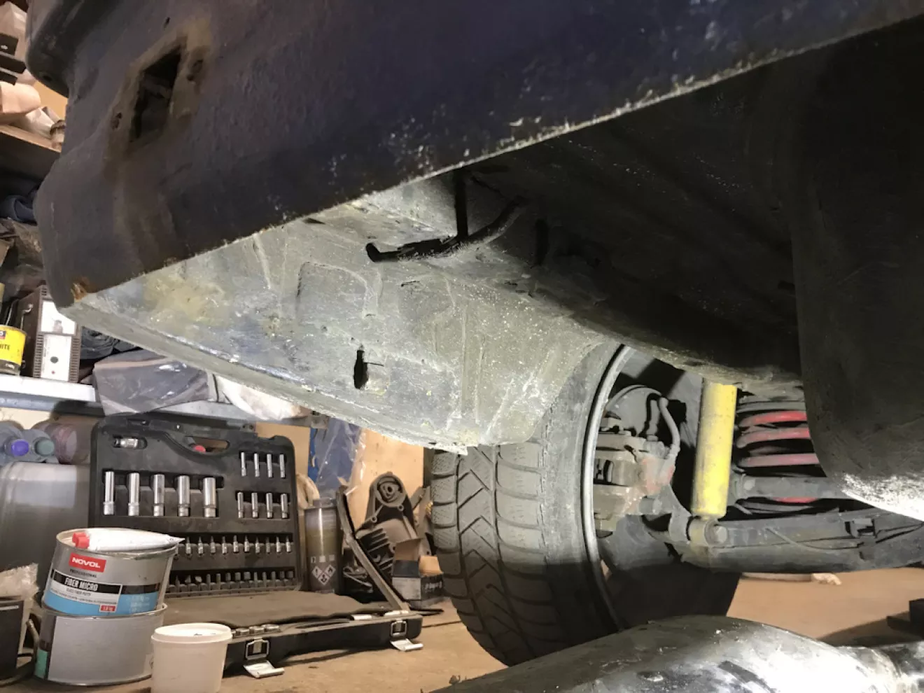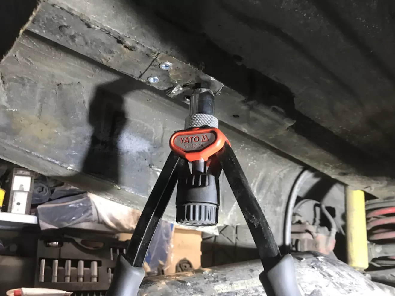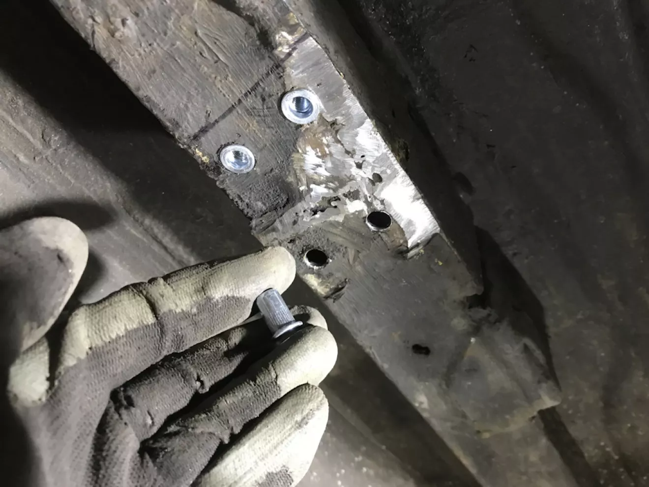 Так я его закрепил к кузову. Срезал тот болт, подровнял плоскость лонжерона и заклепал 4 закладные гайки для того, чтоб крепление можно было демонтировать.