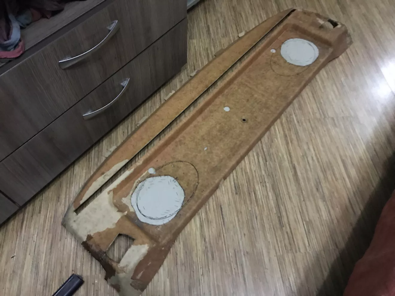 Саму плоскость полки усилил ещё одной планкой ДВП и тем самым смог правильнее разместить места под сами колонки.