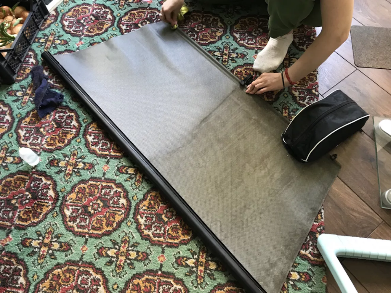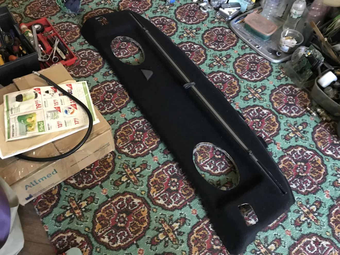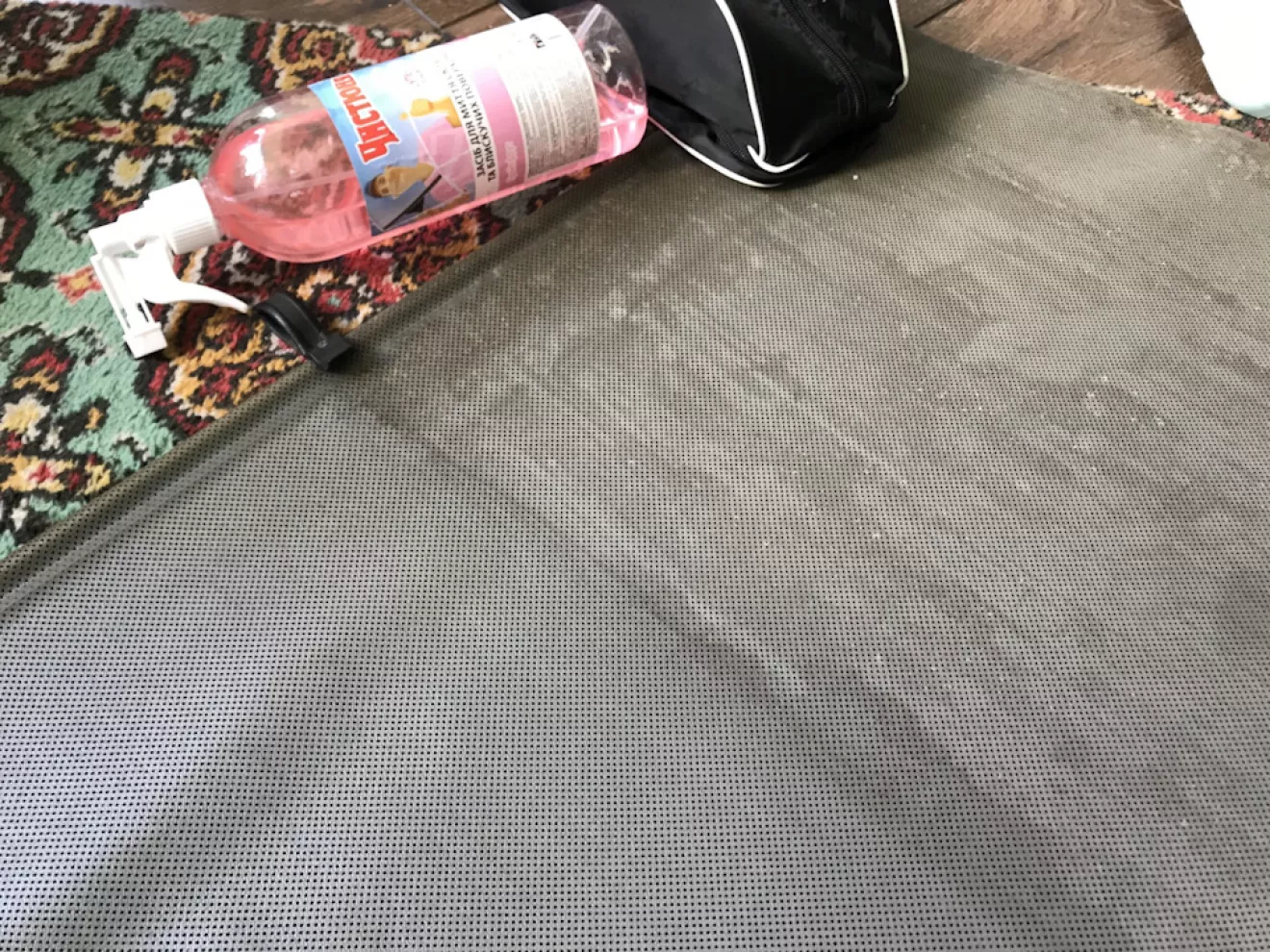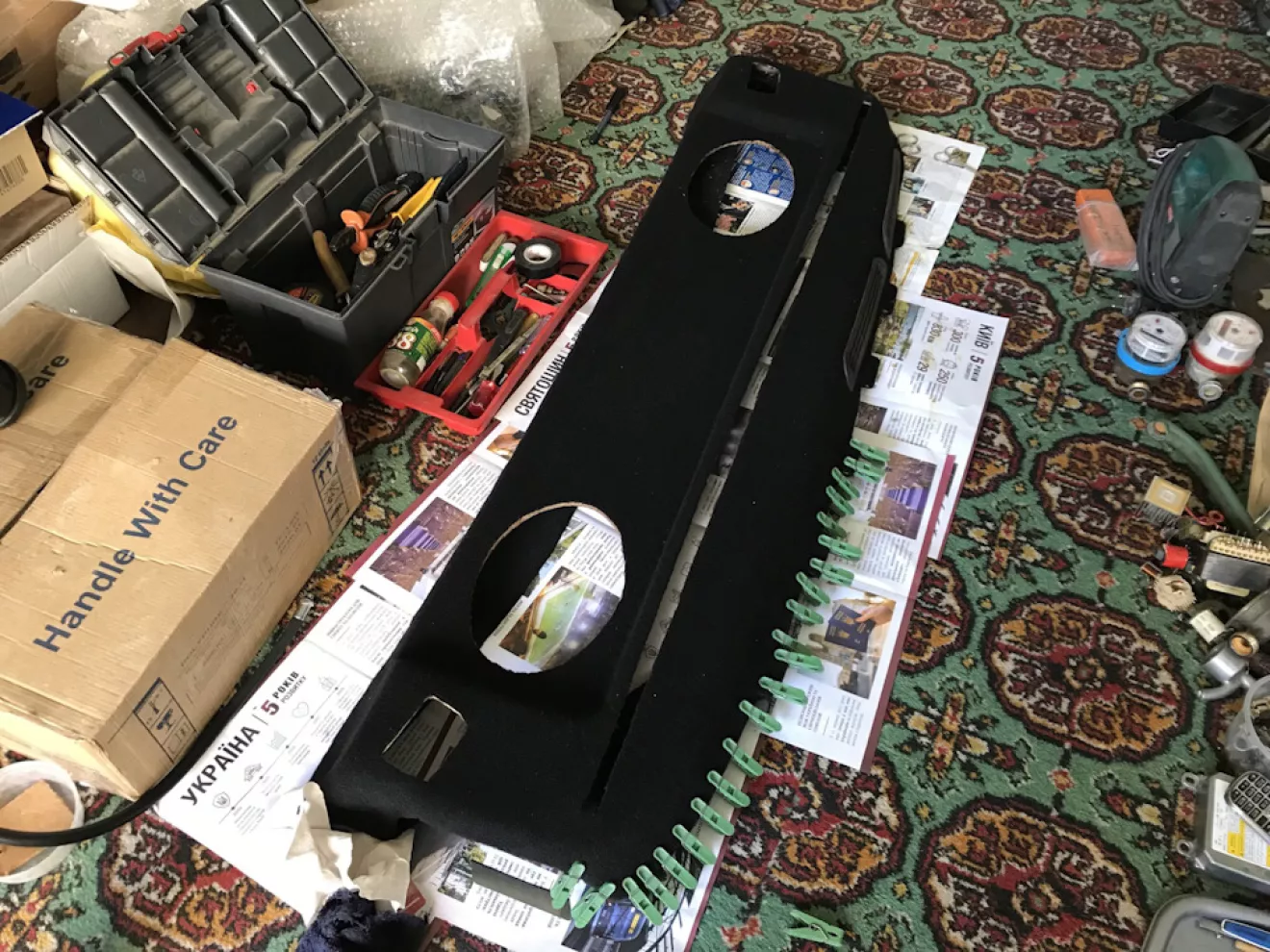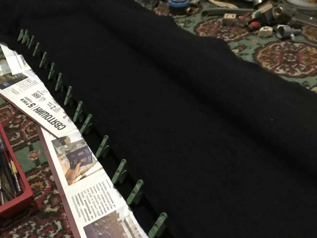 Всё вырезал, подготовил и обклеил карпетом в 6 заходов. Так хоть и дольше но значительно меньше шансов накосячить с клеем и удобнее. За одно отмыли саму шторку от грязи за 30 лет, на фото видно разницу. Цена вопроса 88 клей 400мл 120грн, полиефирка маленькая 110грн, карпет 2м 300грн. Итого 530грн и полка приобрела вид.