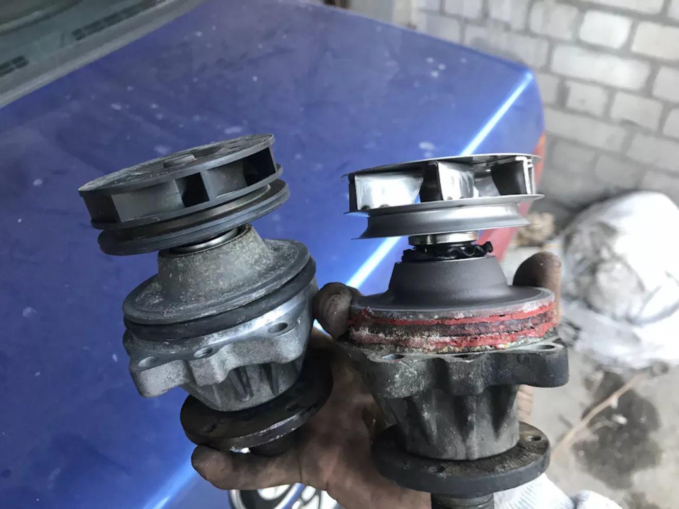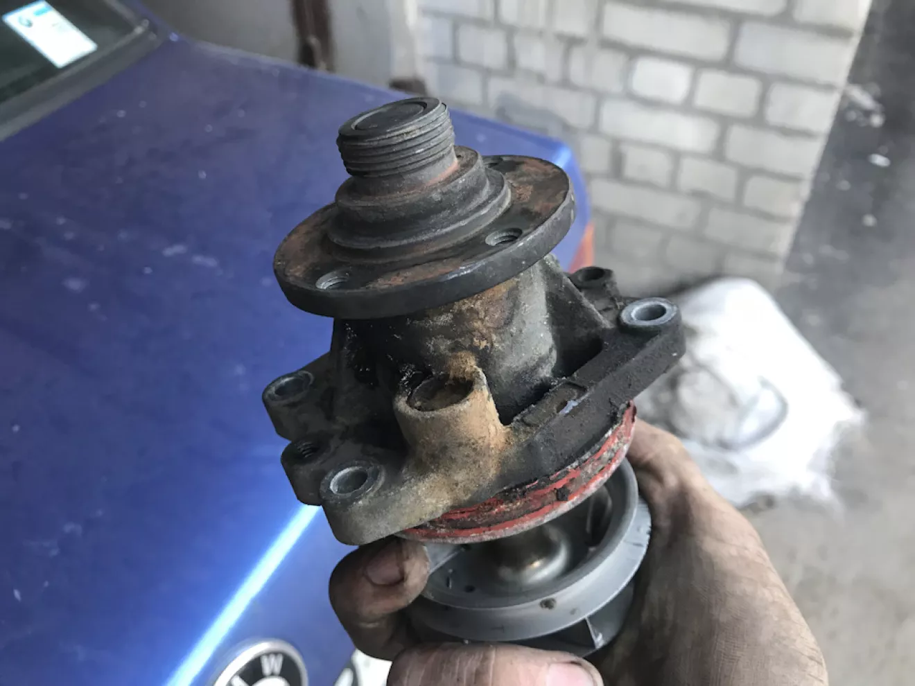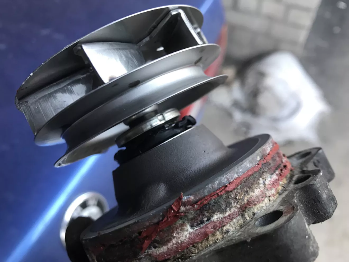 Ребята гуру неземные создания, по этому для них верх это низ, ну а низ это верх. Имея горький опыт термостатов, новый сразу бросил в кипяток для проверки и уже после принялся за установку. Вся установка заняла минут 30-40 со всеми проверками, снятием и установкой радика и шлифовкой плоскости алюминиевой крышки. На этом всё не закончилось. перепроверив что всё закручено поехал к товарищу ну а после домой. Уже на подъезде к своему дому стрелка в красной зоне. Б** как-так?! Открываю капот, верхний партубок на радик не одет. как я дважды всё проверил и не заметил этого я не знаю. Одев патрубок, закрутив, залил жидкость и обнаружил серьезную течь. На следующий день долил жидкости и поехал в гараж для выяснения причин течи. Думал возможно что-то с крышкой термостата, но сняв снова радик я сразу обнаружил помершую помпу. Благо предидущий мотор был практически идентичен и помпу я таки не покупал. Уже сняв шкив и открутив помпу шатав за посадочную плоскость я просто был в шоке! Поперечный люфт 2-3мм, помпу будь-то закусывает при вращении и вот она виновница: