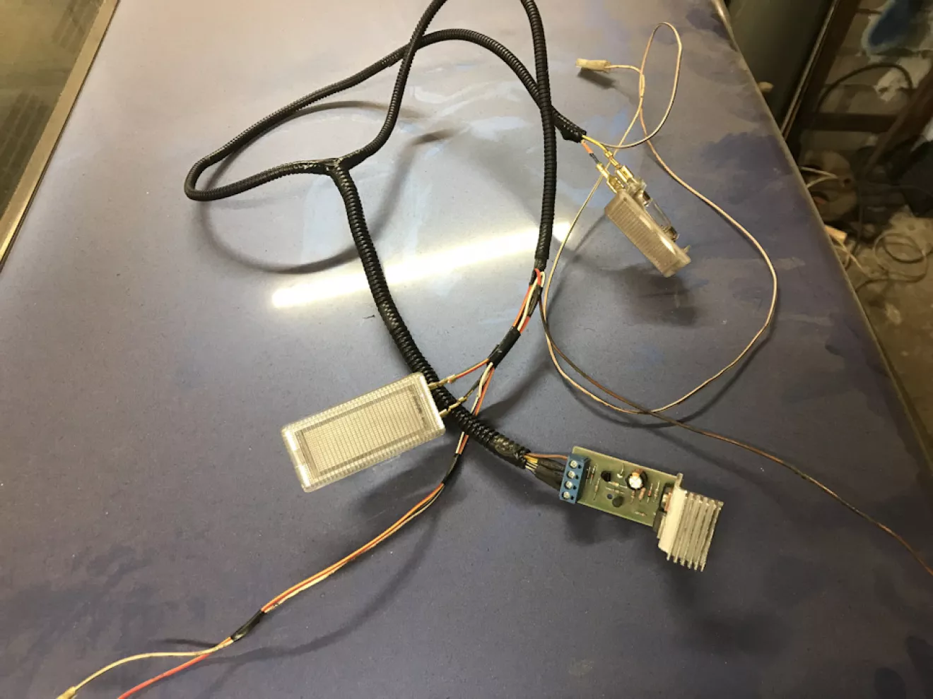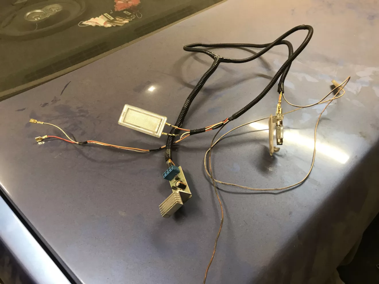 4. Вот, вот пик колхоза! Вежливая подсветка ног. Ой, только не говорите, что никогда не сталкивались с проблемой, когда в ноги падали ключи или телефон или что-то при резком повороте с кармашка на бороде. Может у меня это особенно выражено, но я один раз в день туда что-то да роняю. При свете дня, это ещё не конец, но последней каплей стало когда в час ночи, собираясь домой с гаража я в машине роняю телефон. На секундочку погода -5, руки ледяные уже мысленно ты весь дома НО! Но ты уронил то, чем ты обычно подсвечиваешь в случае если ты что-то уронил. Ребята, это просто конец! Из загашника достал две платы управления вежливым светом. Ещё когда в прошлый раз собирал машину хотел их поставить на основной свет в салоне, но что-то пошло не так и я их кинул на полку. Тут меня осенило! Пора время их заколхозить но только пока на свет в ноги. Получилось вот так.