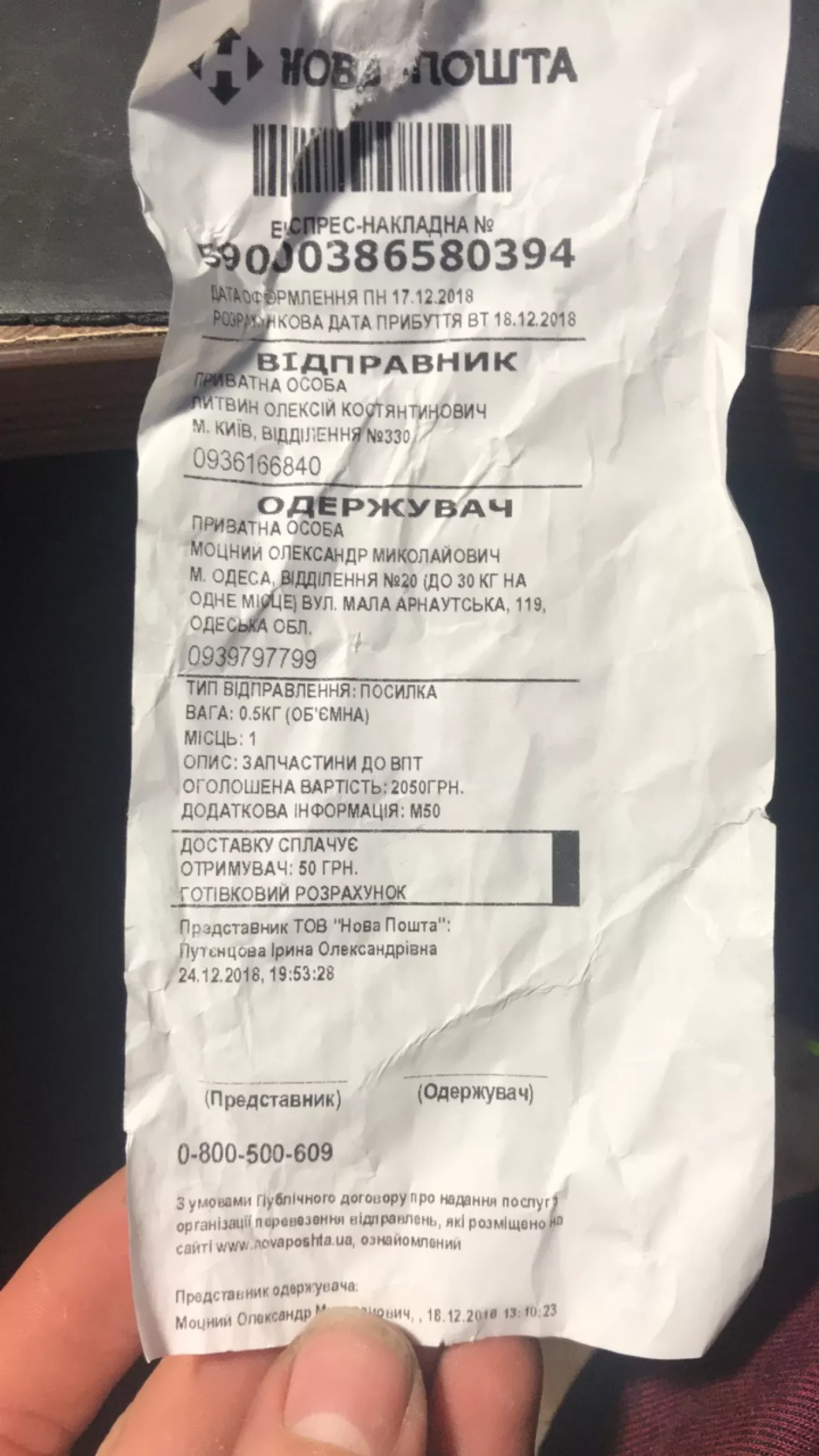 В один вечер прихожу, говорю, что хочу забрать наложку, а мне отвечают — Так у вас нет никакой наложки. Я говорю ну как же?! Вот номер ТТН, а они говорят всё верно, но тут нет наложки. Тут оценочная стоимость посылки, вот мол смотрите. Я смотрю на эту квитанцию и понимаю, что так и есть, 2050грн оценочная стоимость. Я спрашиваю, а вас не смущает, что я дописал описание товара чтоб не подменили посылку, а назад мол ничего не жду? Они говорят ну что поделаешь, вы ведь подписали сами.