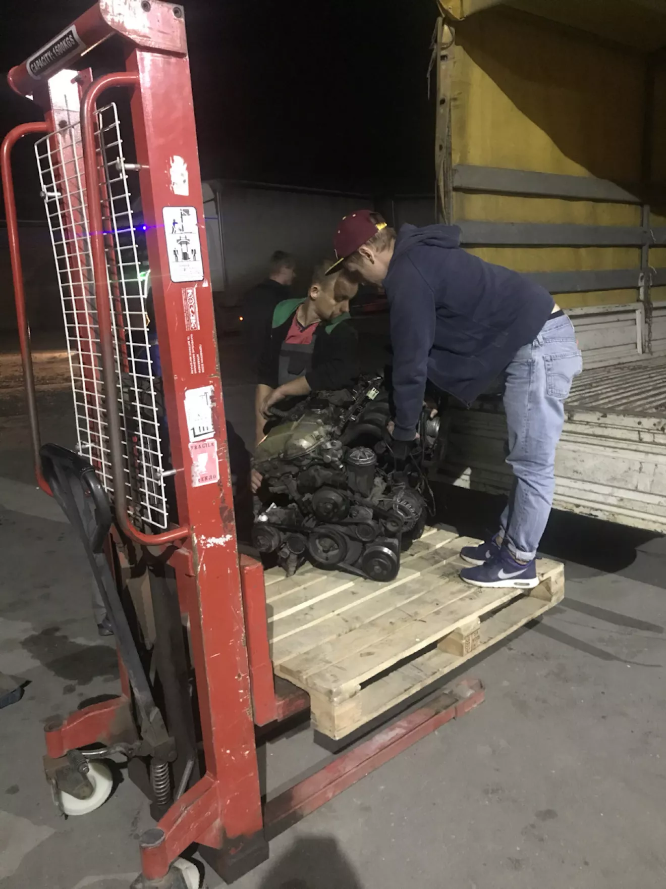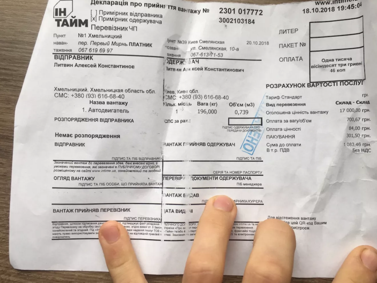 Уже в пол 7го вечера в надежде загрузить двигатель в туринг, ребята не захотевши париться сказали, что он просто не влазит. У меня оставался час до закрытия Интайма и я решил не спорить, а отвезти его на почту и ехать пустым с Хмельницка. Доставка к почте 400грн, на почте ещё 1087грн.