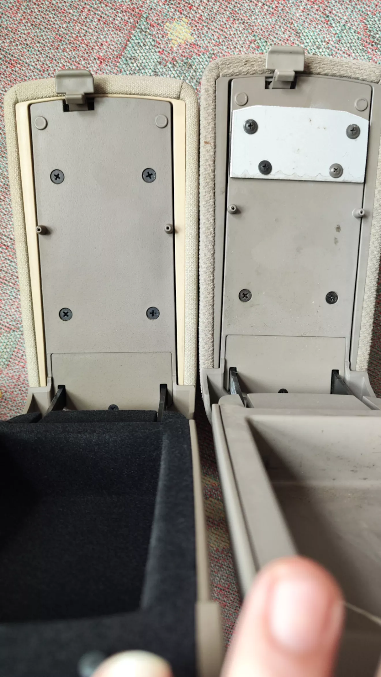 Наконец заменил подлокотник. Был полностью отломан предыдущим владельцем и скреплен пластиной так, что не закрывался на защёлку. Новый ещё и с мягкой оббивкой кармана.
