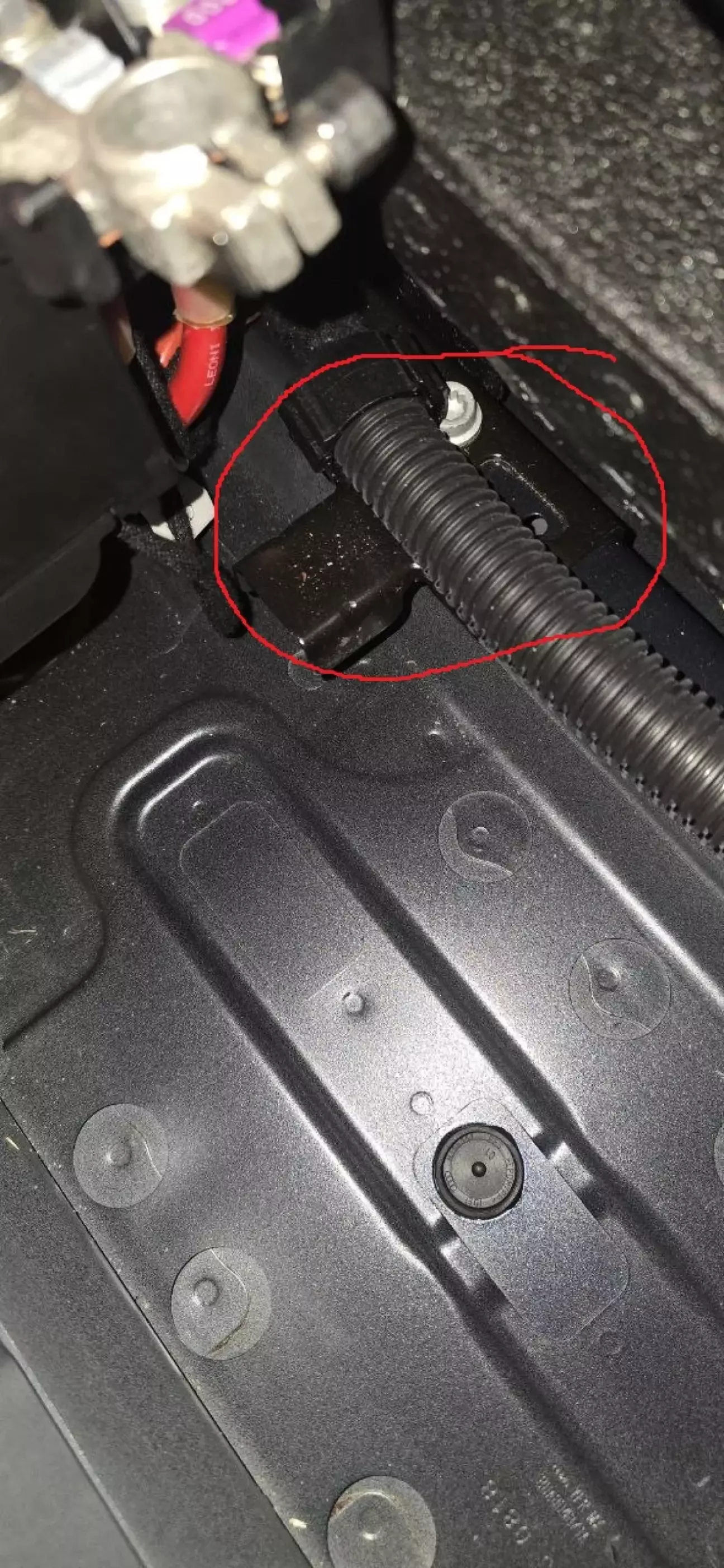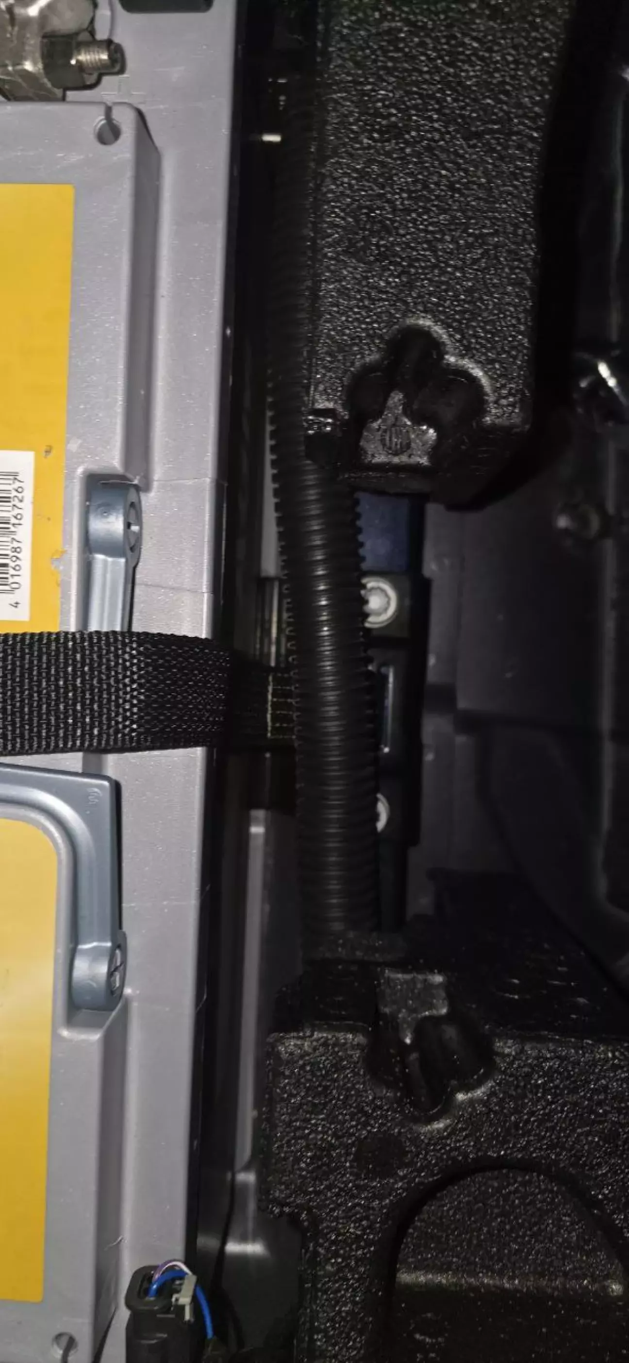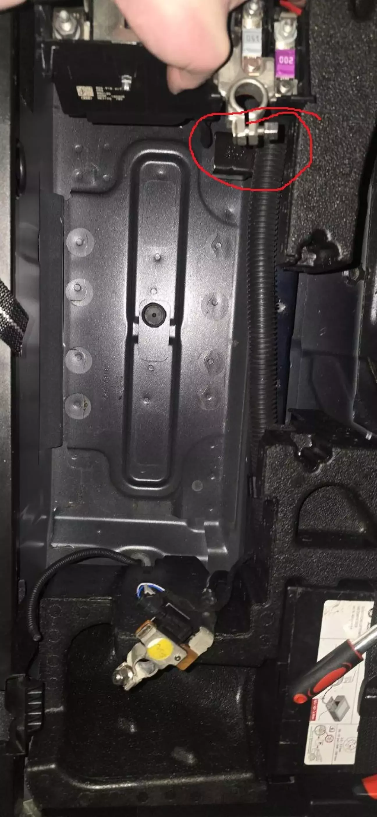 2. Далі треба зняти частину піддону для доступу до кріплення ременя, яким перетягнутий АКБ, от тут чийсь пальчик піаніста якраз пестить цю деталь:
