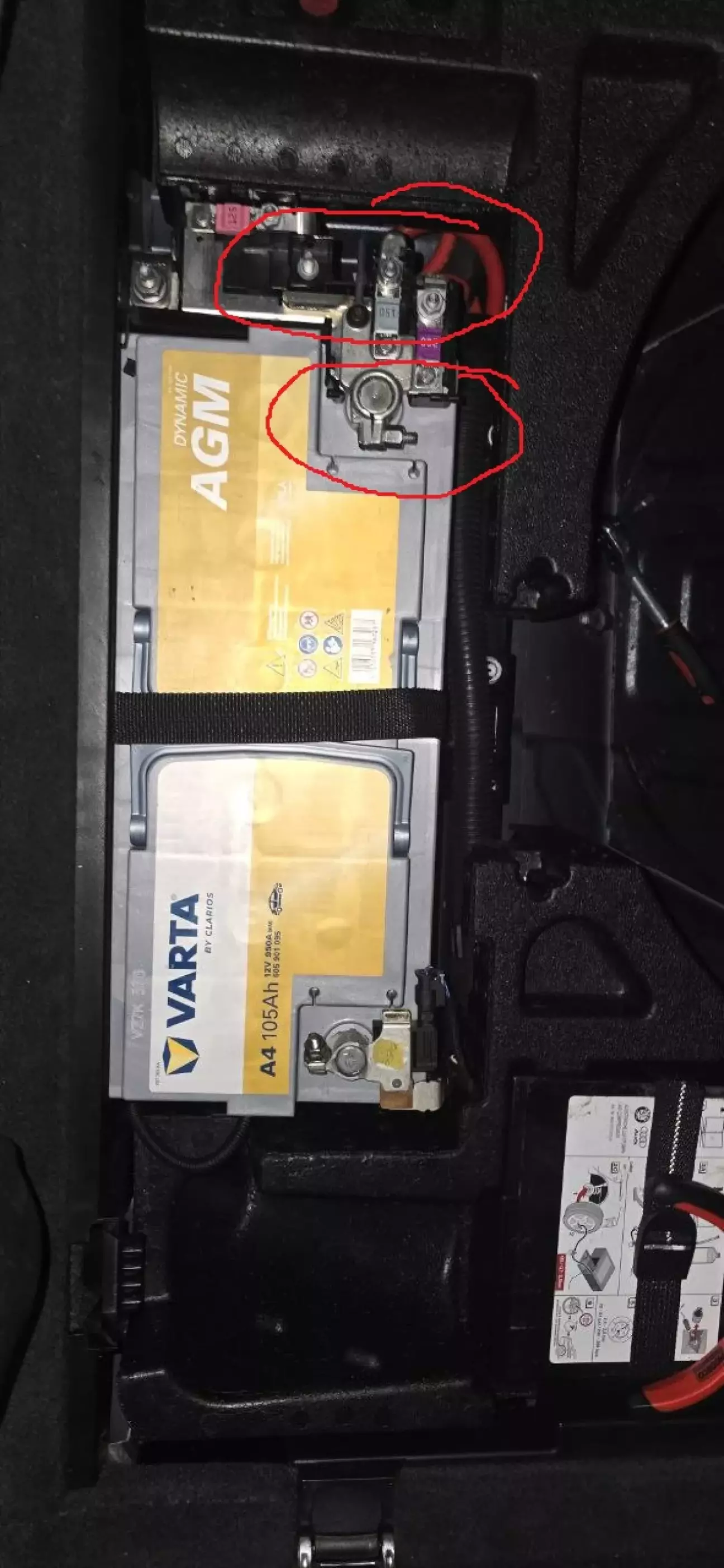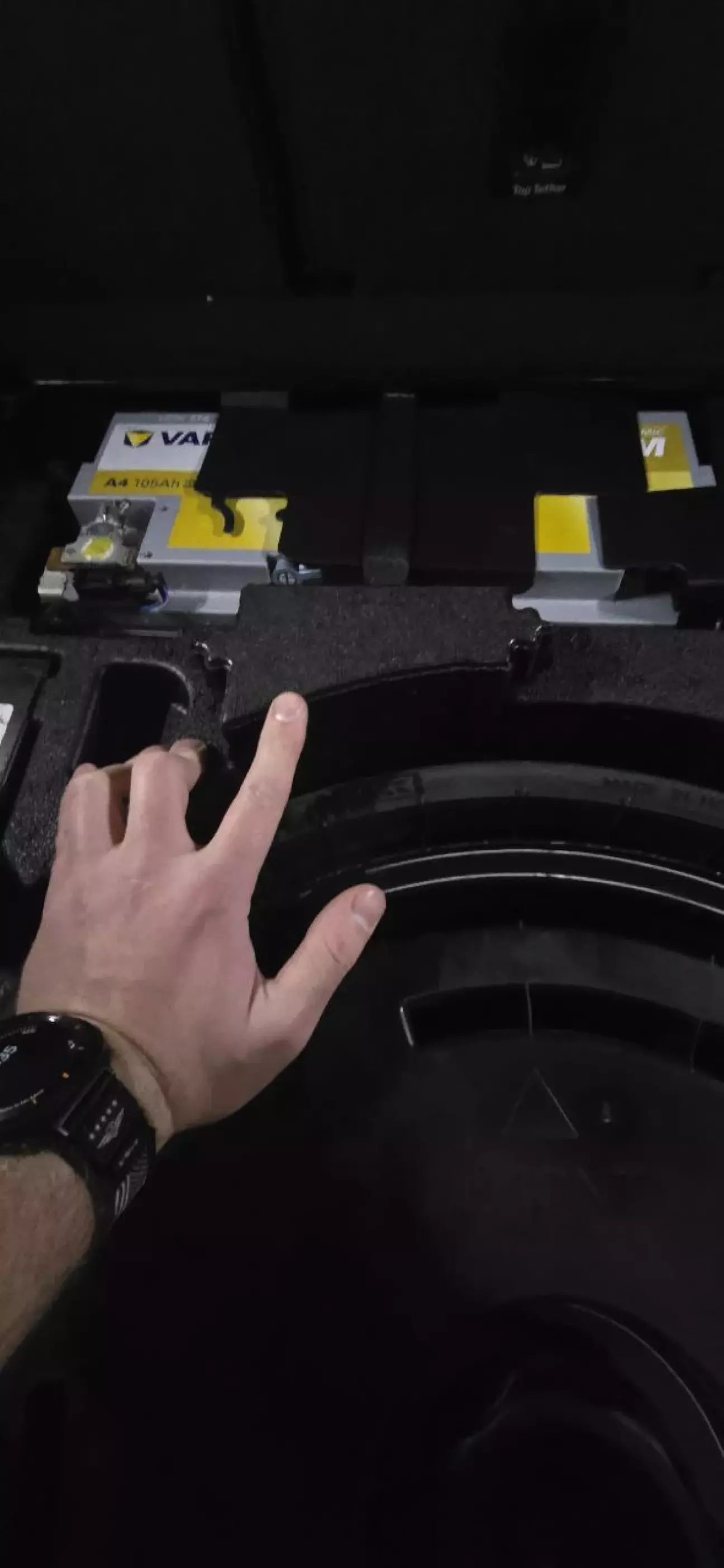 По-хорошому треба було розібрати багажник і поміряти рулеткою, але вирішив замовляти АКБ і, якщо не підійде, обміняти. Замовив Varta Silver Dynamic AGM 105А H15 (950EN) (605901095) - Varta іде по заводу, а OEM-версія Varta без наліпки VAG коштує більше ніж в 2 рази дешевше (~$280-300 проти ~$500-600), тому і взяв OEM - той самий АКБ з того самого заводу. Ходять легенди, що Varta для VAG відбирає першокласні АКБ і має жорсткіші стандартні якості ніж для OEM-продукції, але на різницю в ціні можна купити ще 1 такий самий АКБ, тому в переплаті сенсу не бачу. Мені попався екземпляр виробництва серпня 2025 року, з гарантією 2 роки. По отриманню вирішив його дозарядити, але він виявився майже повністю зарядженим, на зарядці простояв не більше 40хв.