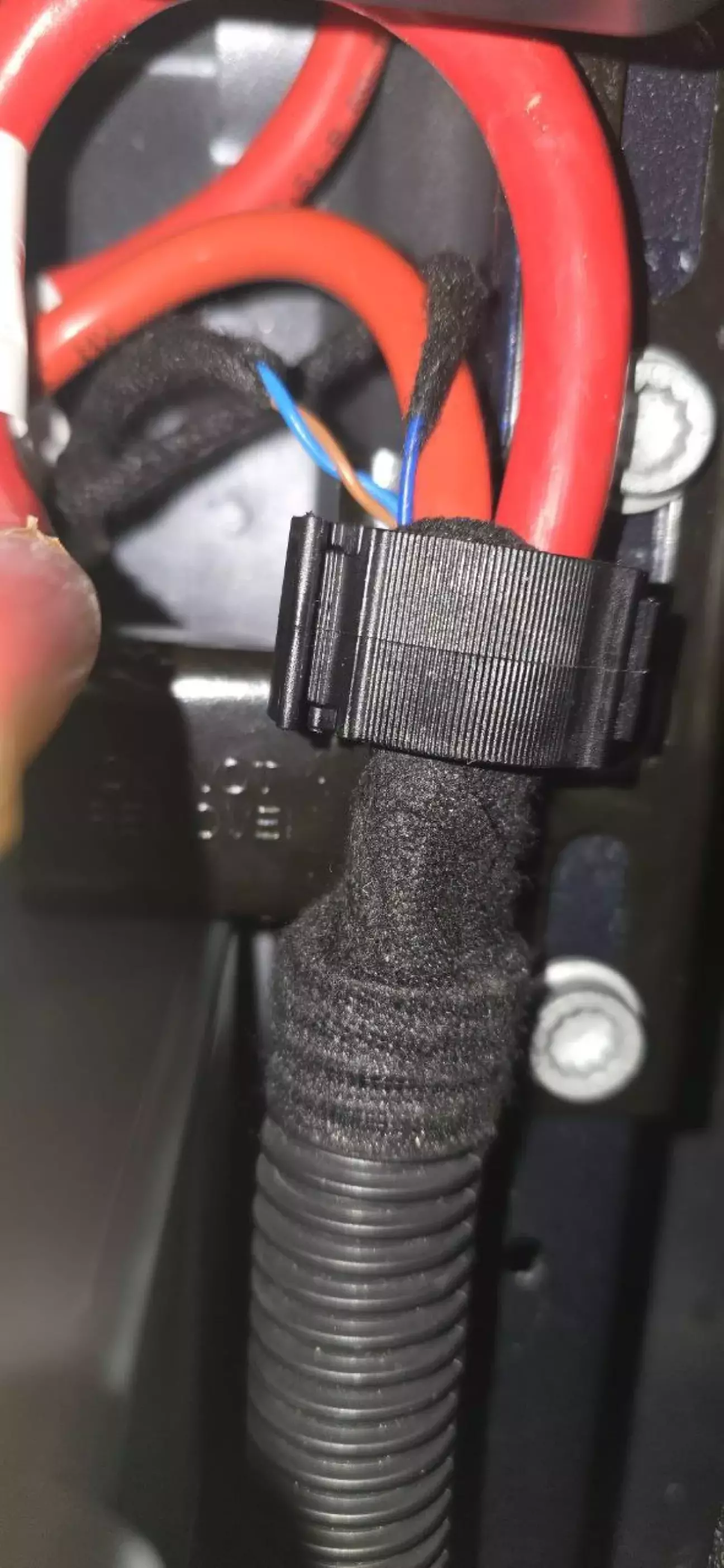 Викручуєте 2 болти на кріпленні обмежувача і розсуваєте пальцями пластикове кільце, яке приєднано до обмежувача і в яке засунутий шланг з проводкою. Проводку вивільнюєте з кільця і знімаєте обмежувач. Тіко не пролюбіть болти (вони ідентичні тим, що були в металевому кріпленні ремінця, який тримає акум).
