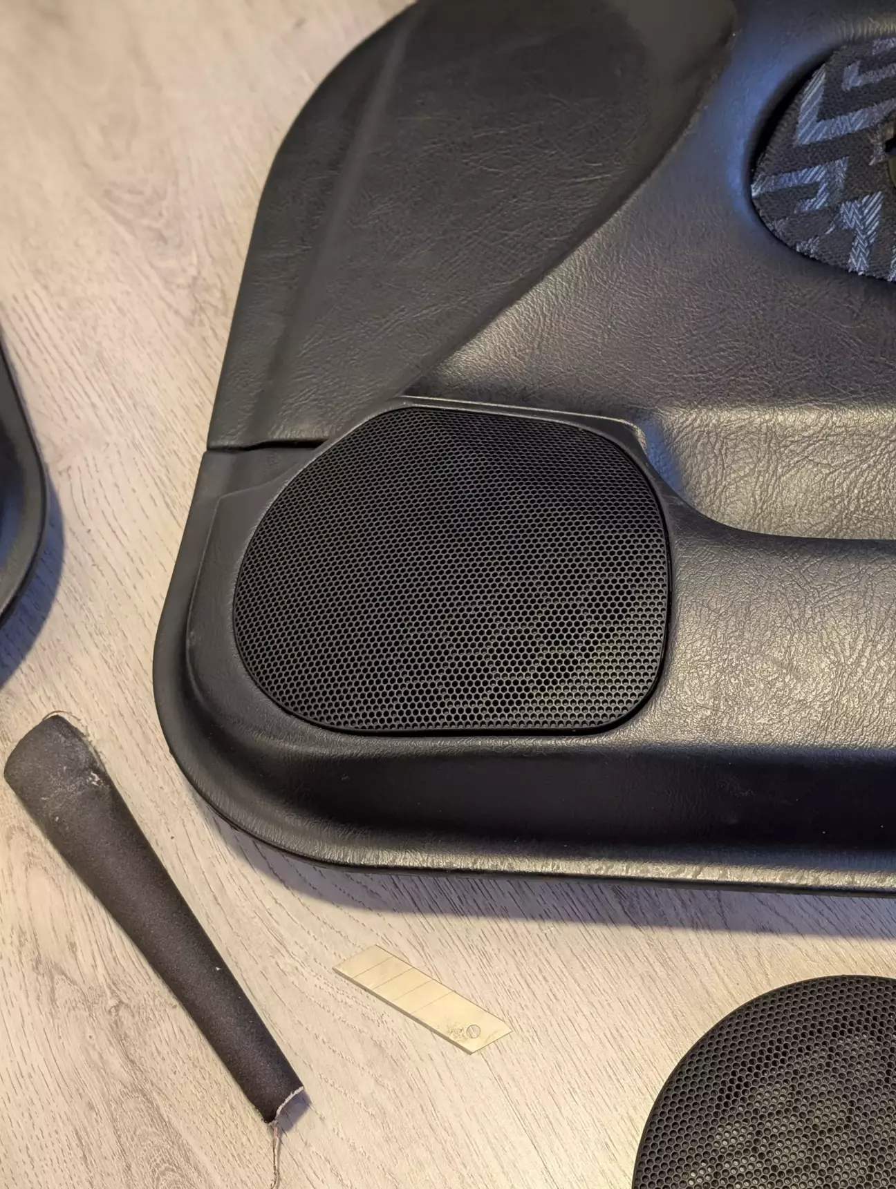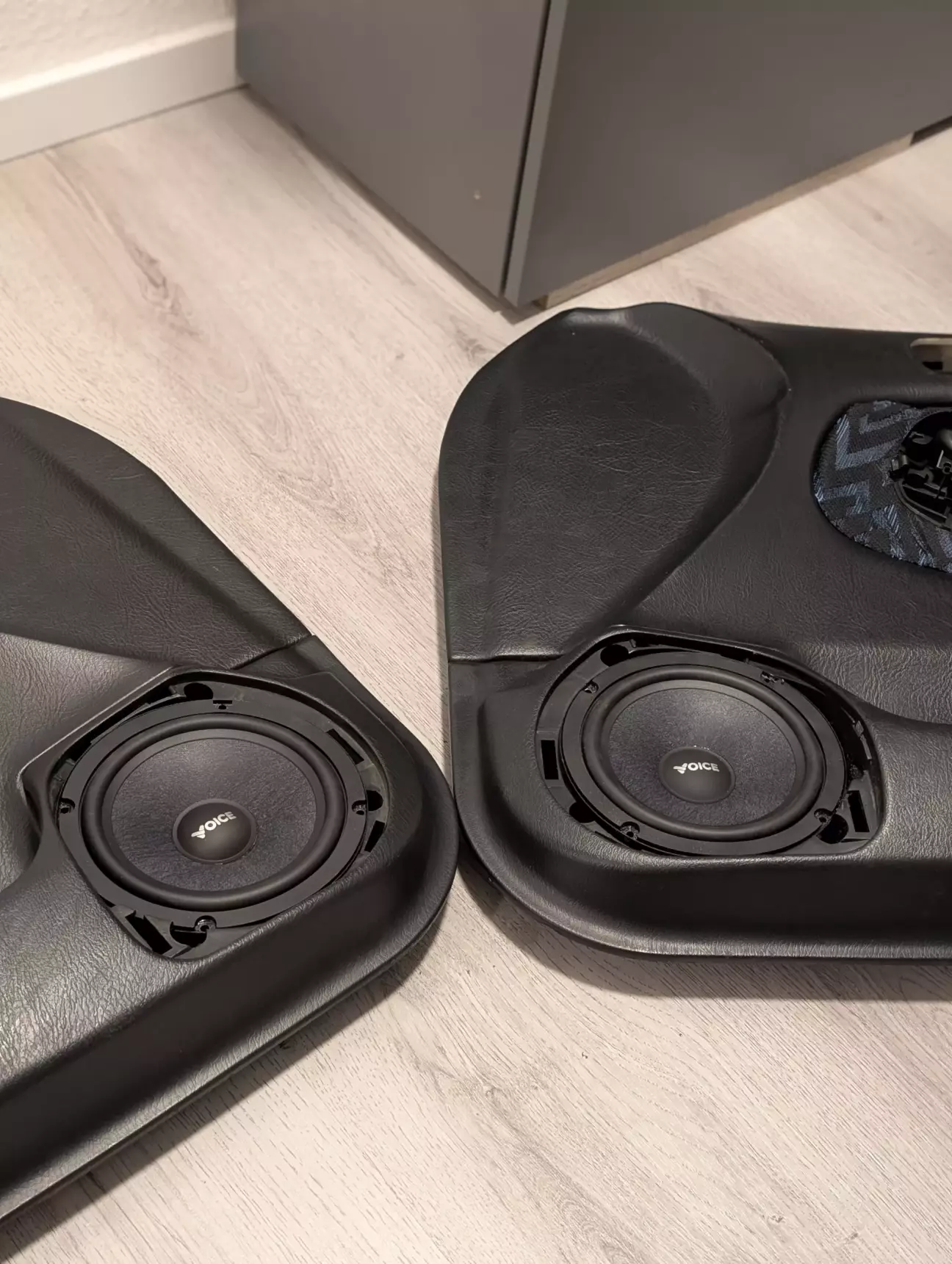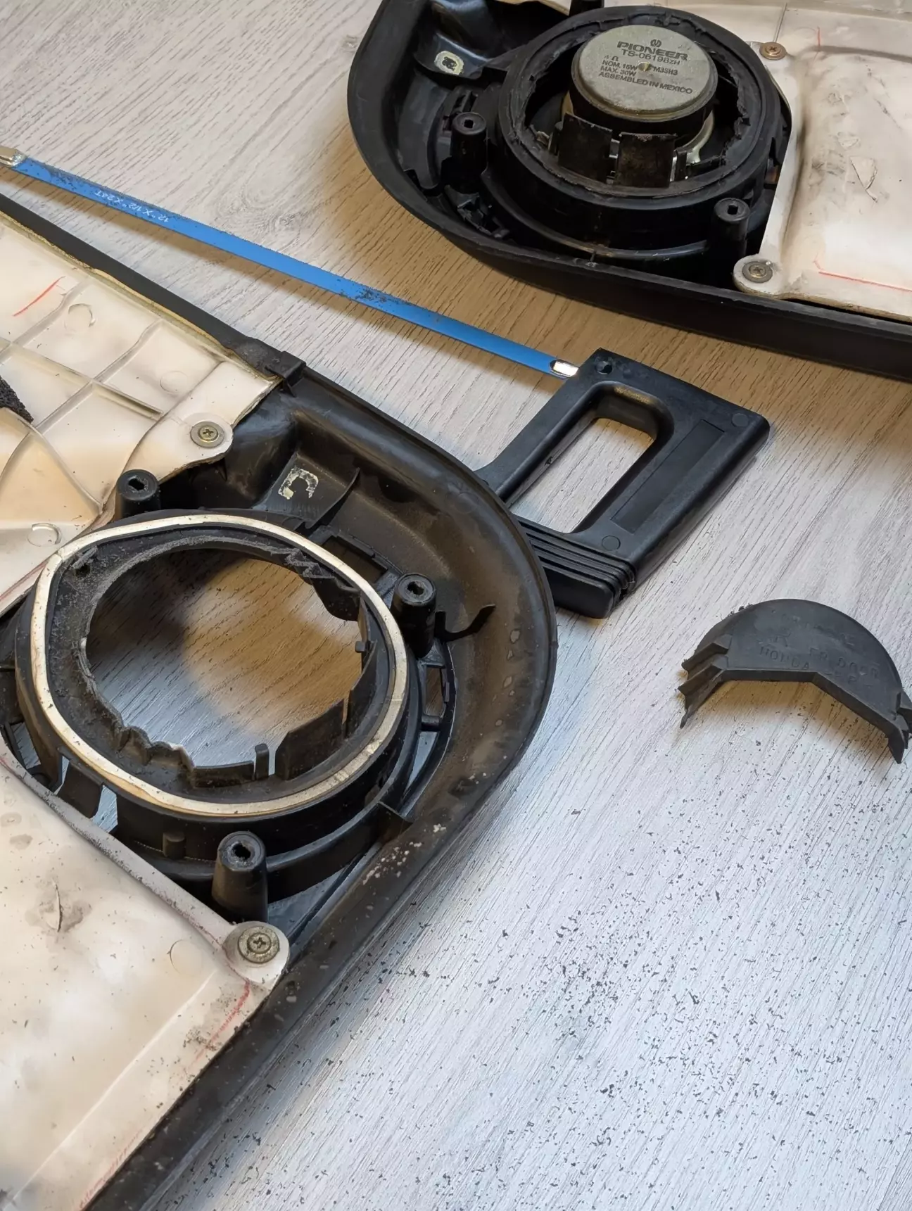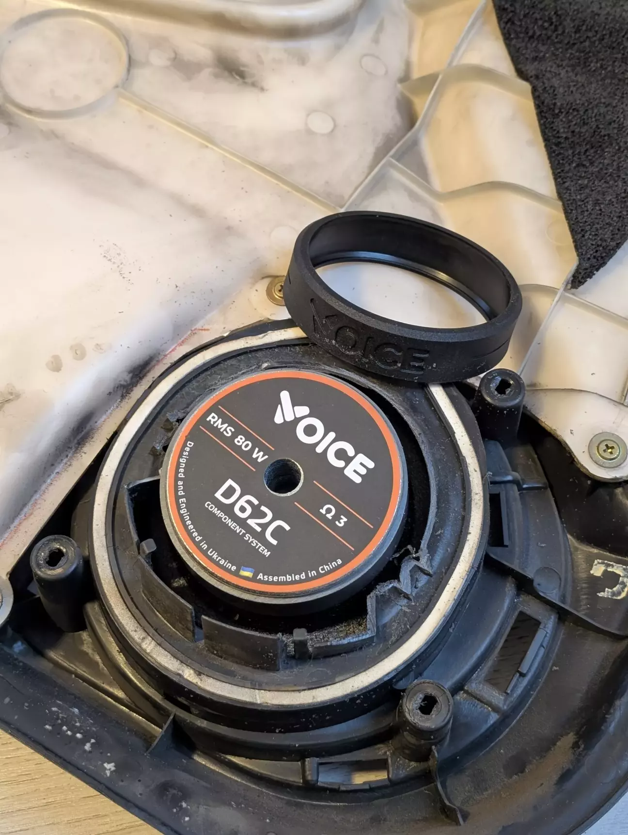 И так, что бы впихнуть этот динамик нужно срезать штатную пластиковую корзину под динамик так как на новых динамиках магнит больше в 3 раза, ещё в Украине я подрезал одну карту что бы туда встало но на этом все и закончилось, так что продолжаем