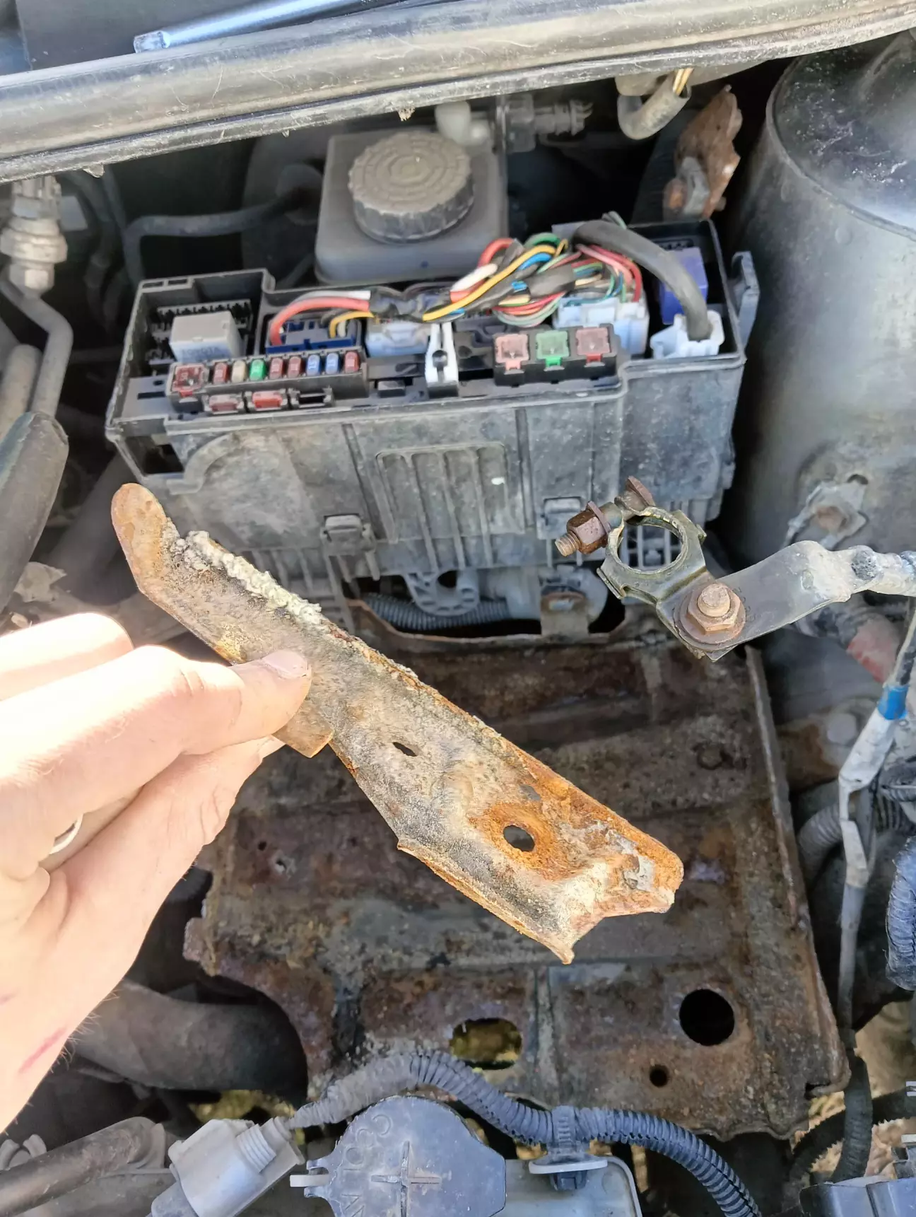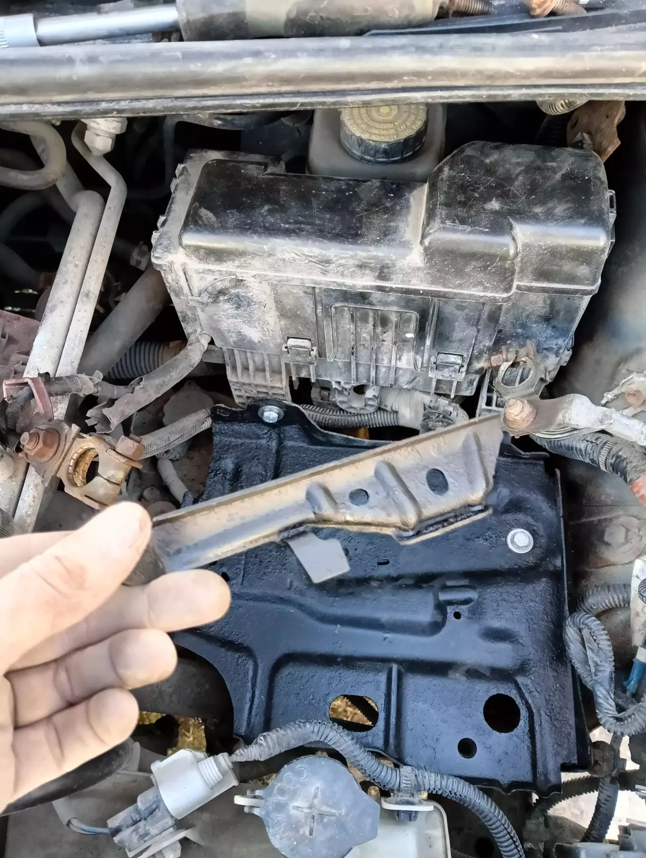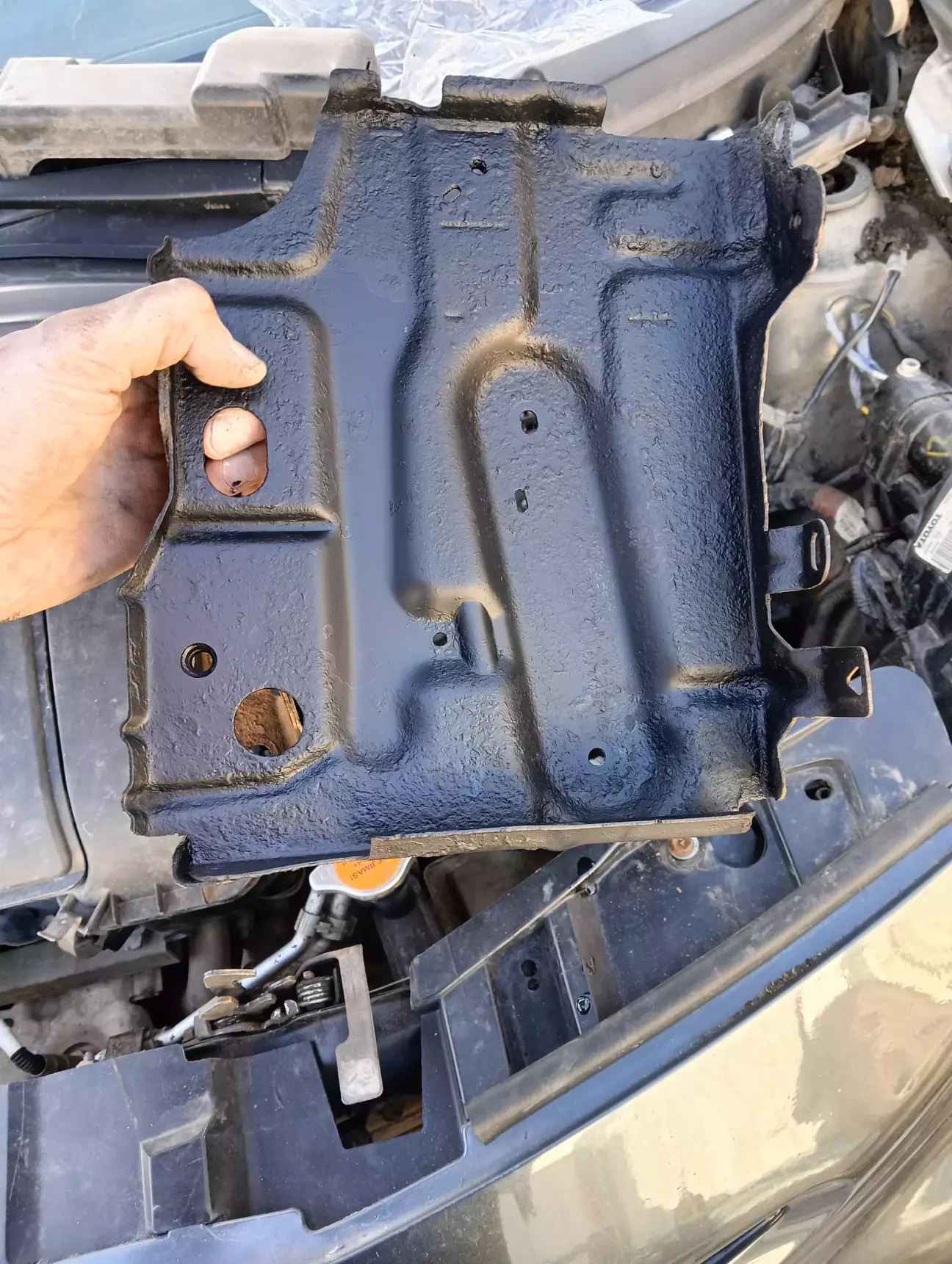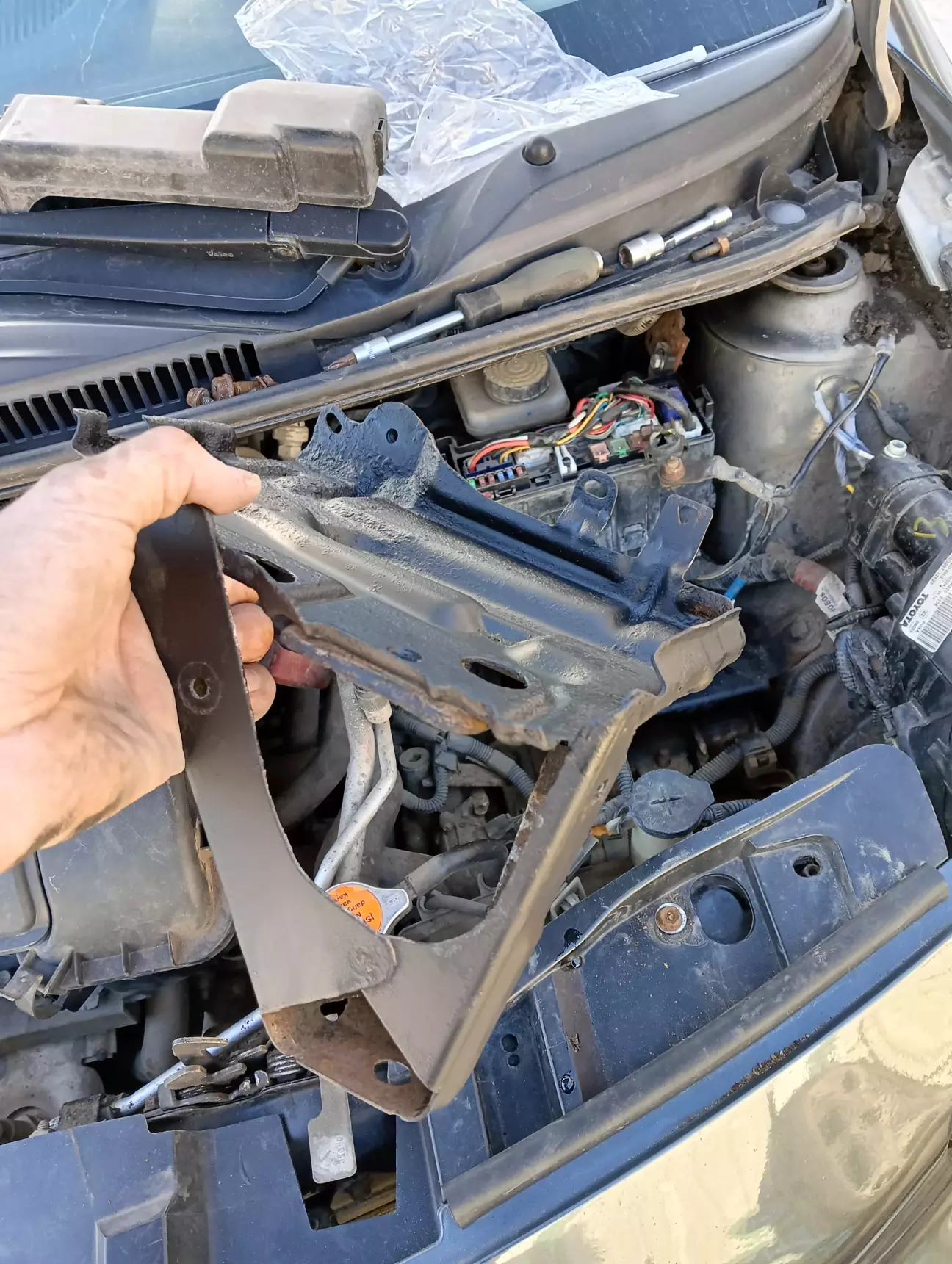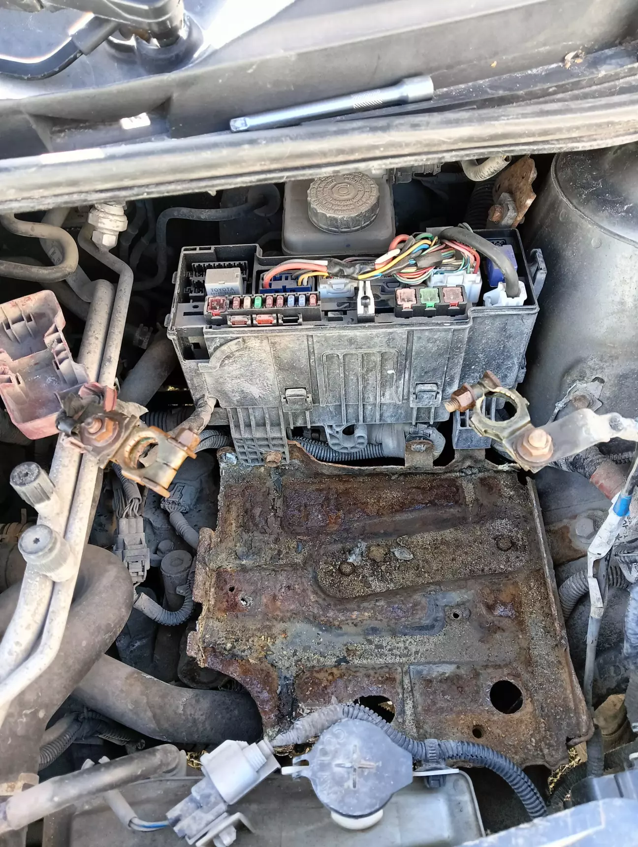Був вихідний аж пів дня, тож трохи приділив увагу тойоті. Знайшов обрив по датчику абс 😁 Тепер помилки немає і я щасливий. Попутно знімав площадку АКБ, тож зачистив і пофарбував її, а також замінив болти кріплення площадки абк на нові, бо старі дуже поржавіли і байдуже що із не видно, зате я знаю що вони нові 😁