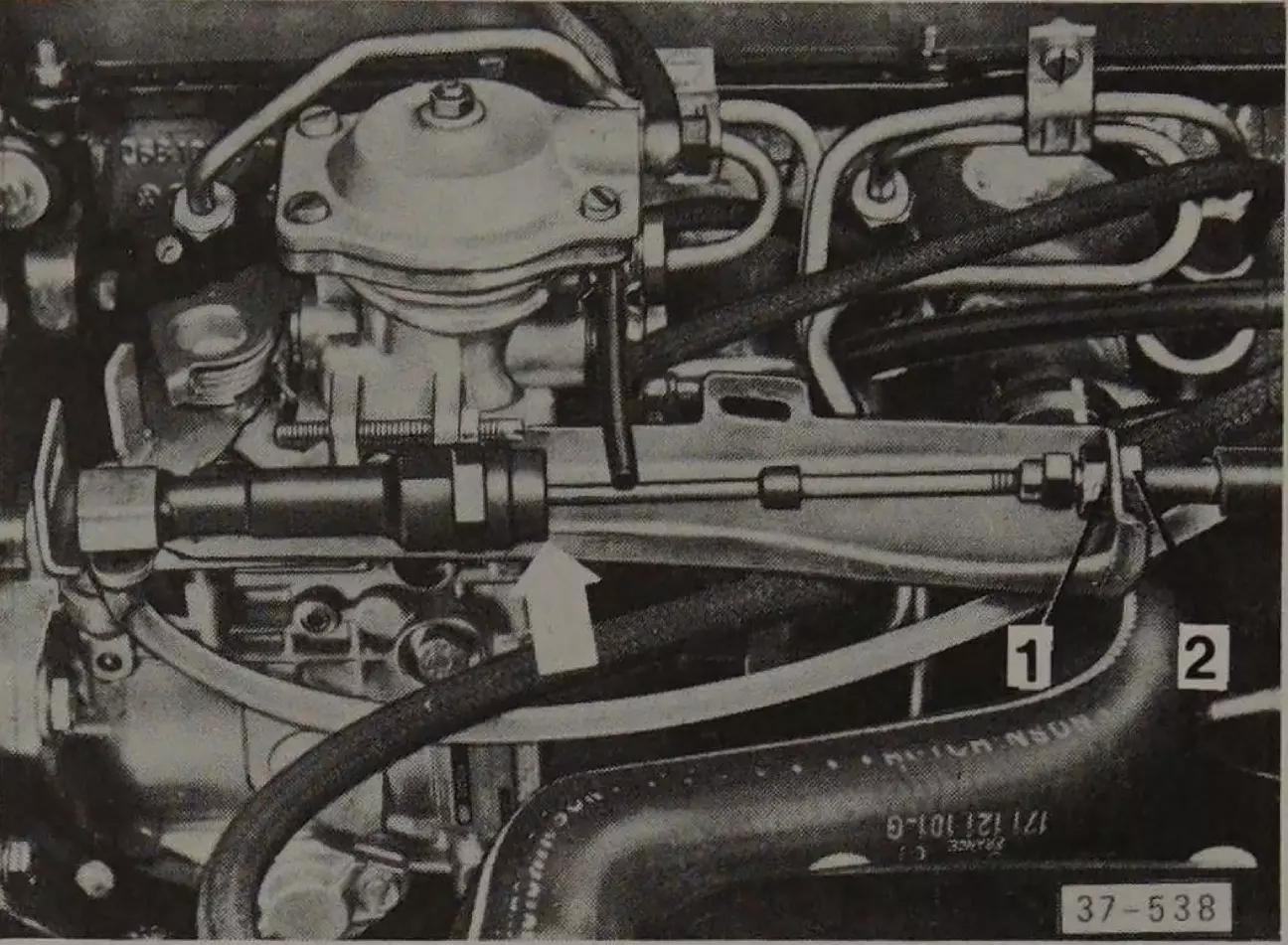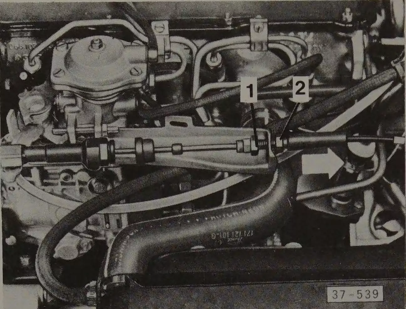 2. Ослабьте регулировочную гайку троса педали акселератора и отсоедините трос от рабочего рычага: