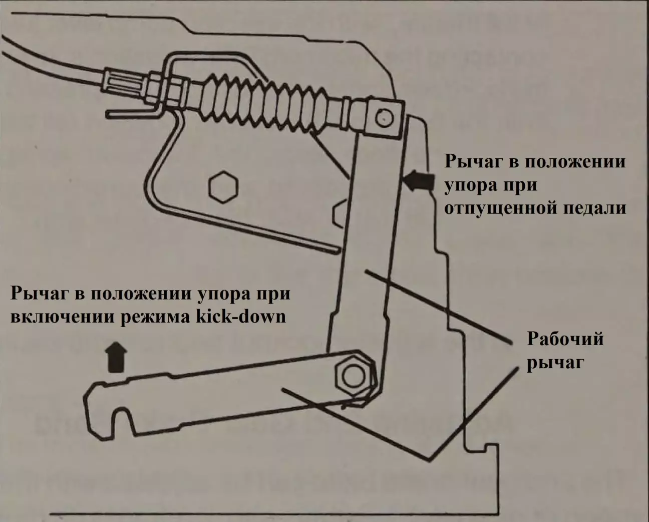 6. Зацепите наконечник троса акселератора за рабочий рычаг трансмиссии. При полностью выжатой педали акселератора в положении kick-down вращайте регулятор троса так, чтобы рычаг трансмиссии едва касался упора kick-down.