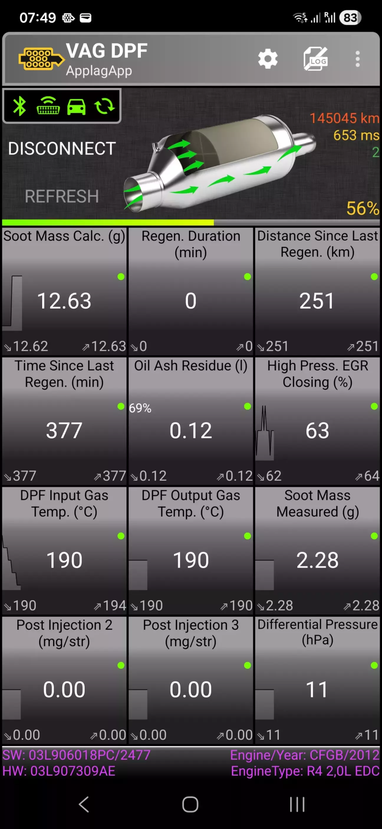 Реальний пробіг між регенераціями: На новій прошивці при пробігу 251 км рівень розрахункової сажі становить лише 12.63 г. Це означає, що за поточного темпу регенерація відбудеться приблизно на 450–500 км.