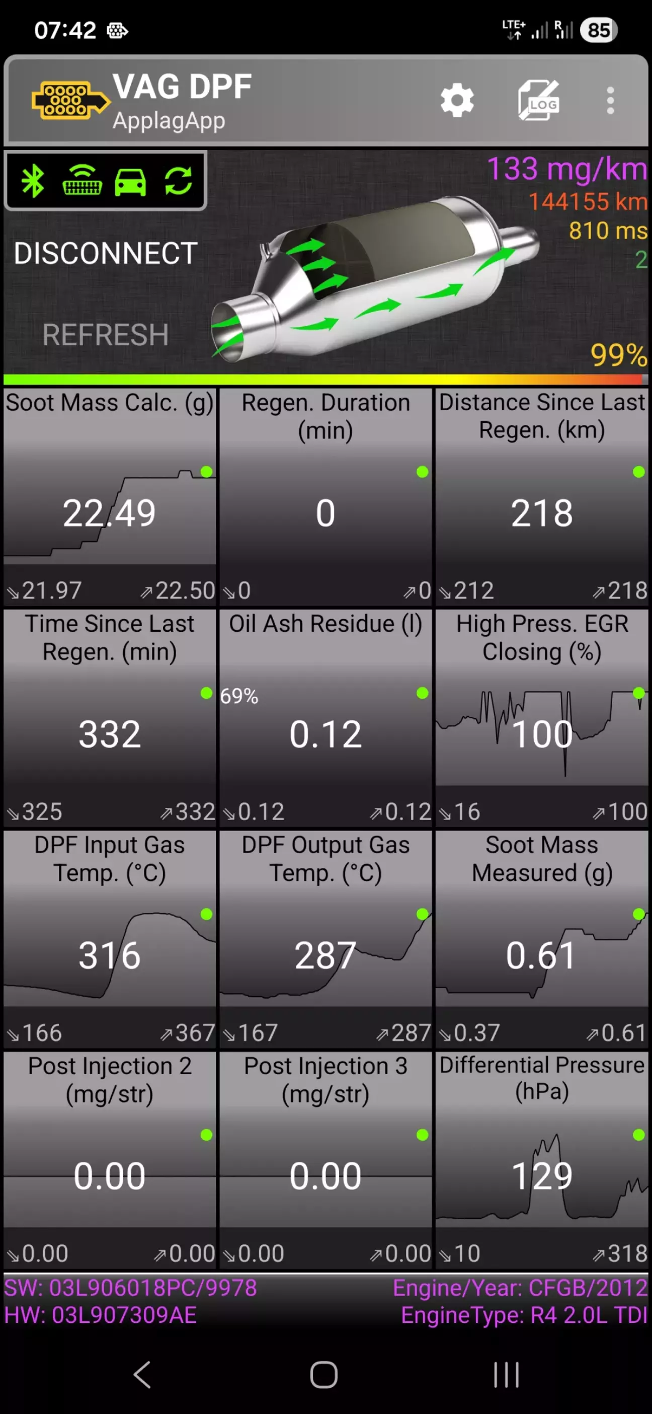 Оскільки я слідкую за DPF, мені цікаво, що фактично дав відкат на стару прошивку. Так от, 2 скріни. Перший, як бачимо в нижньому лівому кутку версія софту 9978, пробіг після останньої регенерації 218 км. Сажі вже 22,4 грами, от-от почнеться регенерація. І так було постійно +/- 30 км.
