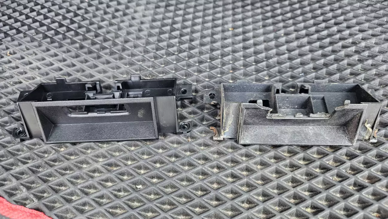 Зламався пластмасовий кронштейн, який тримав кнопку відкриття багажника. Історія така сама, як і з правим дзеркалом заднього виду. Він був зламаний у минулого власника та заклеєний звичайним супер клеєм. Ну і на морозі воно звичайно не витримало та просто відвалилось рівно по місцю склейки. Одразу замовив новий, дочекався поки приїде і поки стане тепліше, щоб при розборі ще щось не тріснуло з пластикових деталей.