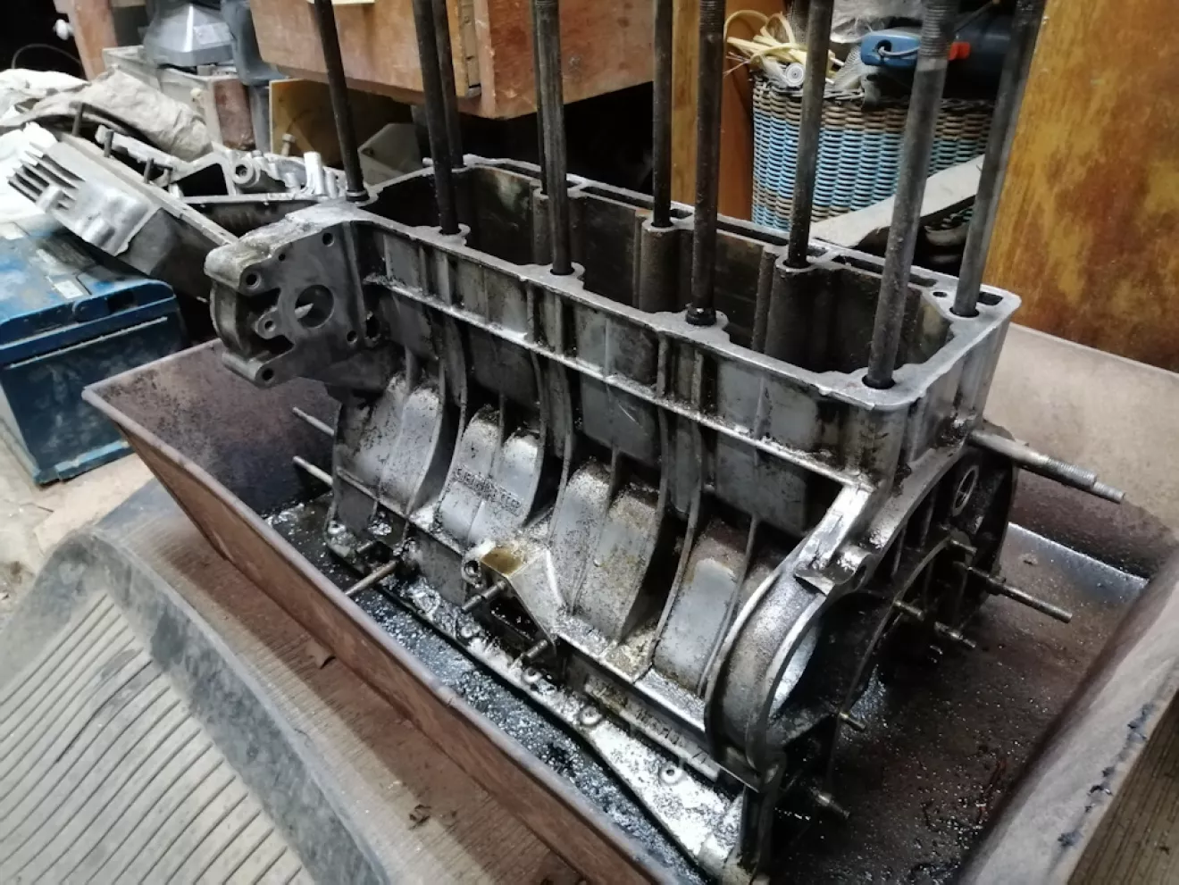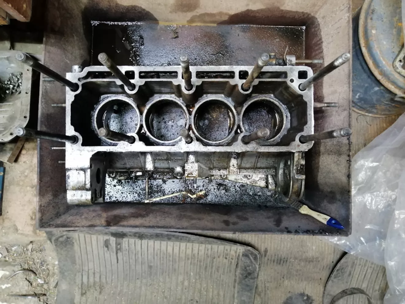 Дефектовал двигатель, снял гильзы и все навесное. Итак первая стадия — очистить блок от годовых отложений грязи снаружи и масленного нагара внутри. Чистить начал сначала изнутри дрелью с насадками (щётками) и бензином, процесс конечно нудный и медленный. Продолжение следует…