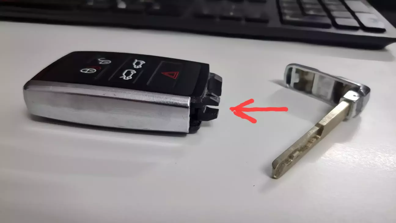 Вийняли лезо, далі нам необхідно роз'єднати корпус відщолкнувши задню кришку ключа. Для цього необхідно взяти лезо ключа, вставити його між двома спеціальними виступами на корпусі і провернути до моменту роз'єднання панелей: