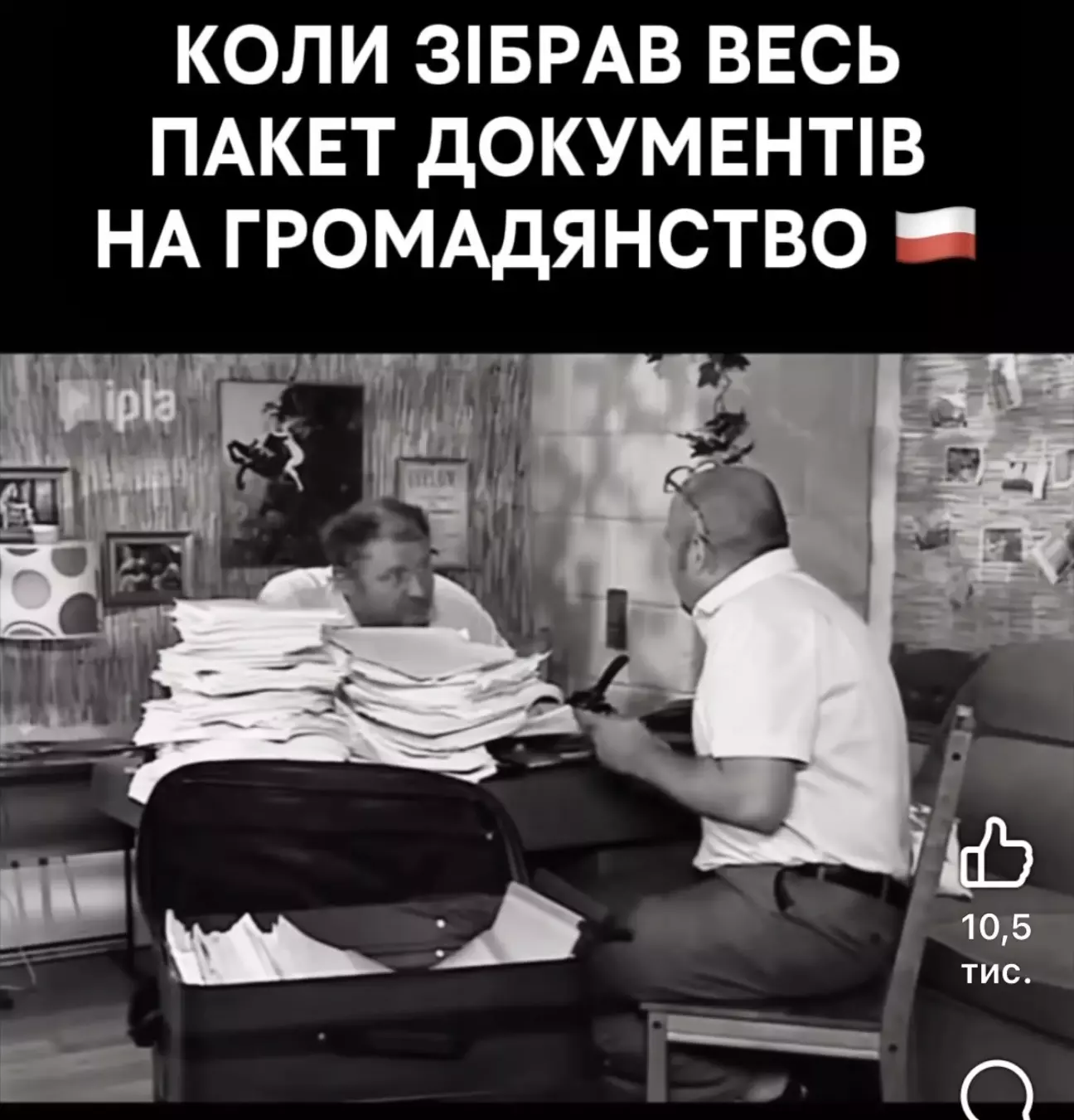В мережі давно завірусилося гумористичне відео про подачу документів на отримання громадянства в Польщі. Там після виконання всіх умов і підписання різнокольоровими олівцями і кровʼю сотні паперів десяткою мов людині не вистачило пилу для підписання останнього документу. Інспектор сам зробив дірку у його торті, щоб той пил висипався і вдоволено промовив улюблене «що ж ви не підготувалися?».