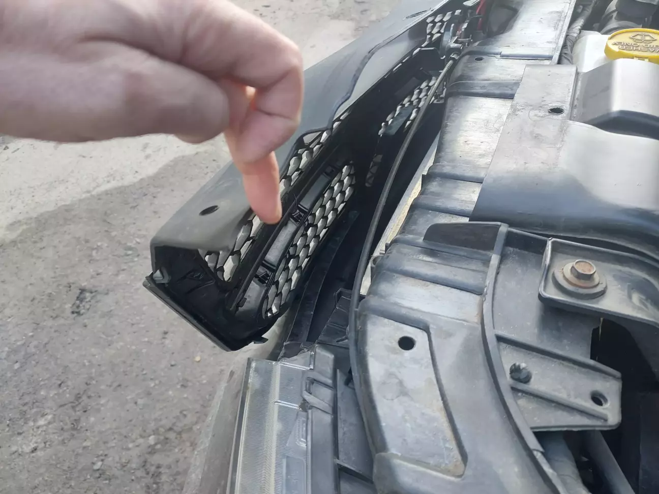 Підважуємо з правої сторони решітку і від'єднуємо її від бамперу на відстань щоб можна було просунути руку, ставимо емблему і фіксуємо її з середини.