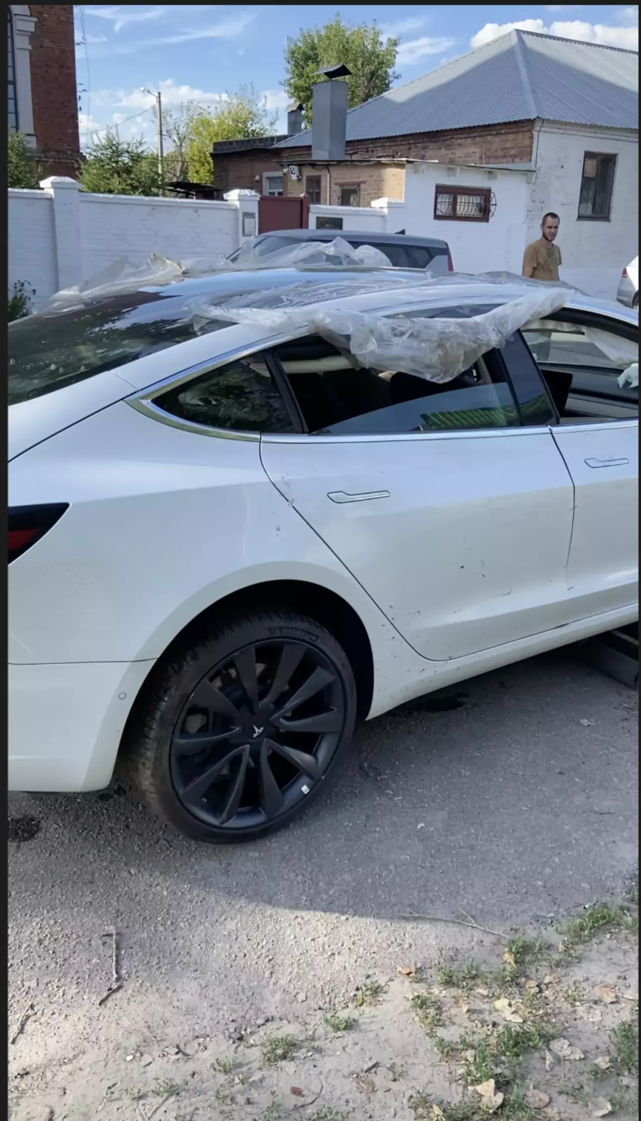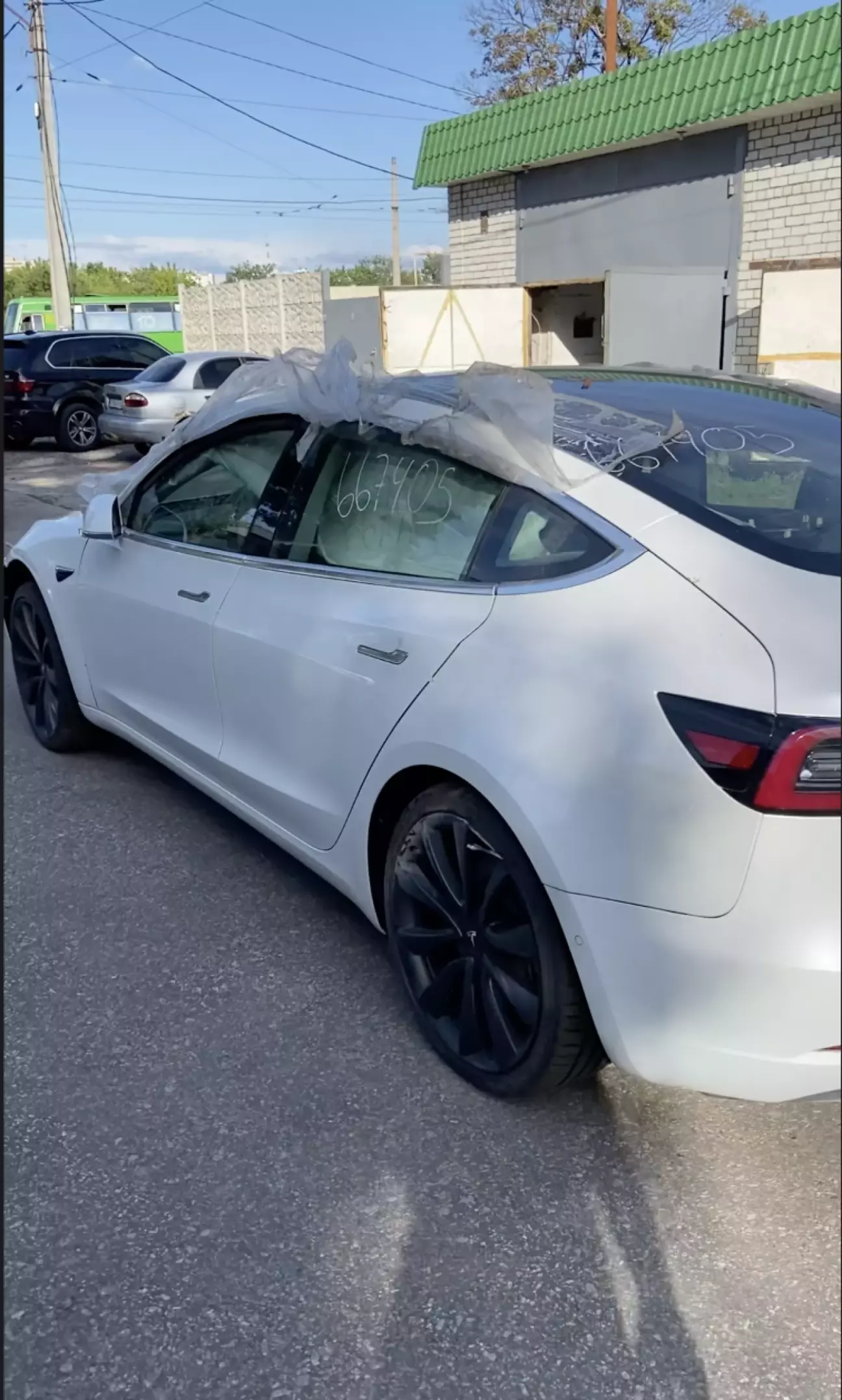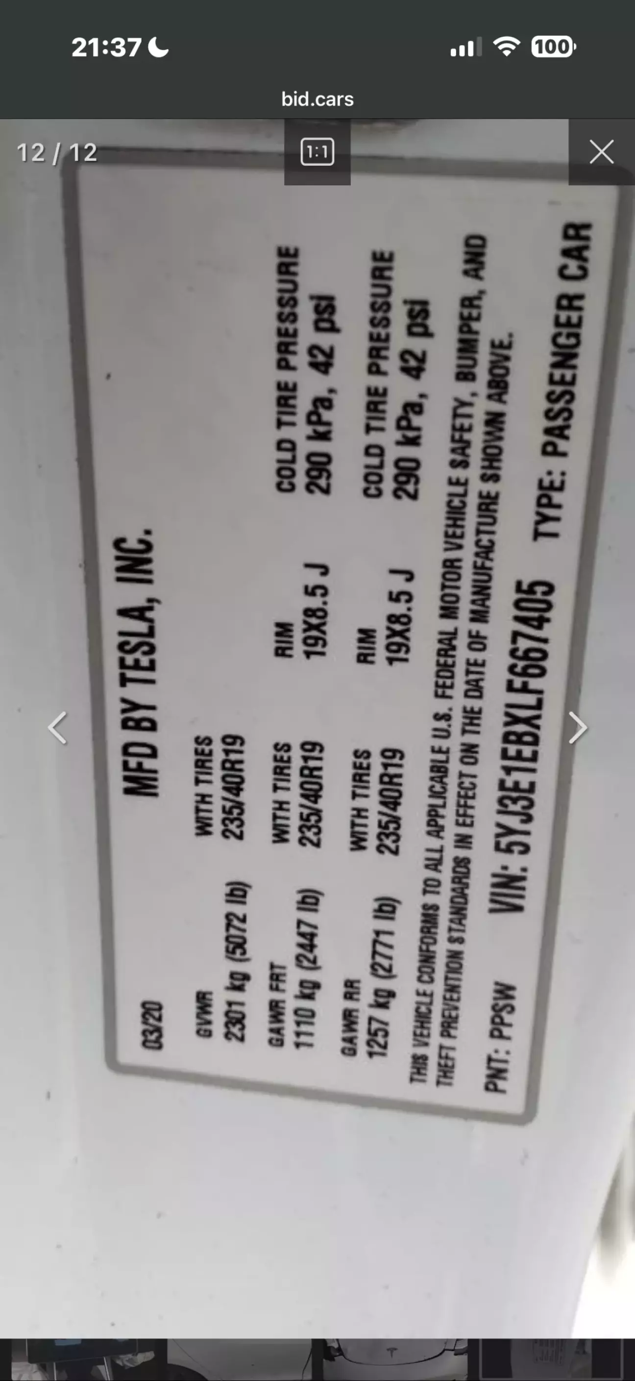 і було прийнято рішення купити за здалегіть колесо , по фото на аукціоні на кузові на табличці було видно що авто з конвееру виїхало на R19 дисках, тому і було куплено 1 колесо R19 . І ось Tesla на лафеті стоїть та чекае коли її спустять , я без задньої думки їду беру колесо кажу хлопцям ось колесо давайте ставимо та спускаемо, ну поставили спустили, думаю пройдусь гляну як там інші колеса в якому стані, ну стан був гарним тільки розмір не той , на машині стоять R20 😃.